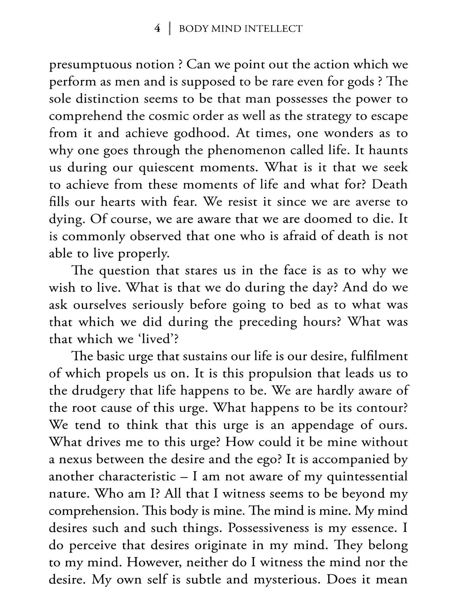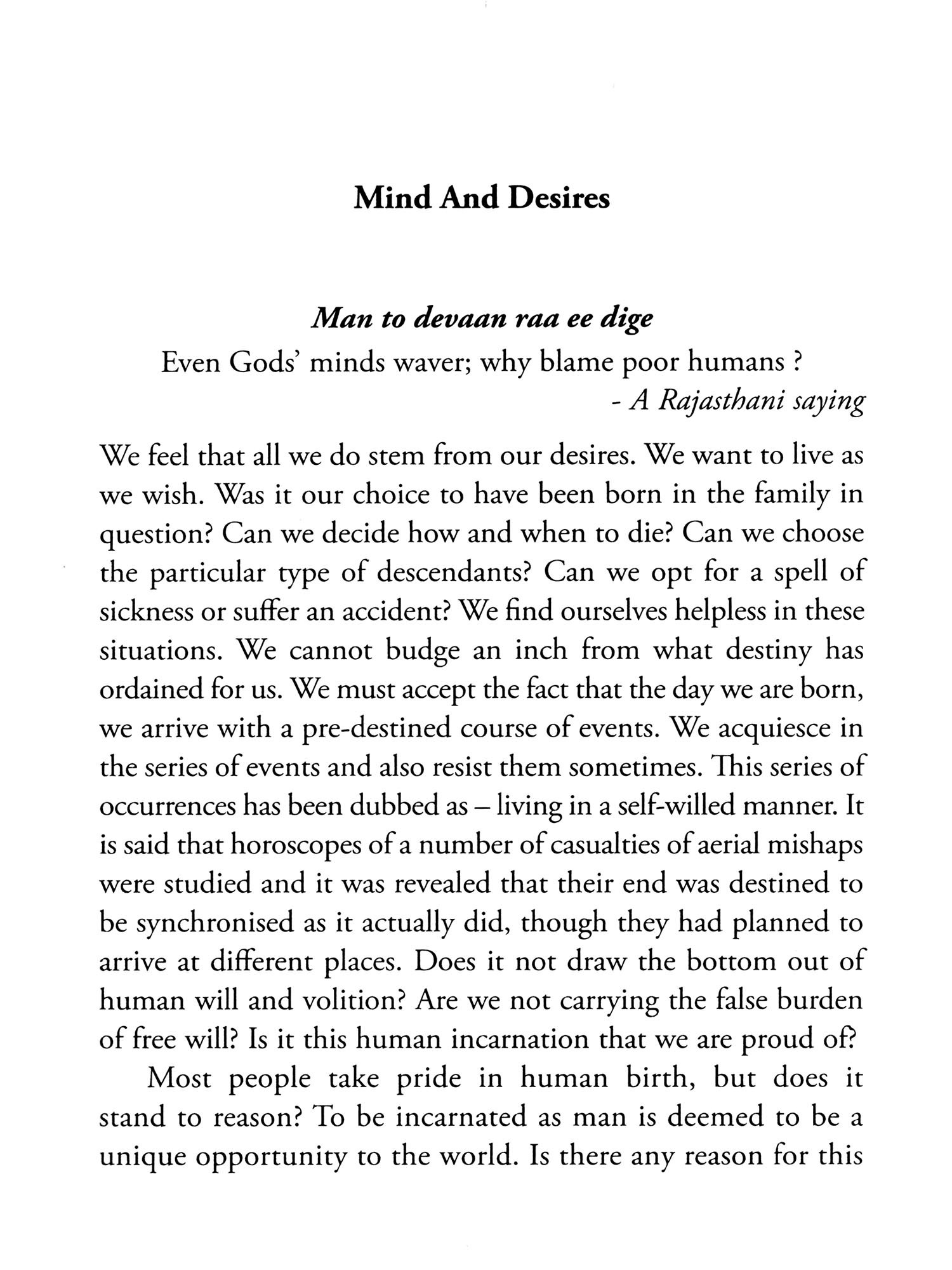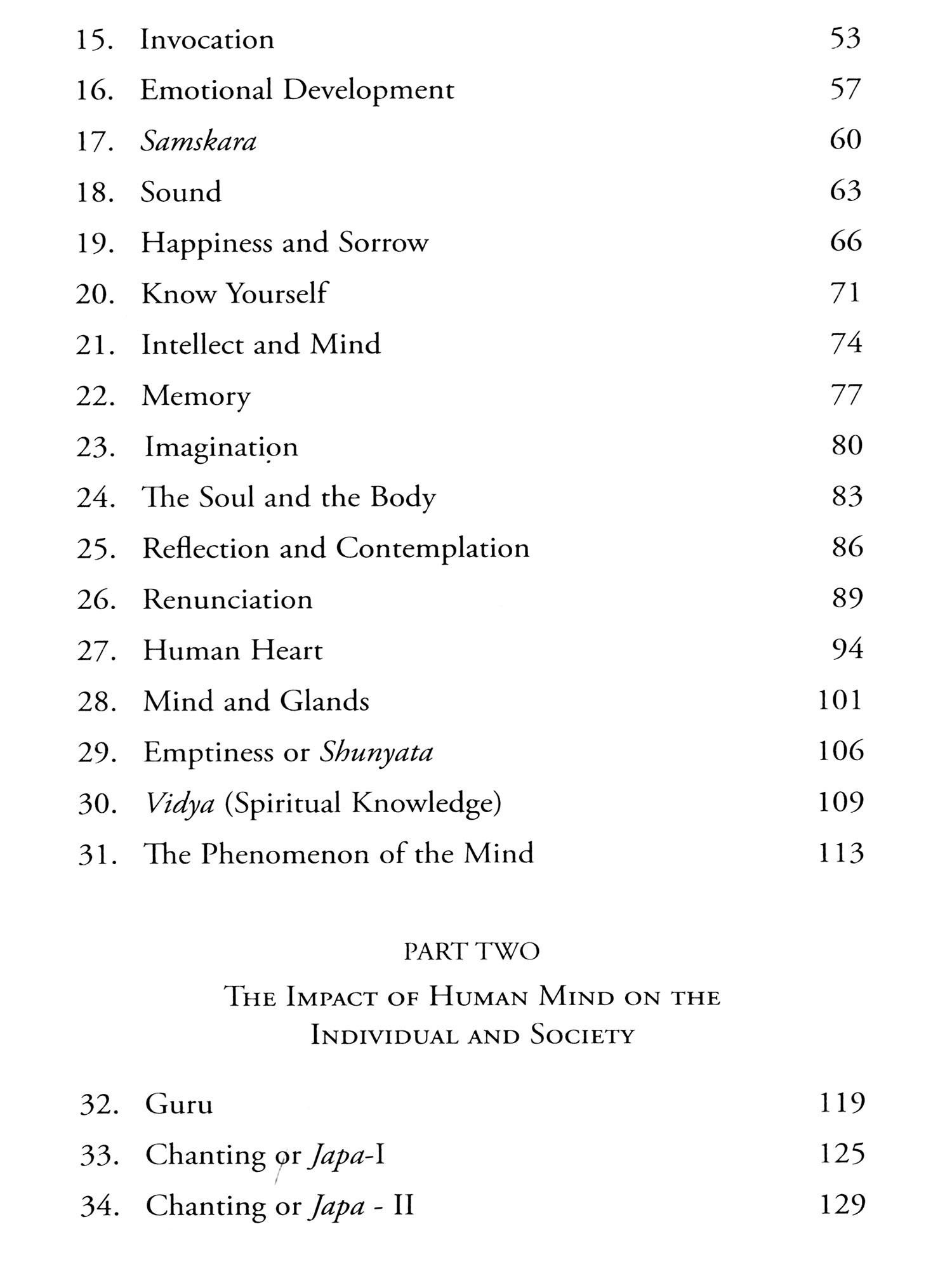 Mind is the basis and source of our life. Where there is mind, there is desire. If there is desire, we have an activity, an aim, work and life itself. What is mind? How are its nature, function and environment created? Do creatures other than man also have mind? Man has the faculty of thinking. Do other creatures also possess this faculty? Can they think like human beings? Do they understand the functioning of the mind? Man is careful about dharma and the goal of his life. All the scriptures have been written for him. Most people have a common aim, i.e. unravelling the mystery of the mind.