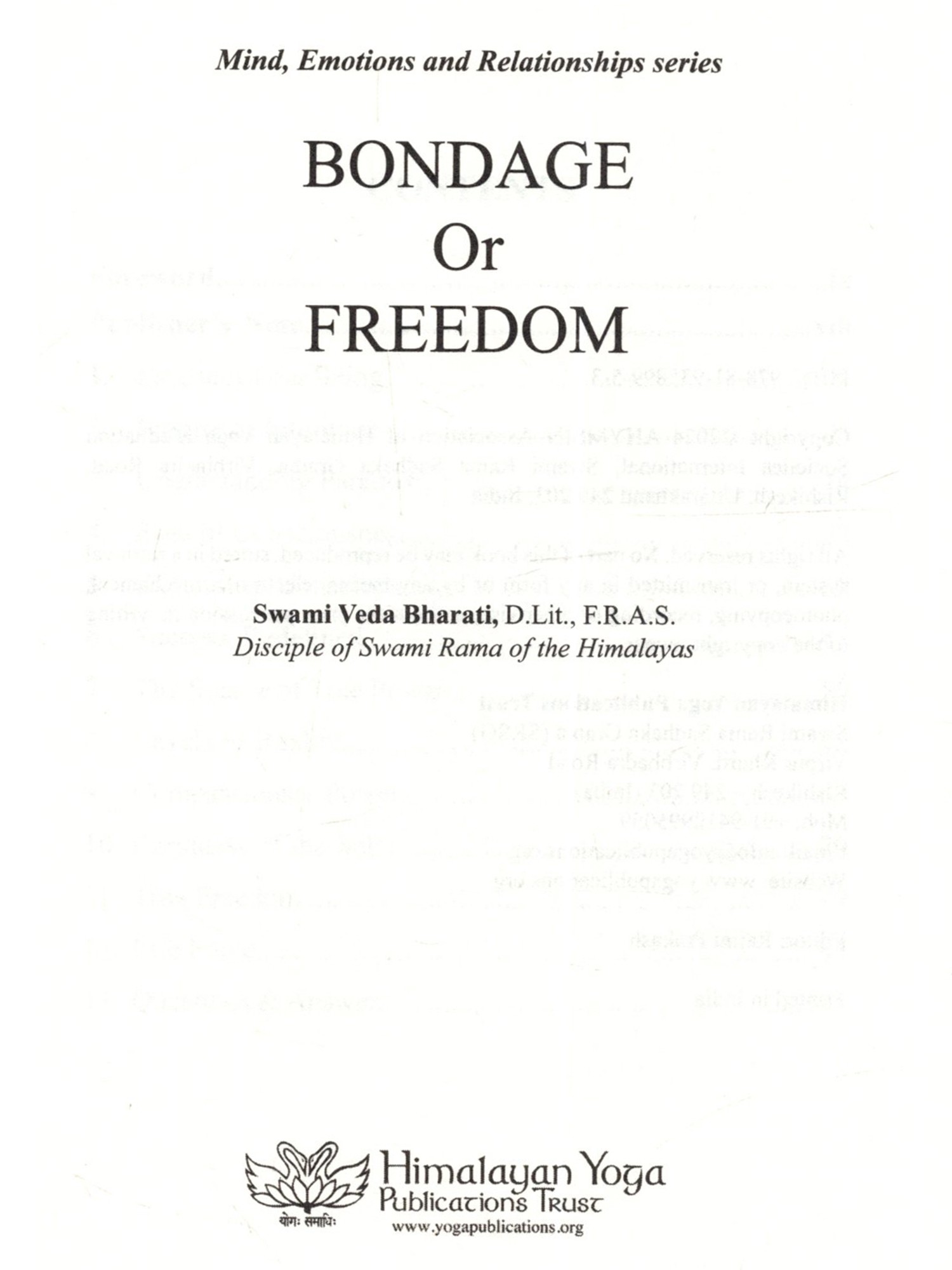 Bondage Or Freedom Swami Veda Bharati unravels the mysteries of the mind as we uncover the essence of freedom through introspection and recognition of our divine nature. He highlights the profound impact of our decisions in shaping our lives and emphasises personal responsibility in transcending the ignorance that obscures one's true essence. The book invites us to explore the idea that we are both the architects and the navigators of our own destiny. It is a compilation of Swami Ji's enlightening lectures exploring the themes on 'how do we bind ourselves; how do we free ouselves'. Offering insightful guidance this book harmoniously complements Swami Ji's other works on the Mind, Emotions, and Relationships series, making it an essential reading for all who seek self-discovery and inner purification.