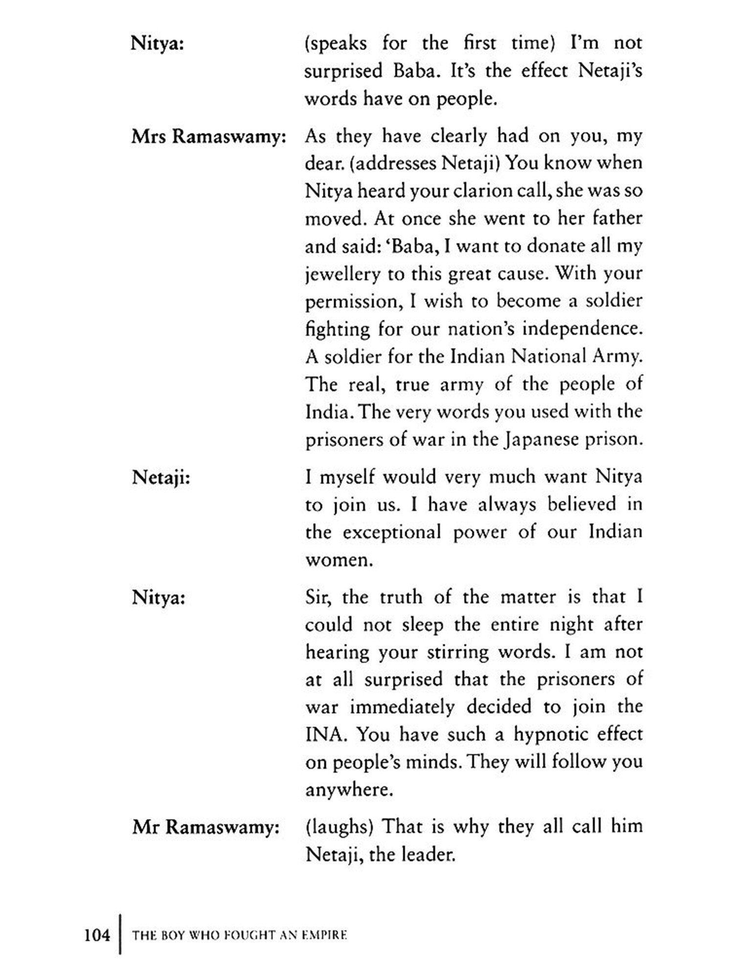 Dramatic incidents in Netaji's life are interspersed with scenes in which five children react to his life, struggles and achievements in terms of their own identities. This fabulous device gives this unique and exciting play a contemporary feel, adding to the modern-day relevance of his life.