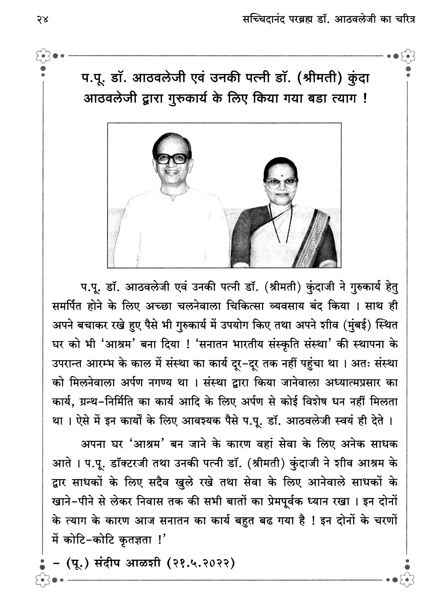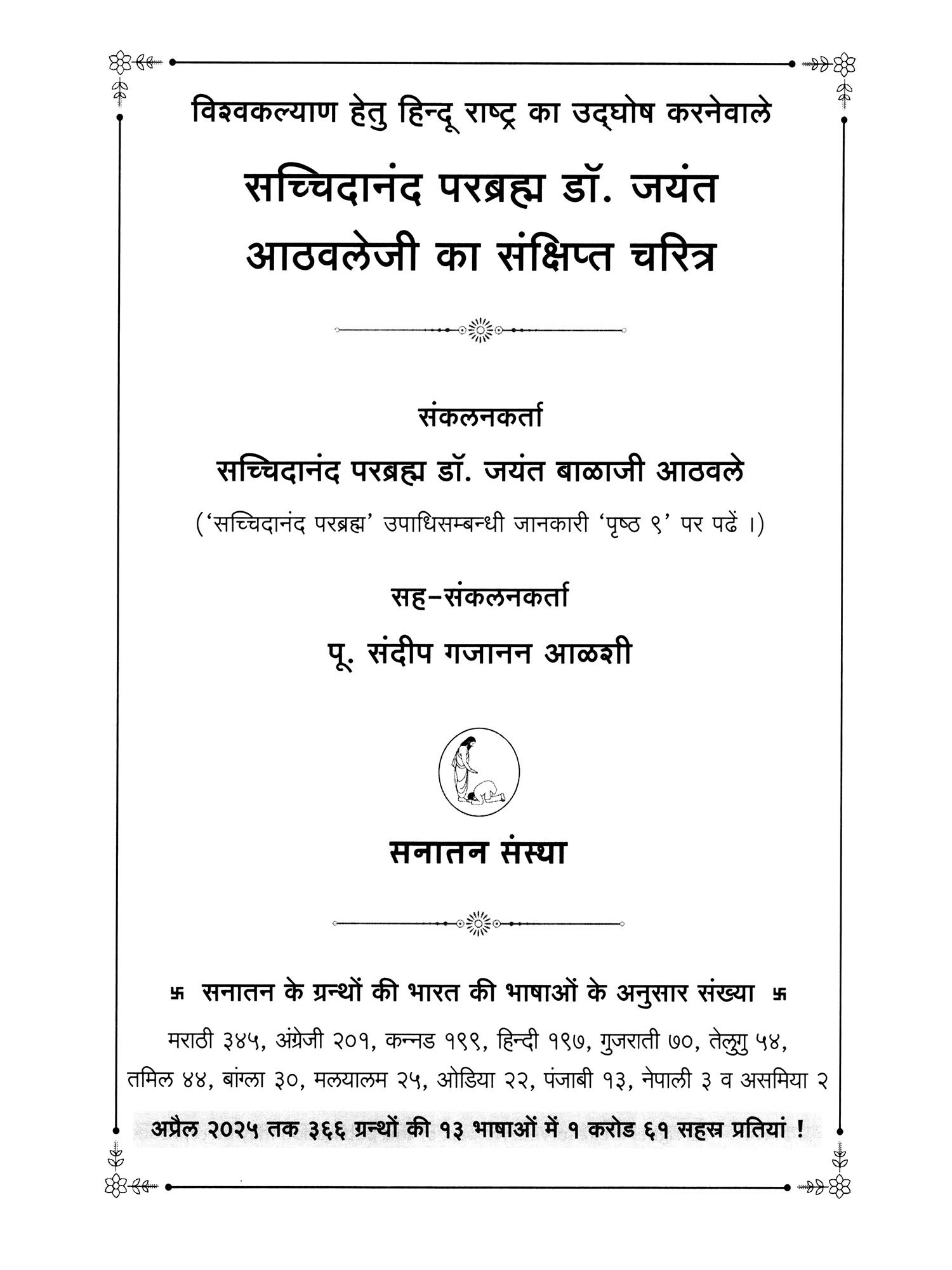 सूर्य का अवतरण अंधकार का नाश करता है एवं चन्द्रमा का अवतरण आह्लाद प्रदान करता है। ६ मई १९४२ को काल ने एक महापुरुष को जन्म दिया। इस महापुरुष का जन्म भी सूर्य के समान अधर्मरूपी अंधकार का नाश कर सनातन धर्मराज्य (ईश्वरीय राज्य, हिन्दू राष्ट्र) की स्थापना करने के लिए और चन्द्रमा के समान साधकों एवं भक्तों पर गुरुकृपा का आह्लाददायी वर्षाव कर उन्हें मोक्ष प्रदान करने के लिए हुआ। इस महापुरुष का, अर्थात सच्चिदानंद परब्रह्म डॉ. जयंत बाळाजी आठवलेजी (गुरुदेवजी) का यह संक्षिप्त चरित्र ! 'अखिल मानवजाति को गुरुदेवजी का माहात्म्य ज्ञात हो तथा उनकी सीख के अनुसार साधना कर सब आनन्दित हो', यह इस ग्रन्थ का प्रधान हेतु है।