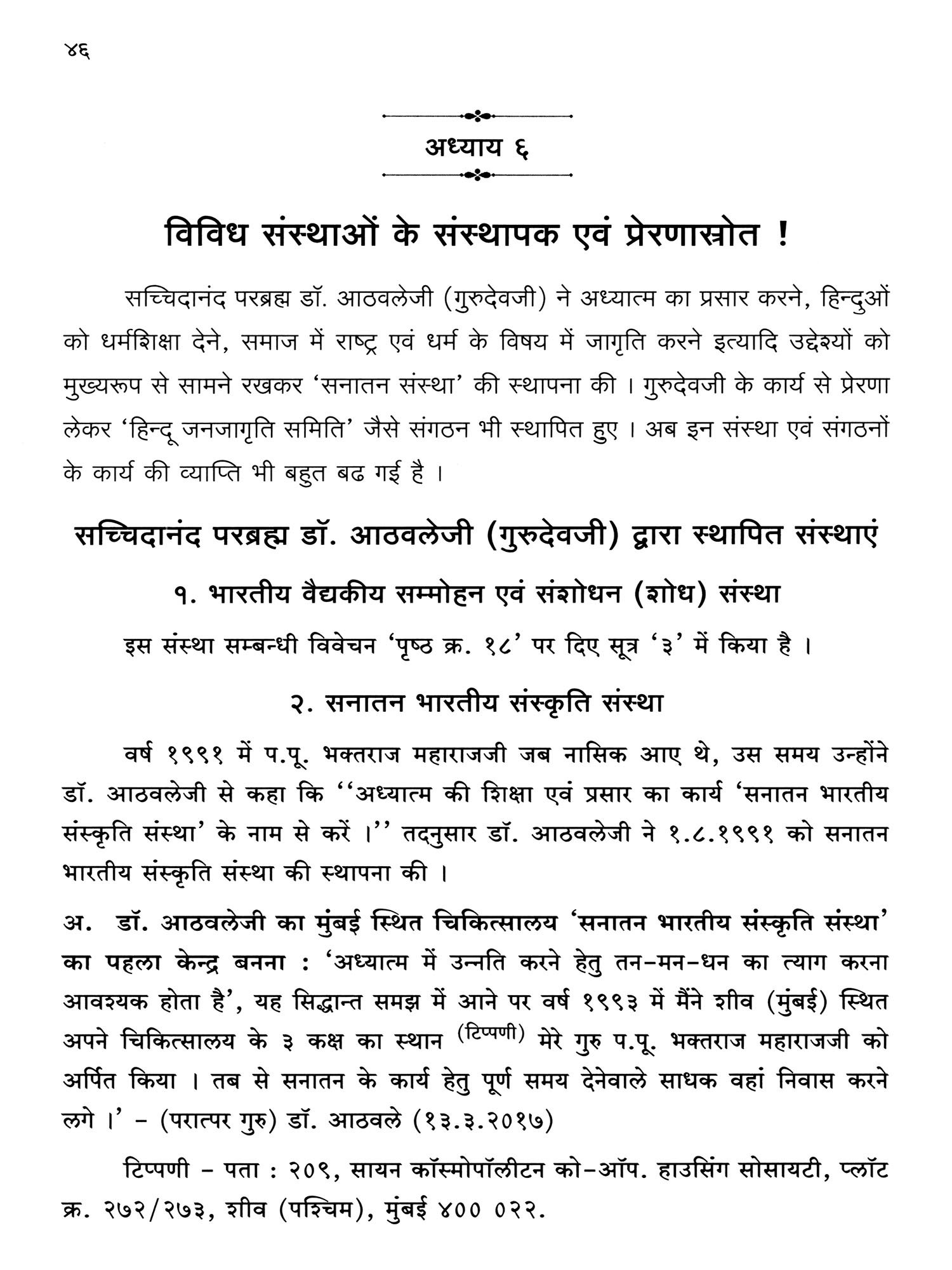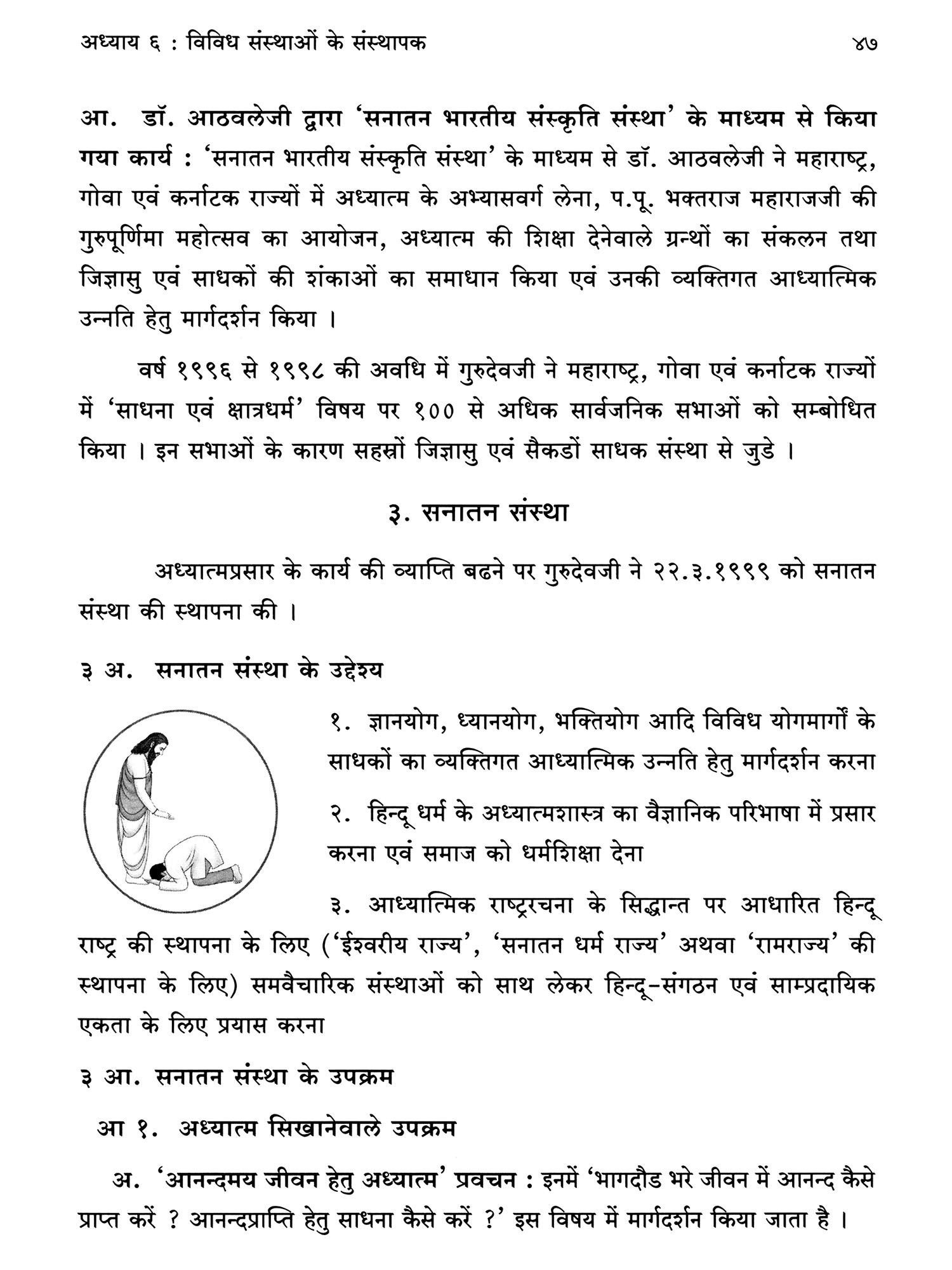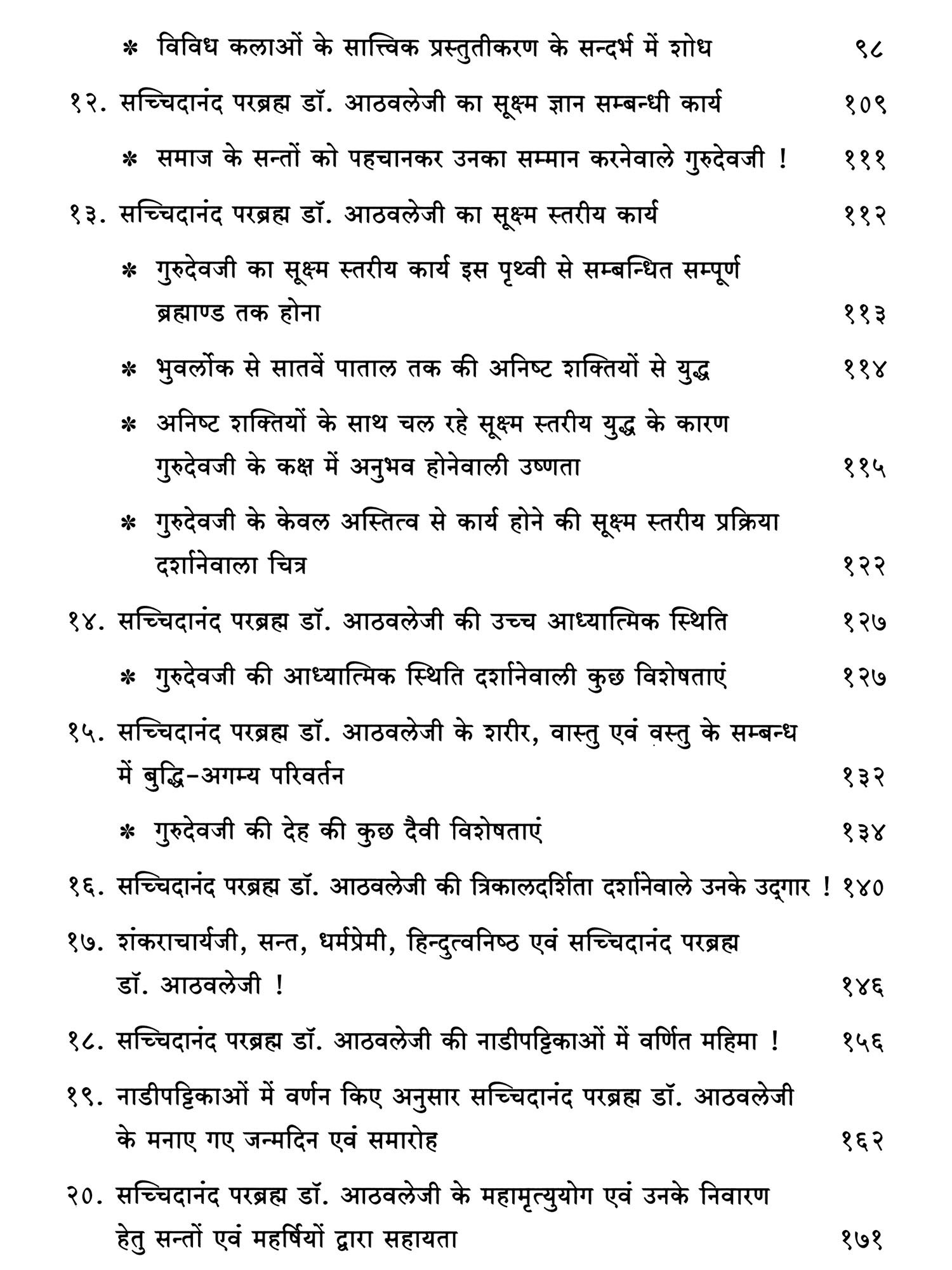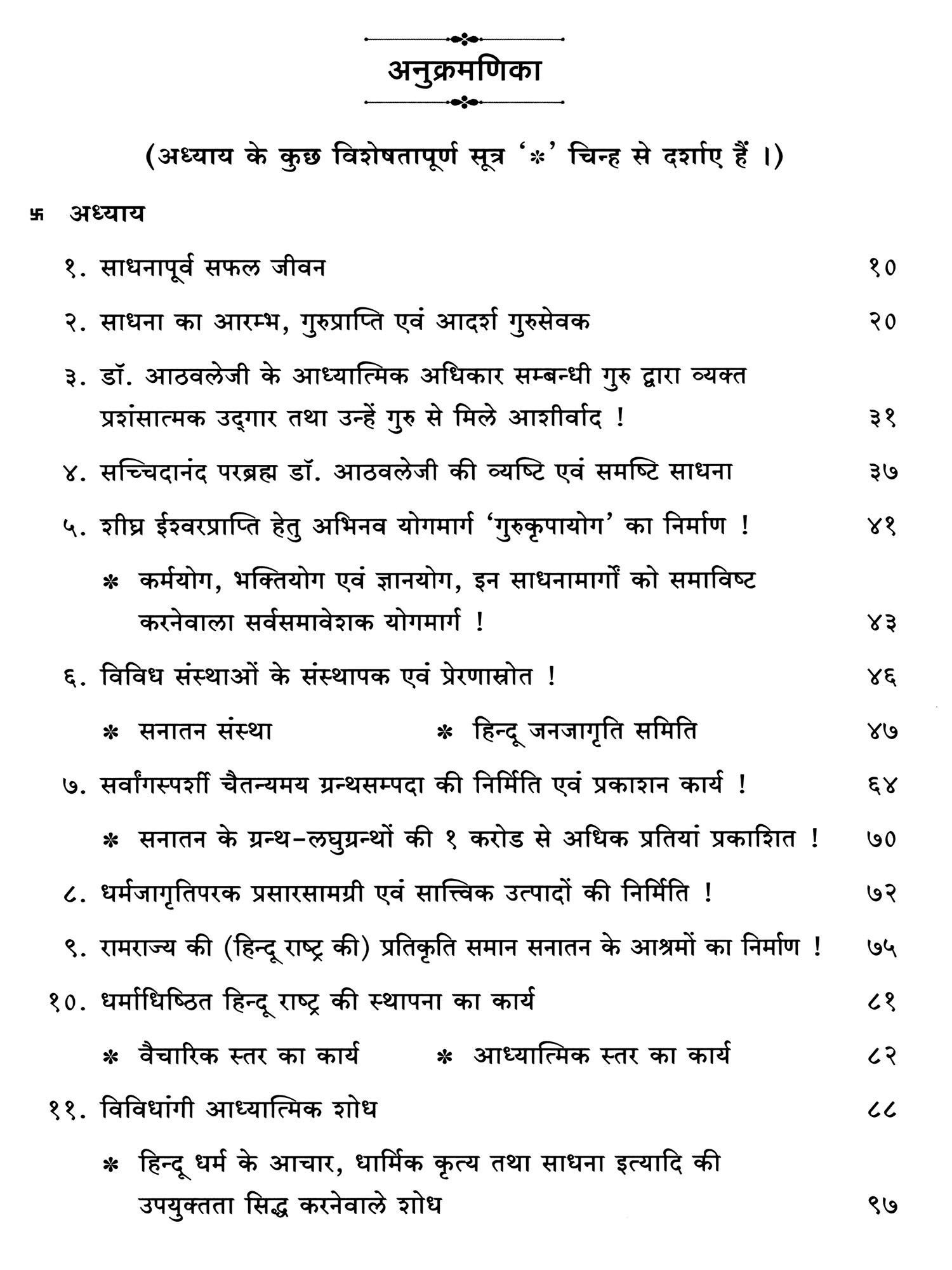इसके साथ ही गुरुदेवजी ने साधकों को शीघ्र ईश्वरप्राप्ति होने के लिए 'गुरुकृपायोग' नामक अभिनव योगमार्ग का निर्माण, आश्रमों का निर्माण कार्य जैसे विविध कार्यों का सारांश इस ग्रन्थ में लिया गया है। गुरुदेवजी के इन सभी कार्यों की फलश्रुति क्या है ? गुरुदेवजी के मार्गदर्शन के अनुसार साधना कर १०.४.२०२५ तक १३१ साधक सन्त हुए हैं एवं १,०५३ साधक सन्त बनने के मार्ग पर हैं! वैसे ही सहस्रों साधक राष्ट्र एवं धर्म के कायों में अग्रणी भी हैं। विविध साम्प्रदायिक, धर्मप्रेमी, राष्ट्रप्रेमी, हिन्दुत्वनिष्ठ आदि को भी गुरुदेवजी के ये सभी कार्य निश्चित रूप से प्रेरक एवं मार्गदर्शक सिद्ध हो रहे हैं।