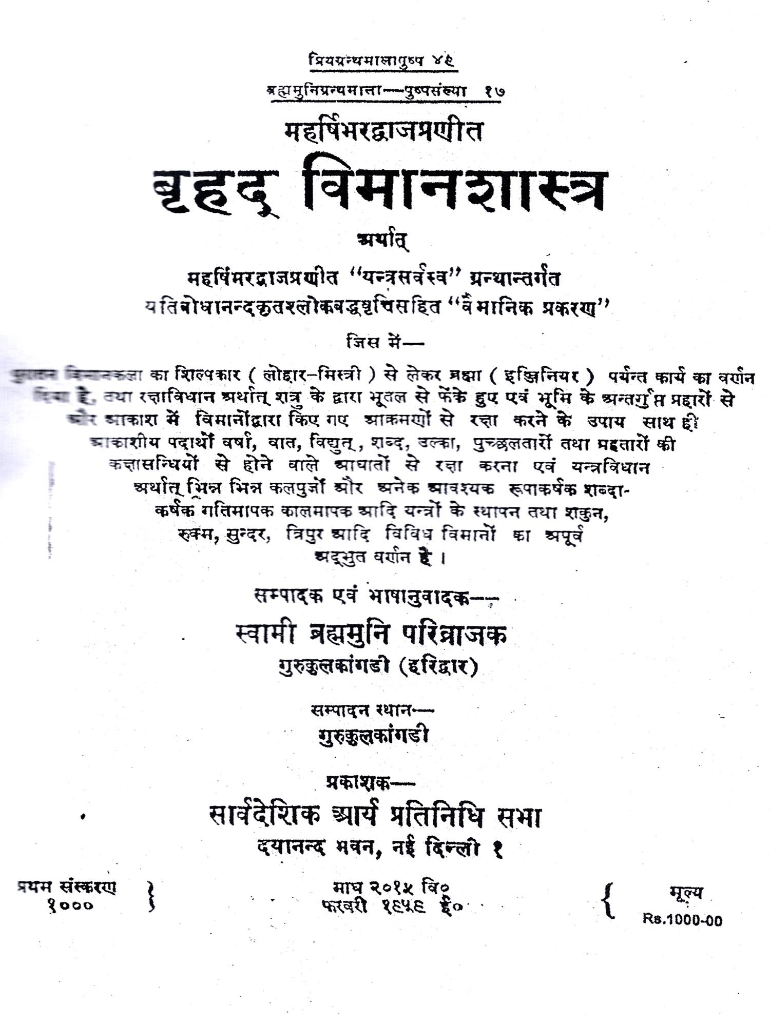 बृहद् विमानशास्त्र: Brihad Vimanasastra- Compiled by Maharishi Bharadvaja