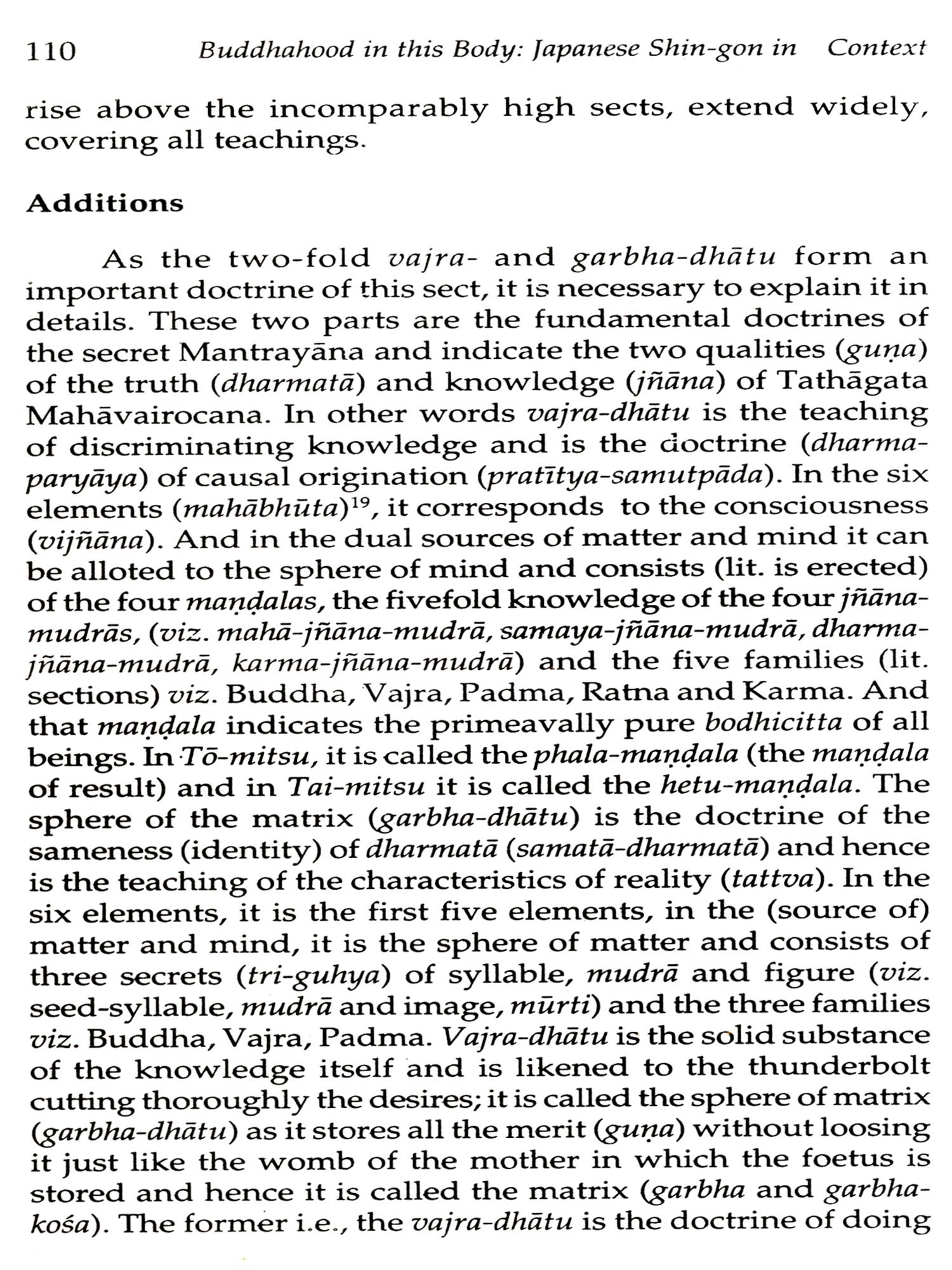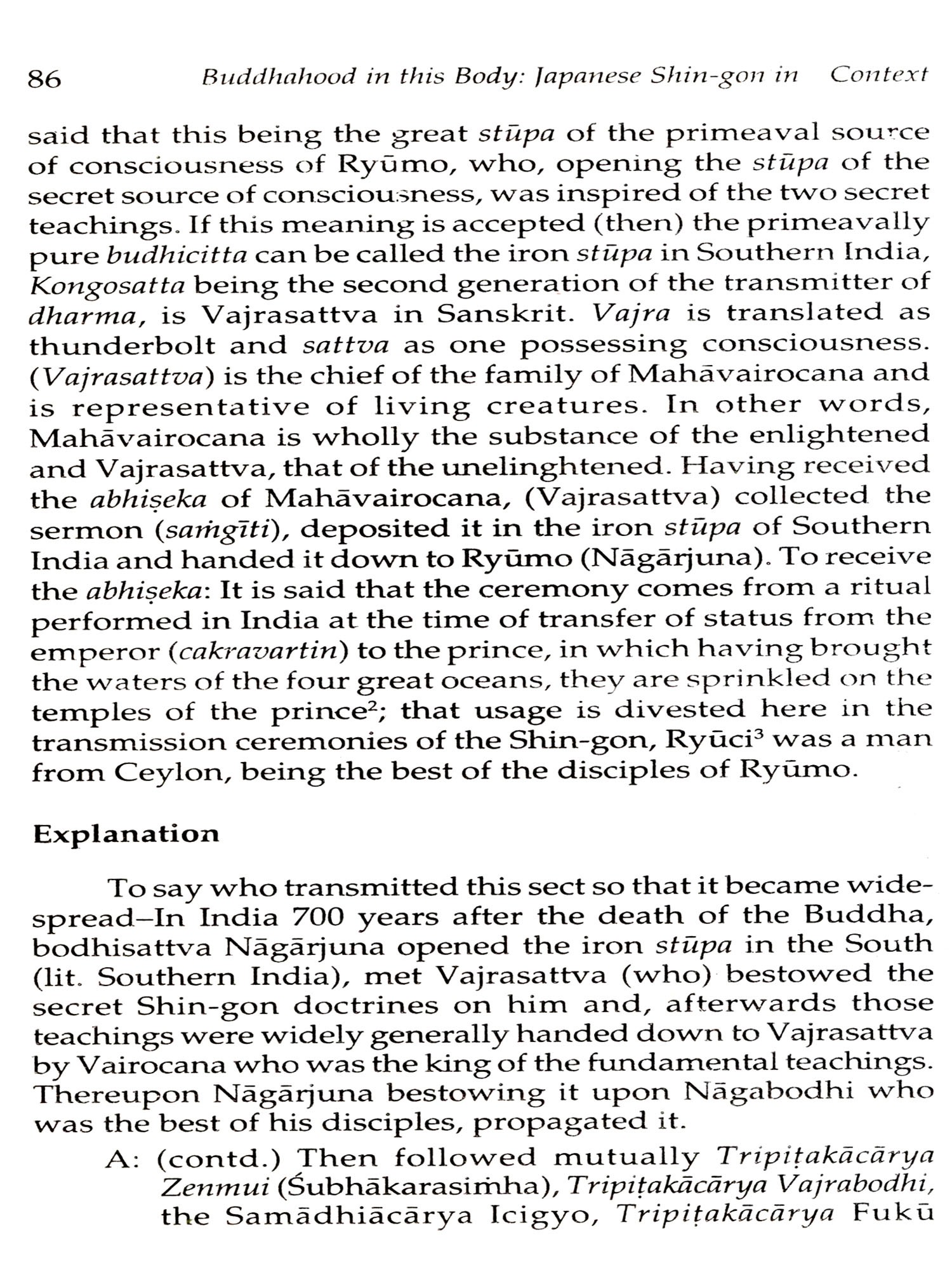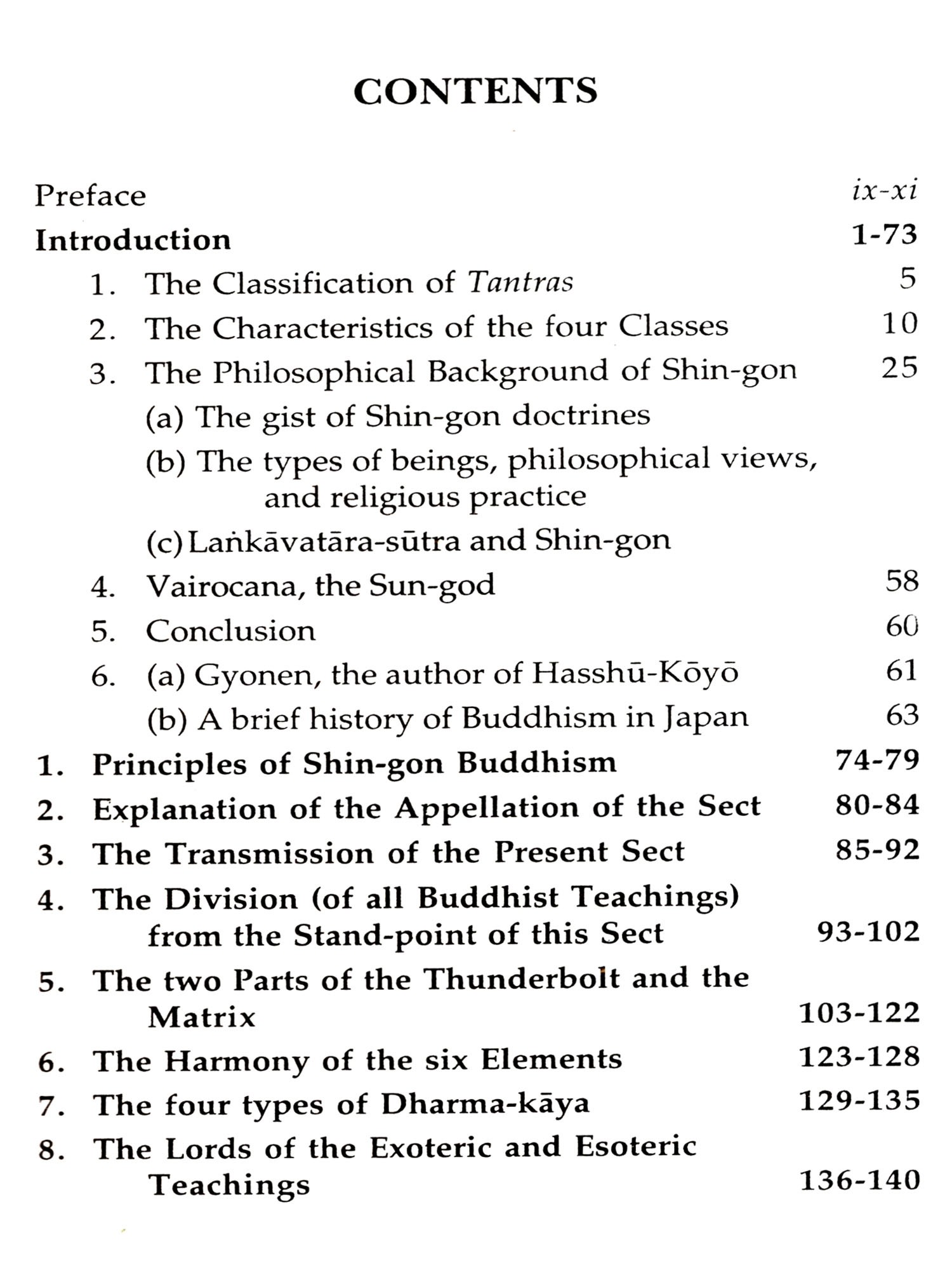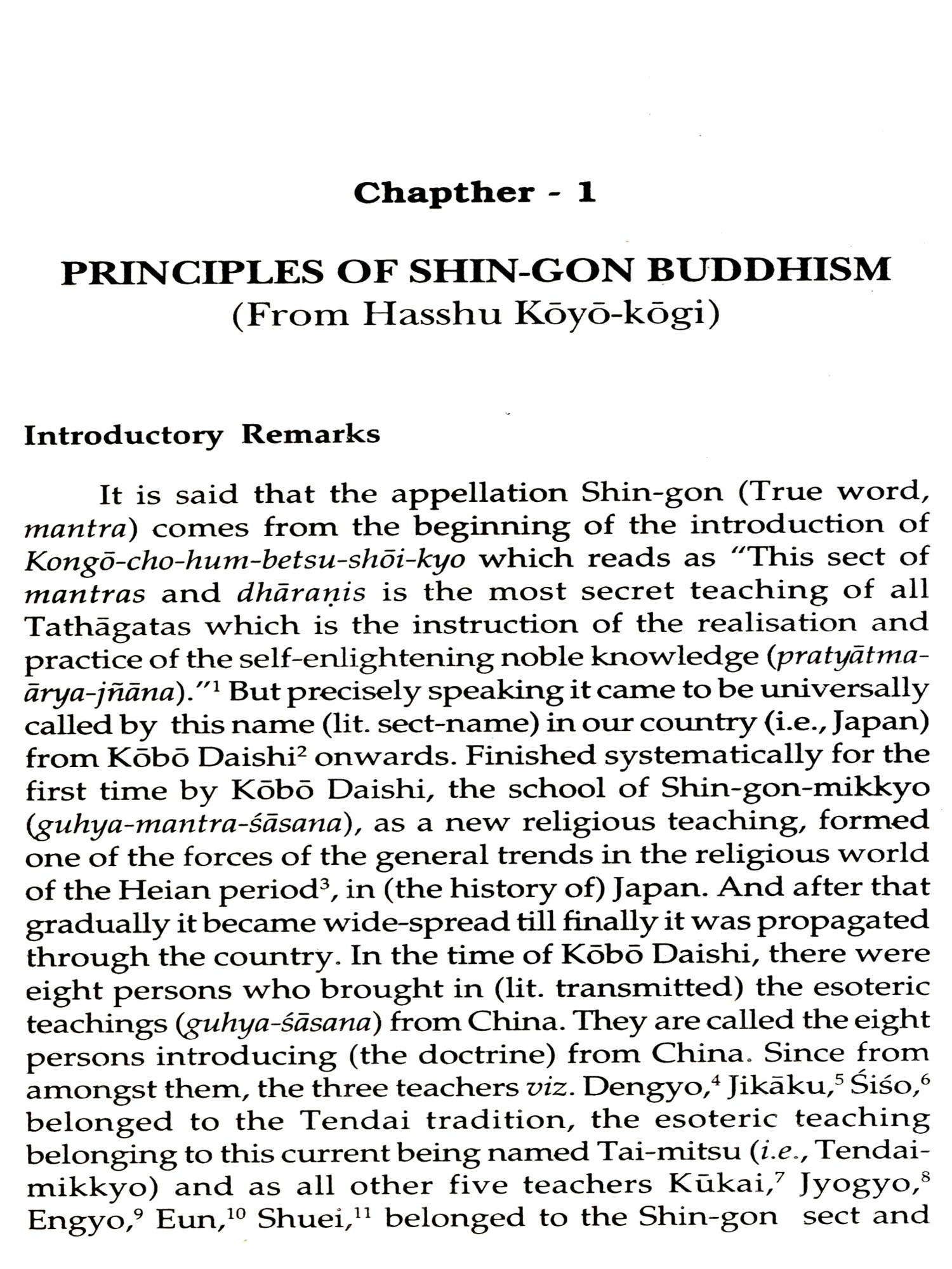 The translation of chapter on Shin-gon of (the eighth school in succession) the Hassho-koyo-kogi by Gyonen was undertaken by me at the University of Tokyo, Tokyo, in 1964 as a Government of Japan Scholar in the Intergovernmental Exchage Programme. It was undertaken at the suggestion of Professor Akira Hirakawa, then Reader in the Department of Sanskrit Literature and Indian philosophy. The procedure that we set up was that we used to read it together and later I used to translate it into English, which took a little more than two years. On the completion of the translation, Professor Hirakawa checked it. As he decided to write the foot-notes, I wrote the introduction. As I left Japan in 1966 it became difficult to discuss matters personally. Both of us were involved in our respective academic pursuits which caused delay.