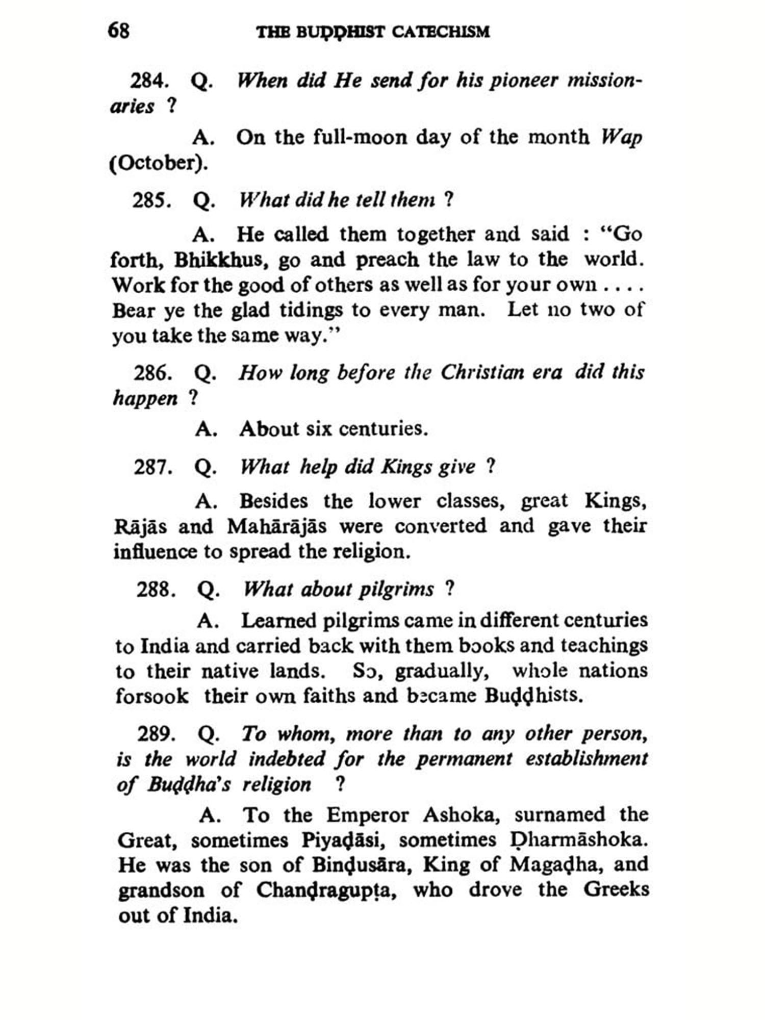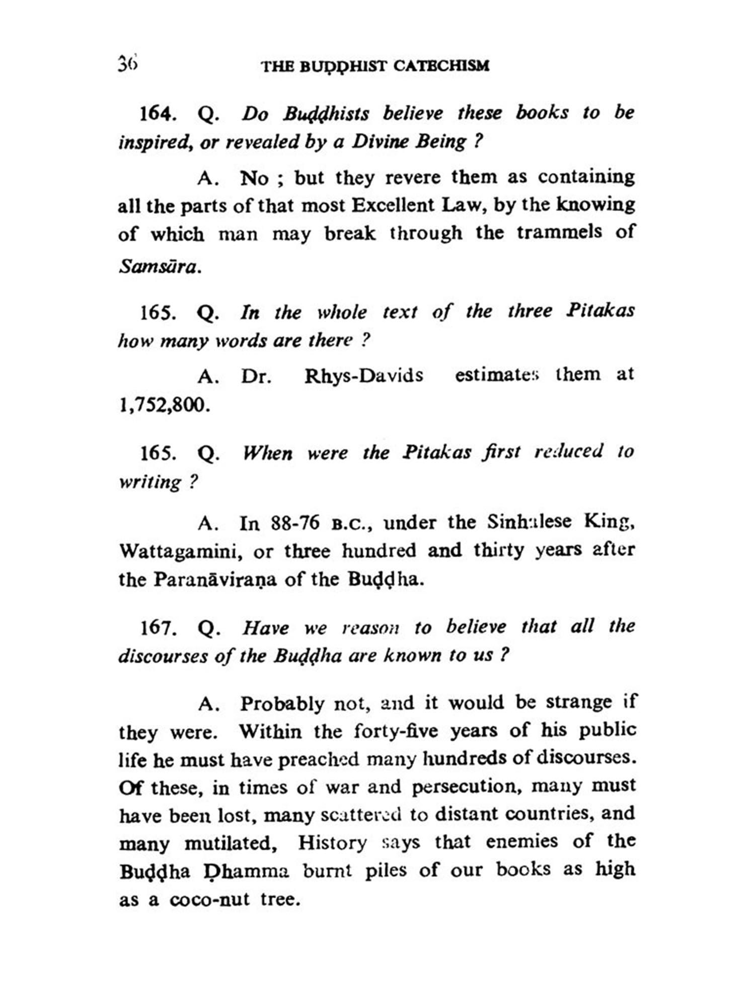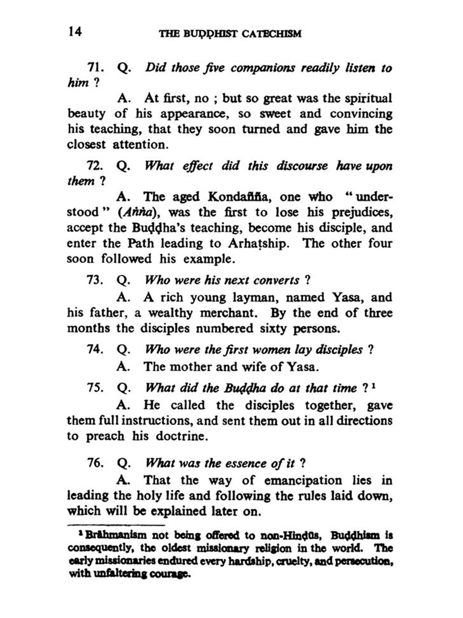 I am afraid we shall have to wait long for this help to come from the Buddhist bhikkhus, almost the only learned men of Ceylon; at least I have not been able during an intimate intercourse of twenty-two years, to arouse their zeal. It has always seemed to me incongruous that an American, making no claims at all to scholarship, should be looked to by the Sinhalese to help them teach the dharma to their children; and as I believe I have said in an earlier edition, I only consented to write THE BUDDHIST CATECHISM after I had found that no bhikkhu would undertake it. Whatever its demerits, I can at least say that the work contains the essence of some 15,000 pages of Buddhist teaching that I have read in connexion with my work.