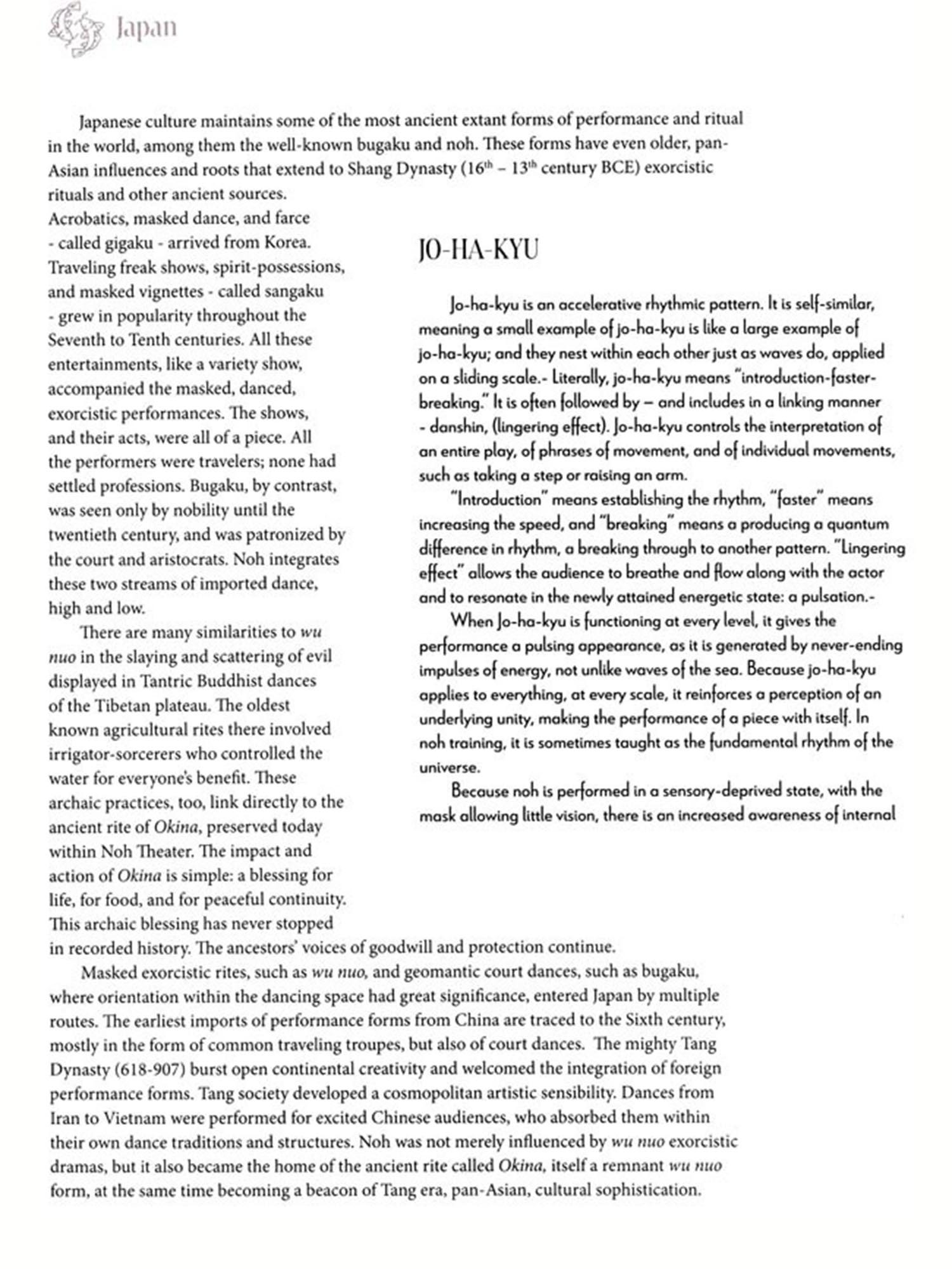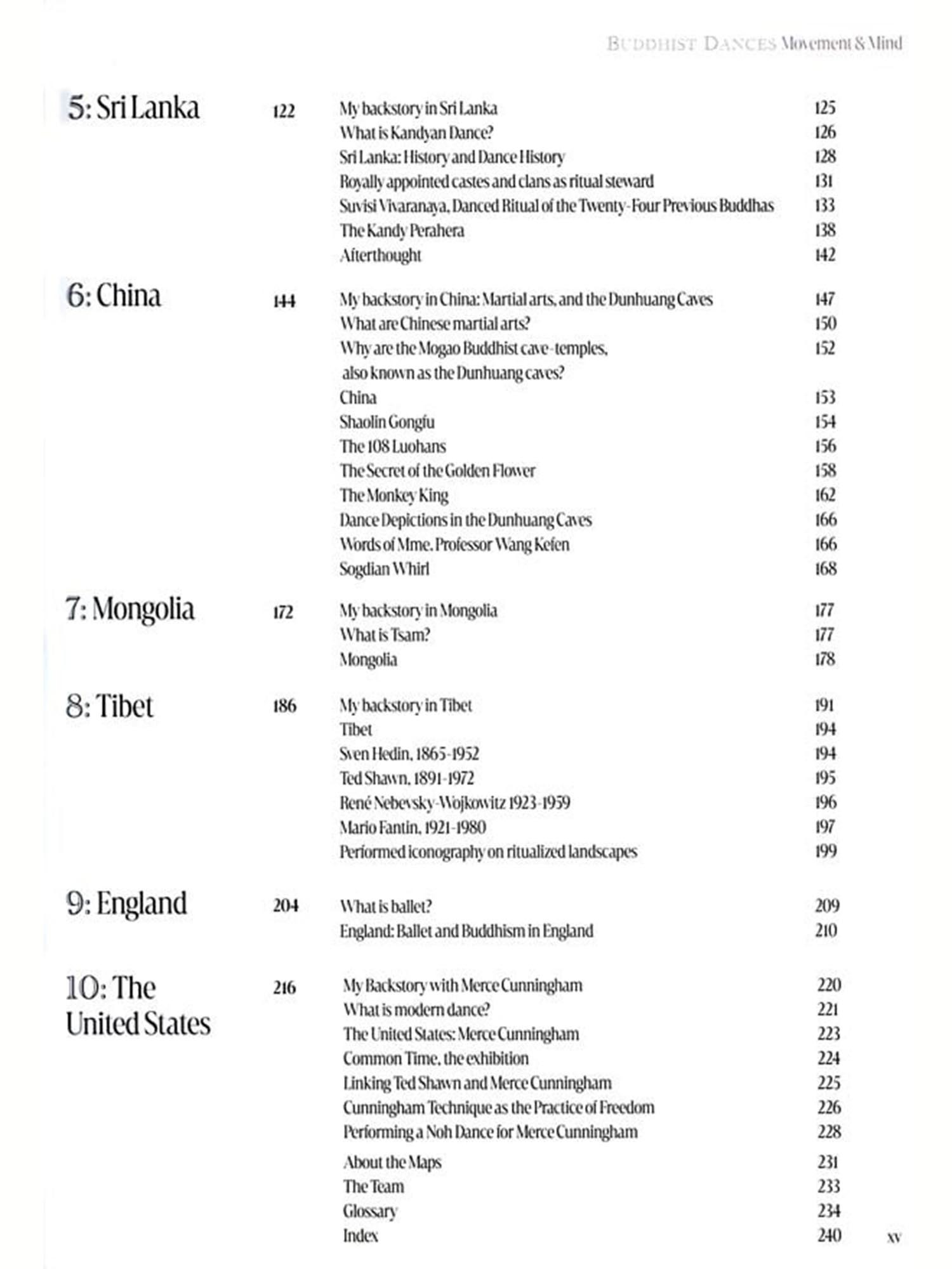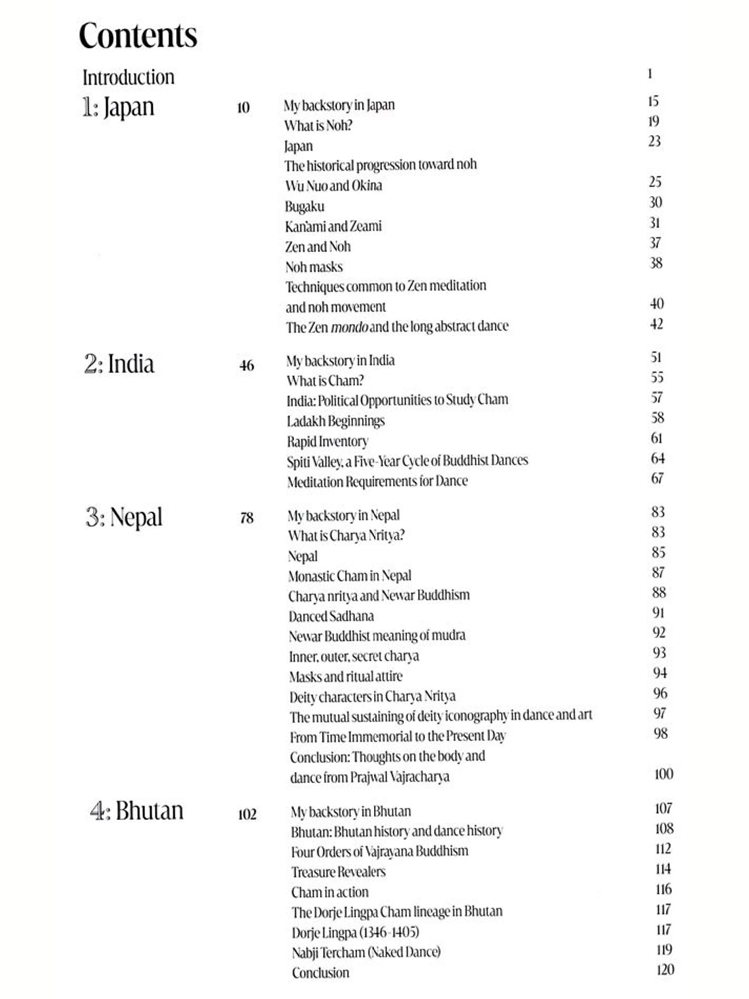 On a basic level, Buddhism is practice it is something that you do. This book presents dances that are traditional Buddhist practices in Japats, Iniha (Ladak Zanskar, and Himachal Pradesh), Bhutan, Nepal, Sri Lanka, China, Mongolia, and Tibet. The book presents dances as traditions, as transformative technologies embodying Baddhat virtues, and as successful transmissions of teashing over the ceritaries. The book introduces Buddhist dance traditions extant today, plus two modern examples of Western dance artists influenced by Buddhism Chinese Shaolin Gongfu, and the astonishing dance depictions in the Mogso Caves are included to paint a more complete context of Buddhist movement practices in the ancient world. In 1999, I was invited by a monastic meditation matter in Ladakh to help his monastery and his order with challenges they were facing regarding their transmitted dance practice. Dance was my introduction to Vajrayana Buddhism. I am an artist and respond to Buddhist dances first as a dancer. I'm asked to assist because of my dance and directorial skills, which conduct and inform documentation so that it is useful to them. As a dancer, I understand what their priorities are and what they value about their dances. I see the problems they see. As a scholar and researcher, I can design projects with them that advance their goal of a more stable dance transmission into the future. Our research results help sustain these traditions and offer posterity accurate records of a cultural wonder of the worlds: the ancient dances of Buddhism. Afterwards, as now, I write so I can share what I learned through my experiences. This book treats the reality of dance in Buddhist practice, lay and robed, and proceeds by example. The youngest Asian dance presented in this book is at least 400 years old. The oldest dances, which claims roots reaching back to before the Common Era, are more than 2000 years old. What makes dance traditional is person-to-person transmission over generations, forming a lineage. What makes a ritual dance is its use in a ritual. What makes a dance "yogic" is the use of dance as a form of meditation, an enlightenment technology. What makes dance monastic is its being practiced only by monks, a part of their complete spiritual training. What makes a dance "lay" is its being performed by uninitiated people, neither monks, nuns, nor priests. Clan families have been appointed and established over the centuries to sustain certain Buddhist dance rituals. These are lay groups. This book introduces monks, nuns, priests, actors, and family clans as the performers of the dances presented. Changes in the organization of traditional groups over time is normal and happening at a fast rate now. Buddhism originated in a culture with a lot of dancing and esteem for dancing: Shakyamuni grew up with dancing, and with empowered gestures called mudra. Buddhism spread into cultures with long traditions of dance and ritual expression and absorbed some of these elements. It is no surprise that dance would continue in dancing cultures. Buddhism did not snuff out dancing in the manner of the Christian Church, which intentionally put an end to dancing by the fourth century CE. Instead, Buddhism absorbed and influenced dances as it spread. This connection - or not to a culture's own ancient dances is a stark difference between East and West. The West lost its living connection to its own ancient dances; Asia did not. There are long consequences resulting from this distinction, especially in regud to how dance in valued Looking into the sources of the five primary dance traditions presented in this book Cham, Charya Nritya, Kandyan dance. Shaolin Gongfu, and Japanese Noh it is essential to examine the proto-forms and ancestors of these movement arts. These are the forms from which Buddhist dances aruse, or from which they were transformed. To look at extant Boddhist dance traditions today often means to see Buddhism added to a dance form that is older, or to see a dance form that is older added to Buddhism. This implies that the dances are older than the advent of Buddhism in their culture. Buddhism appears not only to have transformed older dance practices but even to have insured their longevity This book is offered to encourage future research. Informed appreciation can help keep these dances continuing. Traditional dance and philosophy are inseparable in Indian culture, and also in the Buddhist dances presented in this book. Dance, philosophy, and practice come together. The dances shared in this book are traditionally taught along with philosophical and meditation teachings, combining into a single act. This book presents some of these didactic methods. My academic background is in philosophy: I graduated from St. John's College, in Annapolis, Maryland, and earned a Master of Philosophy in Dance from the Laban Centre for Movement and Dance in London. The philosophical aspect of the Buddhist dances with which I've worked interests me and is evident in my appreciation of these dances. Buddhism did not annihilate the ancient cultures into which it spread. Rather, it assimilated ancient practices, becoming a living repository of pre-Buddhist elements. The histories of the dance forms presented in this book all recede into archaic legendary history: into a pre-history. This, too, implies the that dances are localized and are older than the Buddhism they eventually embodied. Otherwise, there is the practical choreographic issue of whole dances being invented on the spot, which would be so difficult as to be improbable. This book explores the possible roots, and the implications, of some of the legends of the dances presented. The dances provide the occasion for the retelling of their legendary histories. The legends and the dances are closely connected. Chinese ethnographers have an excellent phrase to describe certain traditions: "handed down since ancient times." It applies well to the dances described in t