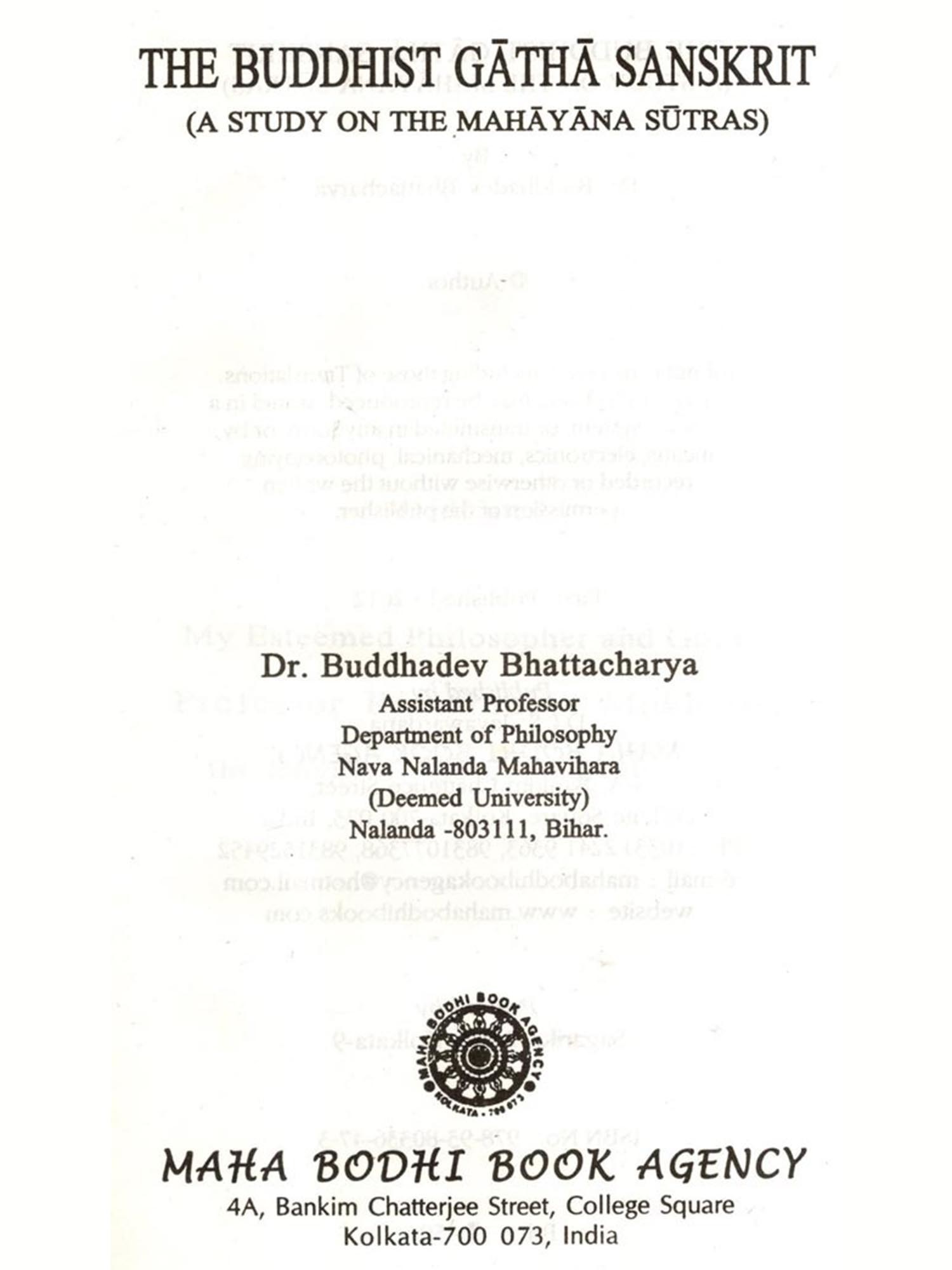 It affords me immense pleasure to write a Foreword to a book entitled The Buddhist Gatha Sanskrit by Dr. Buddhadev Bhattachrya who is an erudite scholar in Buddhism having a good command over Sanskrit and Pali. His book is a fascinating study where very few scholars have dared penetrate to fathom the subject in a befitting manner. Franklin Edgaton's Buddhist Hybrid Sanskrit (1953) has already passed into the land of oblivion, and therefore a fresh study of the subject has been a sine qua non. Dr. Bhattacharya has minutely done that job. It is interesting to note the position of Buddhist Gatha Sanskrit in the context of ancient Indian languages. I am placing very briefly the position of the language in the Buddhist context.