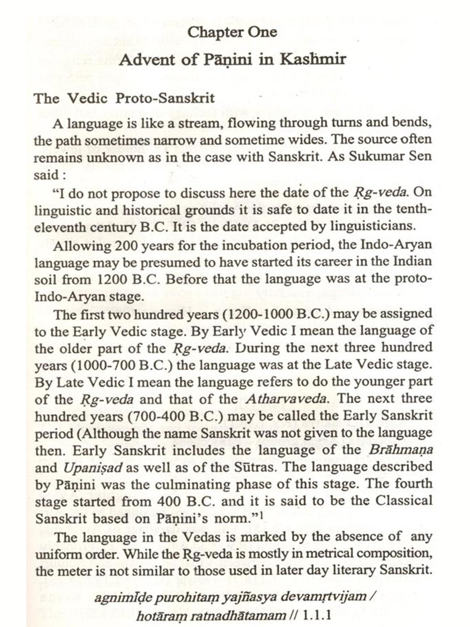 Linguistically India is a polyglot country. It has four linguistic families, such as, Indo-European, Dravidian, Austic and Sino-Tibetan. To the Indo-European family belongs Sanskrit or Old Indo-Aryan, branched off from Indo-Iranian (2000-1750 B.C.) as early as 1750 B.C. Of the Indo-Aryan again there are many stages of its development. The oldest phase of Indo-Aryan, linguistically called Old Indo-Aryan, is represented by the Rgveda (1500 B.C.) and the other Vedic texts, by the Ramayana and the Mahābhārata, by Classical Sanskrit as described by Panini (400 B.C.) and Patanjali (150 B.C.) and as employed by Kālidāsa and others. The Old Indo-Aryan comprises both Vedic and Classical Sanskrit.