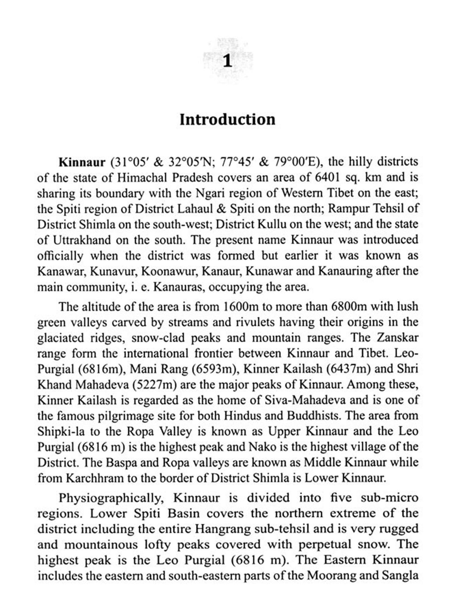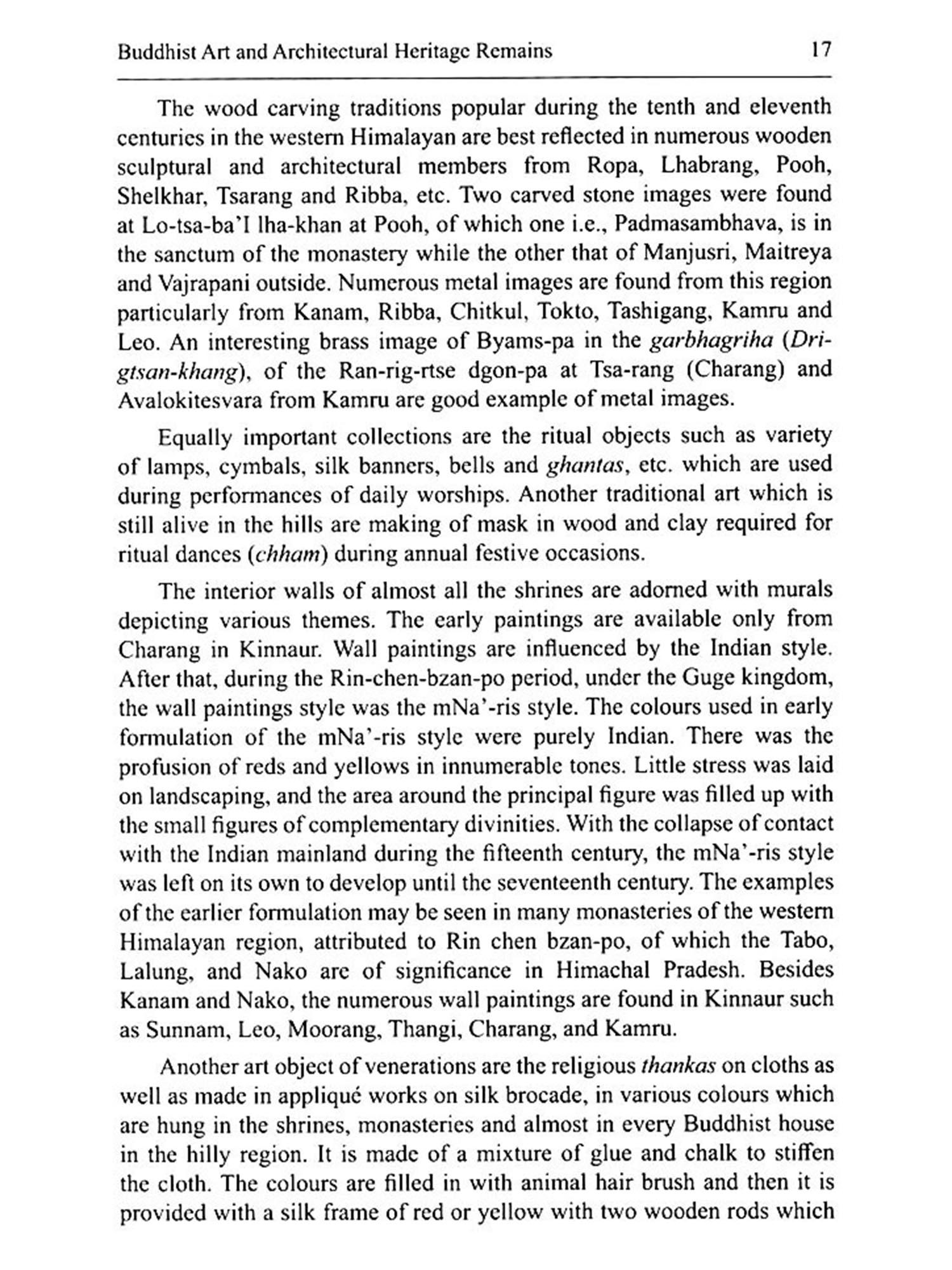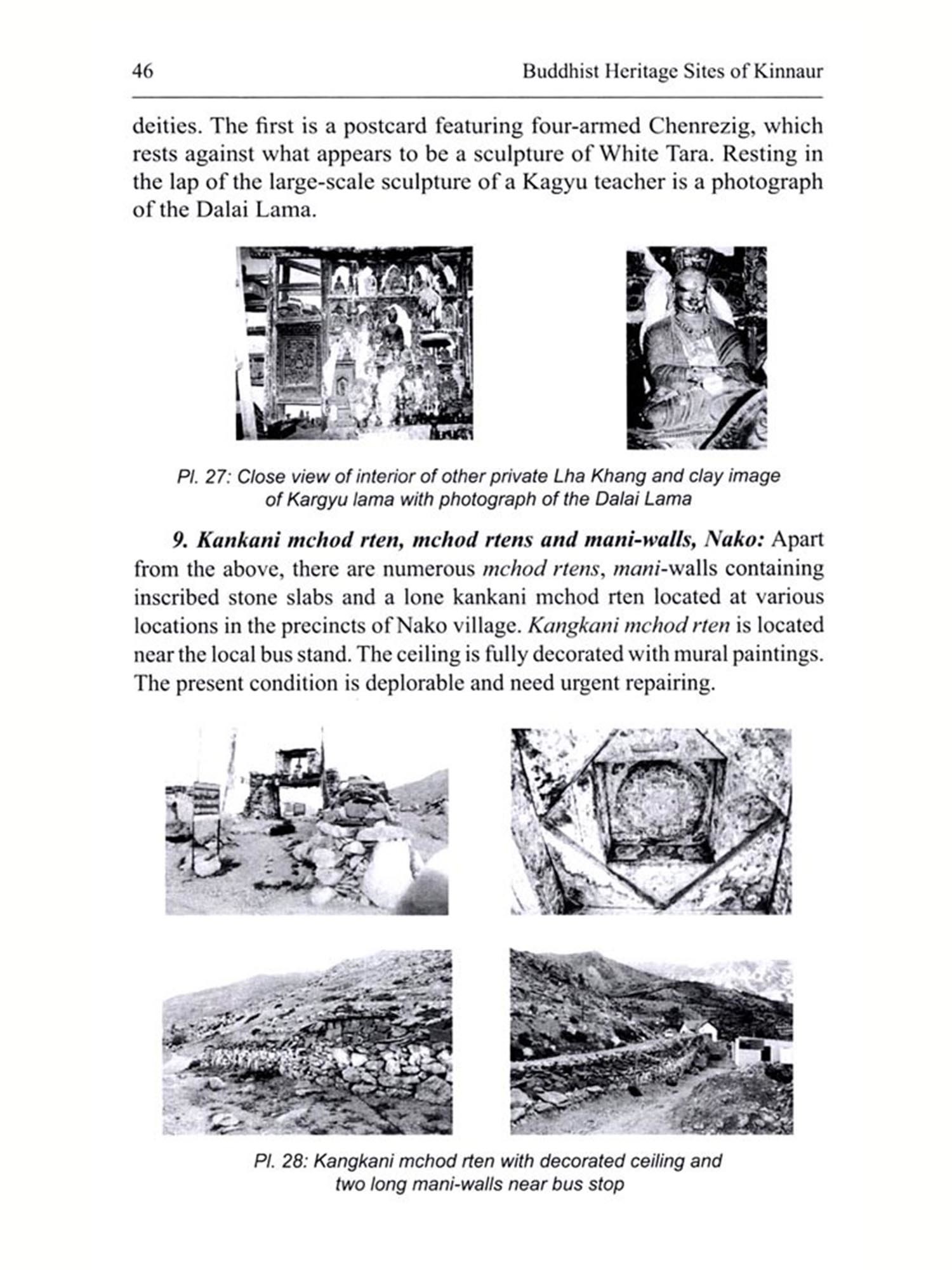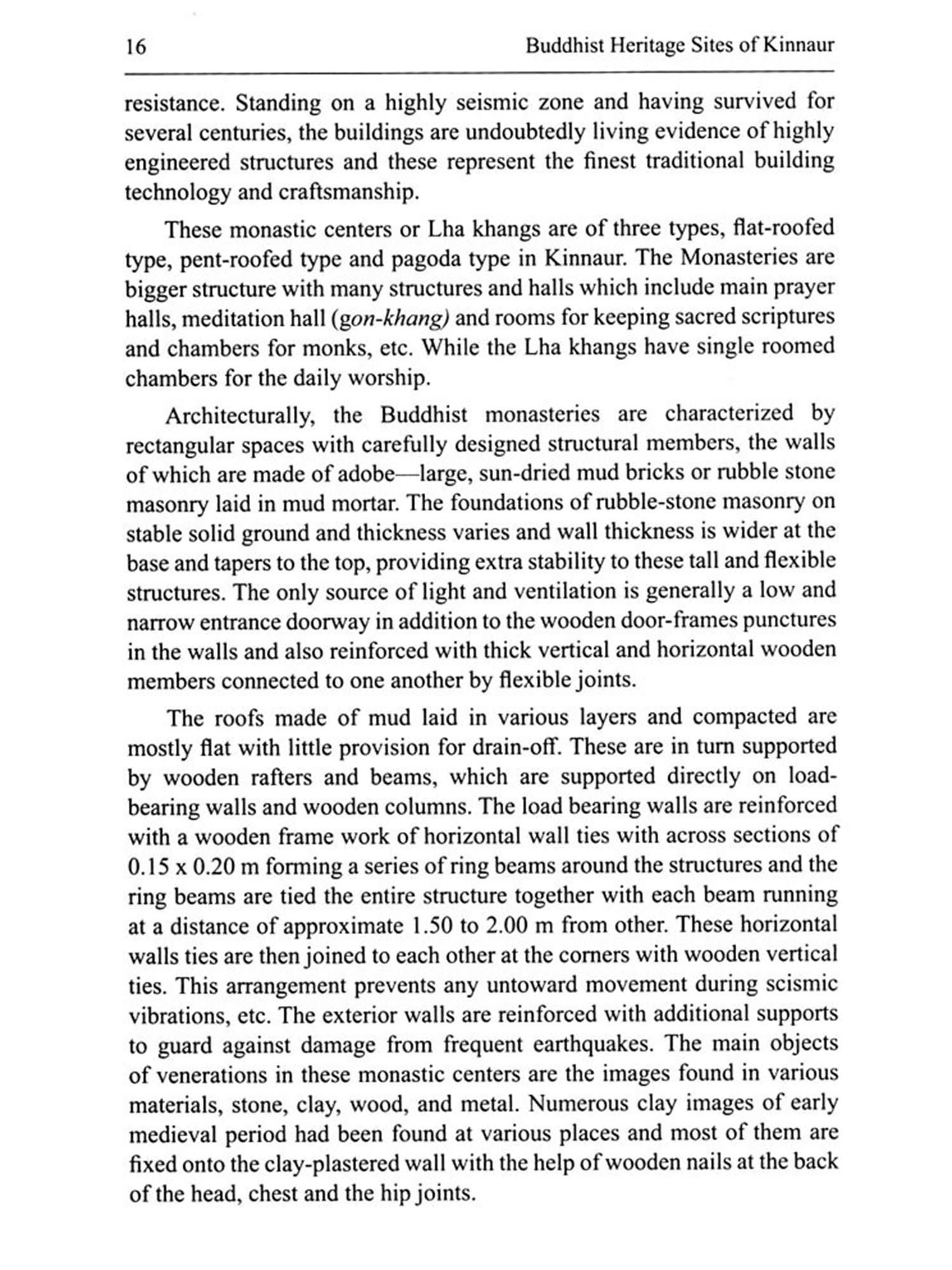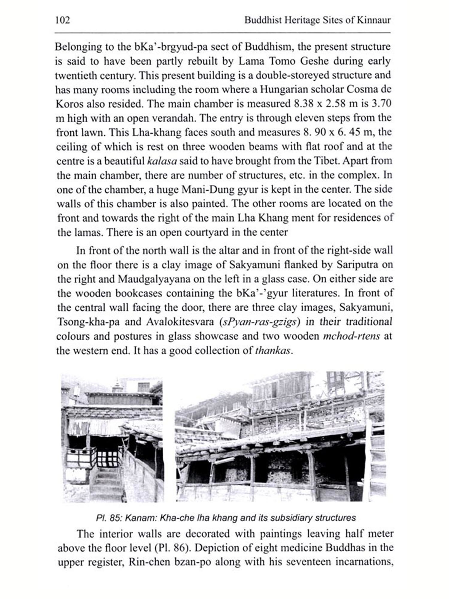Kinnaur, lying on the ancient trade route between India and Tibet and surrounded by the majestic Himalayan, Zanskar and Dhauladhar ranges, has preserved their rich cultural heritage in the form of monumental remains, including temples both wooden and stone, Buddhist monasteries and lhakhangs; mchod rtens, mani-walls memorial stones; etc. These are not merely the centers of worship but also are the hubs of religious, artistic, social and economic activities. The traditional art of wood carvings is best reflected in their wooden galleries and arched door panels, which are still alive in the hills. Not only that, but the Buddhists and Hindus live in perfect harmony, symbolizing the traditional brotherhood and friendship of the people of both faiths. Here is an attempt to outline the basic information by way of photographs of the existing Buddhist monumental heritages preserved by the local inhabitants for centuries. This work would be found useful for the lay visitors as a valley guidebook.