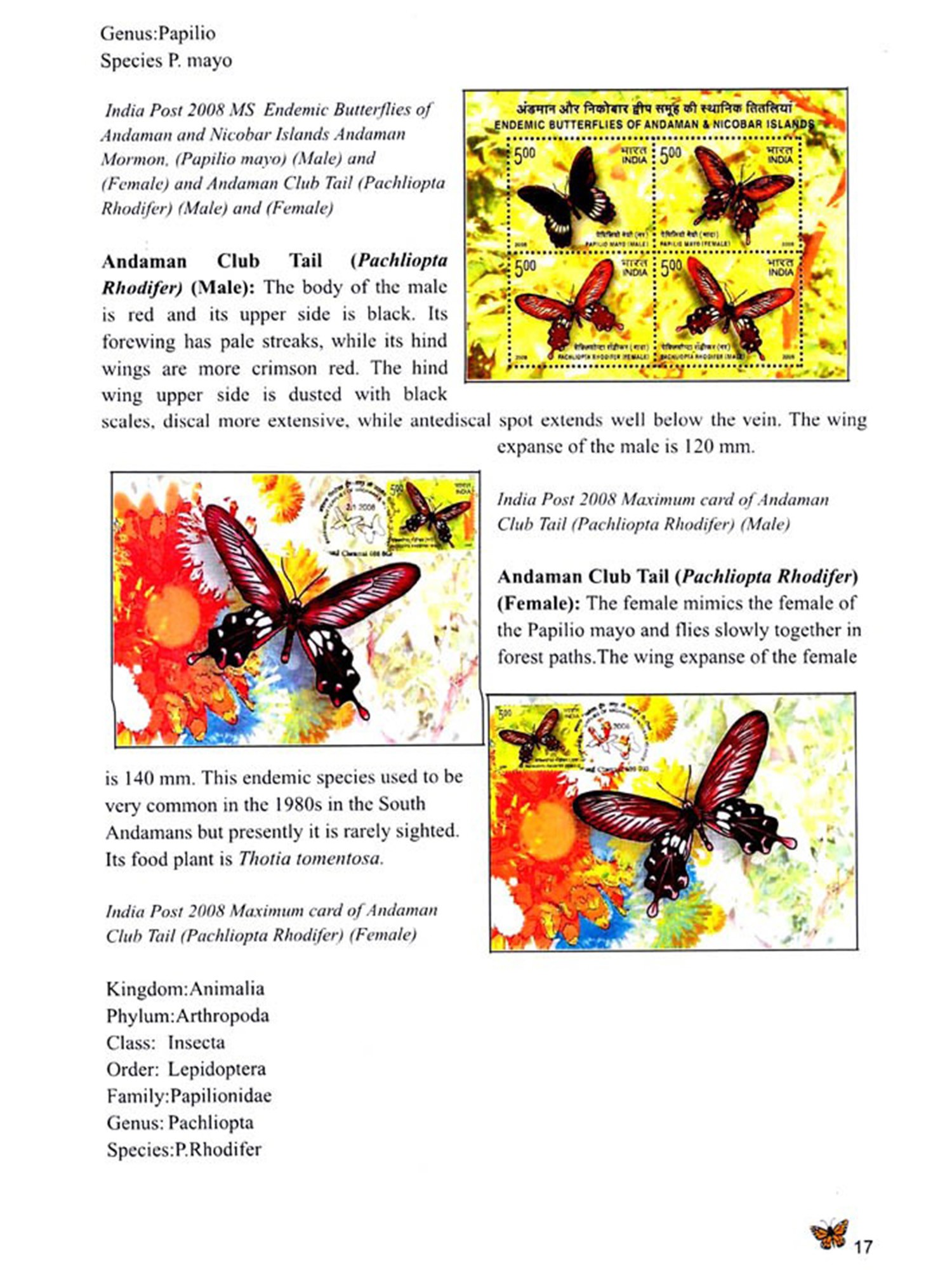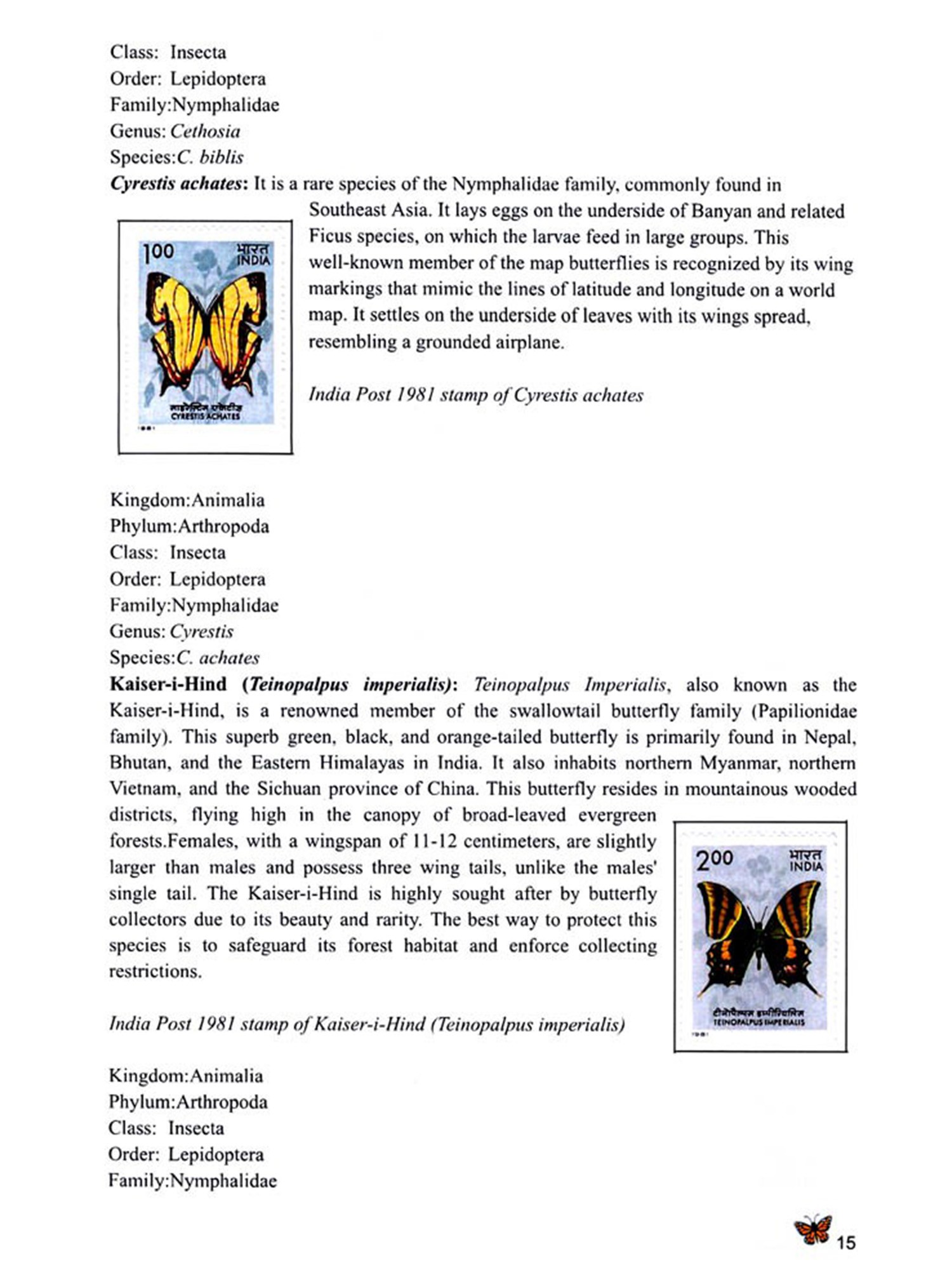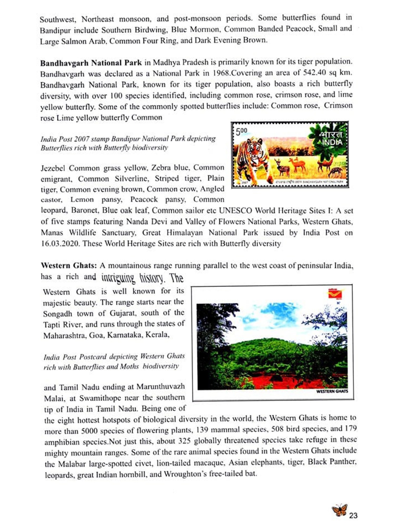 The quote suggests that welike Aumans when worry about the future or duell on the past beft,ving in the present, finds fulfillment in each forting moment Butterflies and Moths are integral components of life on Earth, they contribute significantly to its rich biodiversity. Having likely fint evolved around 150 million years ago and existing for at least 50 million years, these fascinating creatures have a long and storied history. Comprising over 250,000 species, butterflies and moths are a highly diverse group, making up approximately one-quarter of all named species India is home to approsimainly 1,318 butterfly species (which constitute65% of total Indian fauna) out of a global total of about 19.238. The largest butterfly, the Southern Birdwing, has a wingspan of 190mm, while the tiniest, the Grass Jewel, has a 1.5mm wingspan. Moths are also one of the most diverse groups of insects on earth, ranging from spectacular Hawk-moths to small, intricately patterned Footman moths Butterflies and moths are an integral part of our natural heritage and have been studied for over 300 years. Their presence resonates deeply within human culture, with extensive references in literature ranging from the Vedas and the Bible through Shakespeare to modern works, encompassing poetry and musical lyrics. In ancient Greck, the word for butterfly is "psyche," meaning "soul." Psyche, the goddess of the soul, was usually represented as a woman with butterfly wings. Aristotle himself named the butterfly Psyche, the Greek word for soul. Many cultures, including Egyptian culture, relate butterflies to the human soul Within the Vedas, specifically in the Mayabheda hymn (Rig Veda 10.177), there is a Sukta section on the butterfly by the Vedic Rishi Patanga Prajapati. The MayaBheda Sukta references the Patanga and Gandharva, here, the Rishi first refers to the butterfly as Patanga. Butterflies and Moths serve as vital indicators of healthy environments and thriving ecosystems. Areas rich in these delicate insects are also rich in other invertebrates, Collectively, these creatures provide a wide array of crucial environmental benefits, such as pollination and natural pest control. Moreover, moths and butterflies are an essential element of the food chain, serving as prey for birds, bats, and other insectivorous animals. Butterflies and moths, in turn, support a range of other predators and parasites, many of which are specific to individual species or groups of species. Ecologists widely use butterflies as model organisms to study the impacts of habitat loss, fragmentation, and climate change. Beyond their ecological significance, butterflies and moths, winged Jewels also hold economic potential. Thousands of people travel abroad each year in search of these captivating insects, with eco-tours bringing valuable income to numerous countries worldwide. Each butterfly and moth has evolved a unique suite of chemicals to deter predators and parasites, locate mates, and overcome the chemical defenses of their host plants. Each of these chemicals holds potential value and could the economically expleted economically important crops, three-quarters of the world's staple crops, and over 75% of flowering plants. Furthermore, the silk industry, the oldest fiber industry, relies on these Lepidoptera. Many butterflies and moths produce silk, India now ranks as the second-largest 42% in 2023 Raw silk production has skyrocketed from 1.242 metric tonnes in 1949 so silk producer worldwide, with its share of global production jumping from 6% in 1949.to 38,913 metric tonnes in 2023-24. Silk exports from 20.41 crores in 1949-50 to 22.028 crimes in 2023-24 and reached over 80 countries. have found their way on stamps of a few countries. Entomological postage stamps are unique Butterfhes have a knack of bringing out the artist in everyone, and thus butterfly paintings teaching tools in primary and secondary education. Postage stamps and philatelic products can means of communication of science with the public and have been suggested as effective thus be both a powerful conservation and advocacy tool, as they circulate widely in the world to create awareness among people, and especially children. Its increased awareness can help habitats from destruction, for the benefit of future generations and also bring new changes in Man- Ecosystem relationship. India has issued postage stamps and other philatelic material from time to time depicting Butterflies and protect and conserve Butterfly Moths. book The book "Butterflies and Moths of India on Stamps"is divided into seven chapters with the chapters Introduction, Butterfly on stamps. Butterfly on Postcards, Moths on Postcards Butterflies and Moths Pictorial Cancellations, Butterflies and Moths Migration, Butterflies and Moths Conservation and Bibliography. Philatelic materials used in the book "Butterflies and Moths of India on Stamps" are issued by India Post total 220 philatelic materials like stamps, postcards, Maximum cards, special covers etc., are used. Descriptions used in the are sourced from various public references and postal departments website and pamphlets and presentation packs. The author acknowledges all authorities and postal administrations. All statements of fact included in the book are based on diligent research and are accompanied by footnotes, with references mentioned at the end to indicate the source o any such information. Although the author has made every effort to ensure the accuracy o he information in this book, any liability for errors and omissions, whether resulting fror negligence, accident, or any other cause, is disclaimed. Suggestions for future improvemen e welcome. The book is useful to Butterfly and Moth enthusiasts, Students, forester vironmentalists, researchers and students.