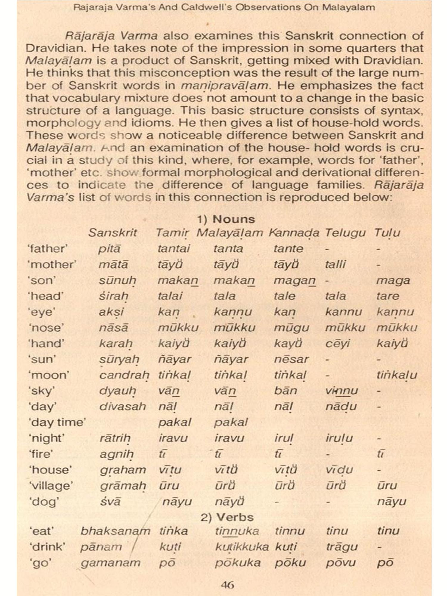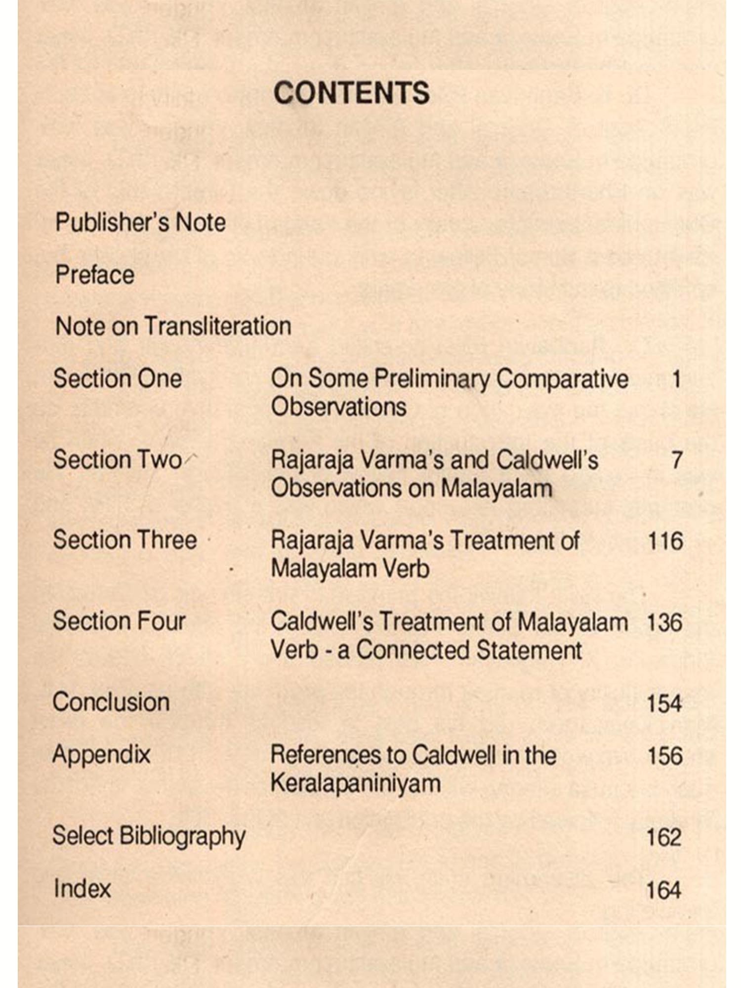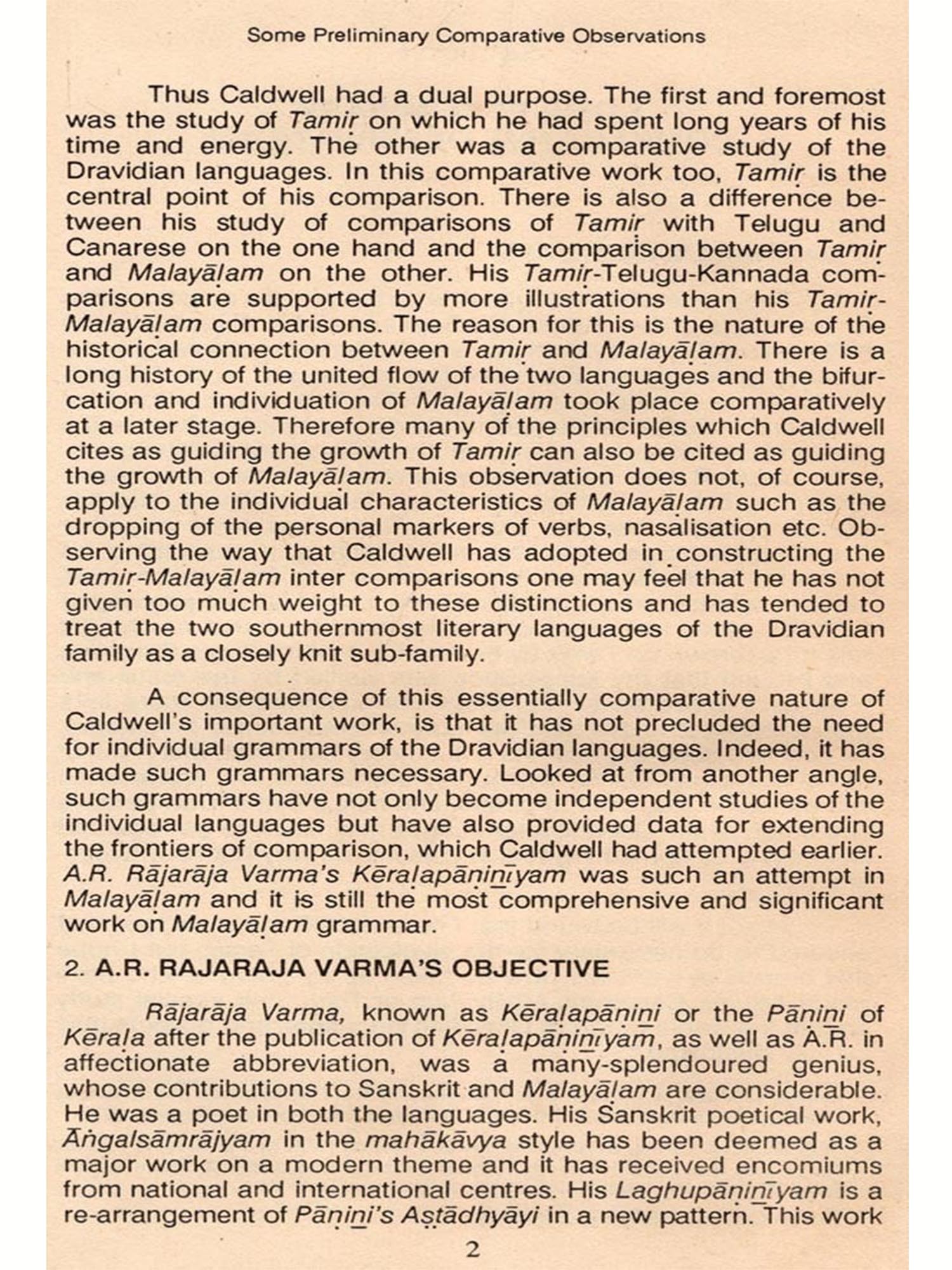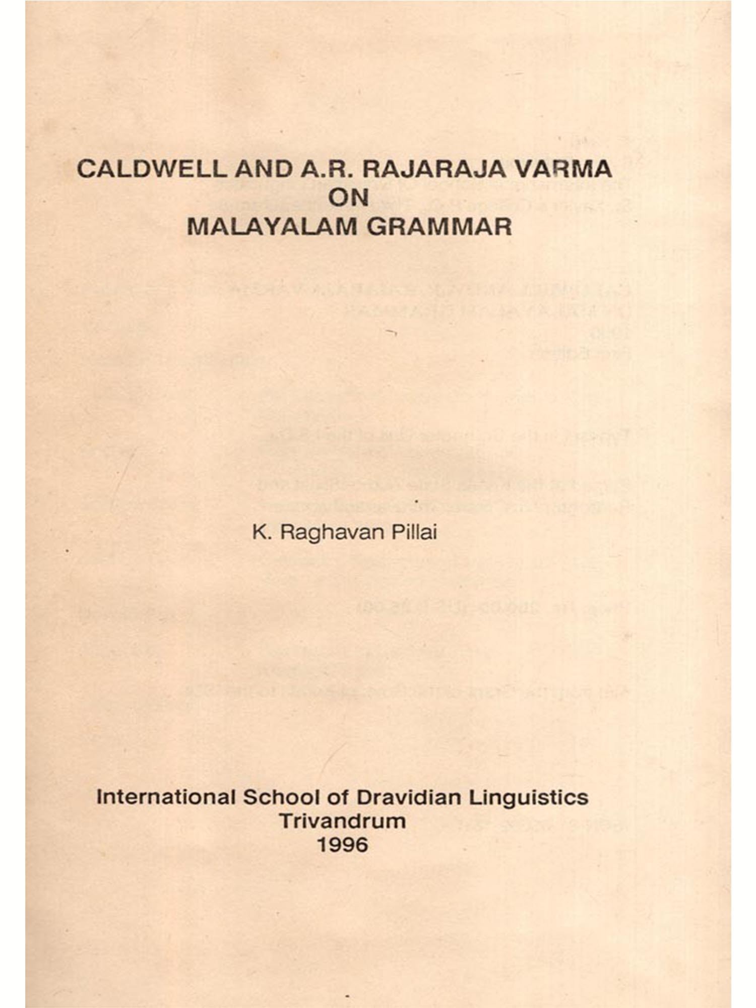 The subject of my investigation is a comparison of the studies on Malayalam Grammar by A.R. Rajaraja Varma, the author of the Keralapaniniyam and Bishop Caldwell, the author of A Comparative Grammar of the Dravidian or South Indian Family of Languages. In my work, I have surveyed the ground covered by the famous Pithika or preface to Prof. Rajaraja Varma's work and also examined comparatively what Caldwell has said on the same areas. I have further examined in detail how A.R. Rajaraja Varma expounds on the Malayalam verb. Further, Caldwell's observations on Malayalam verbs lying scattered in several sections of his work have been made into a connected statement as found necessary. I have also examined some other problems. Some areas like adjectives could not be covered, for want of time. What has been done has been indicated in this report, divided into four main sections.