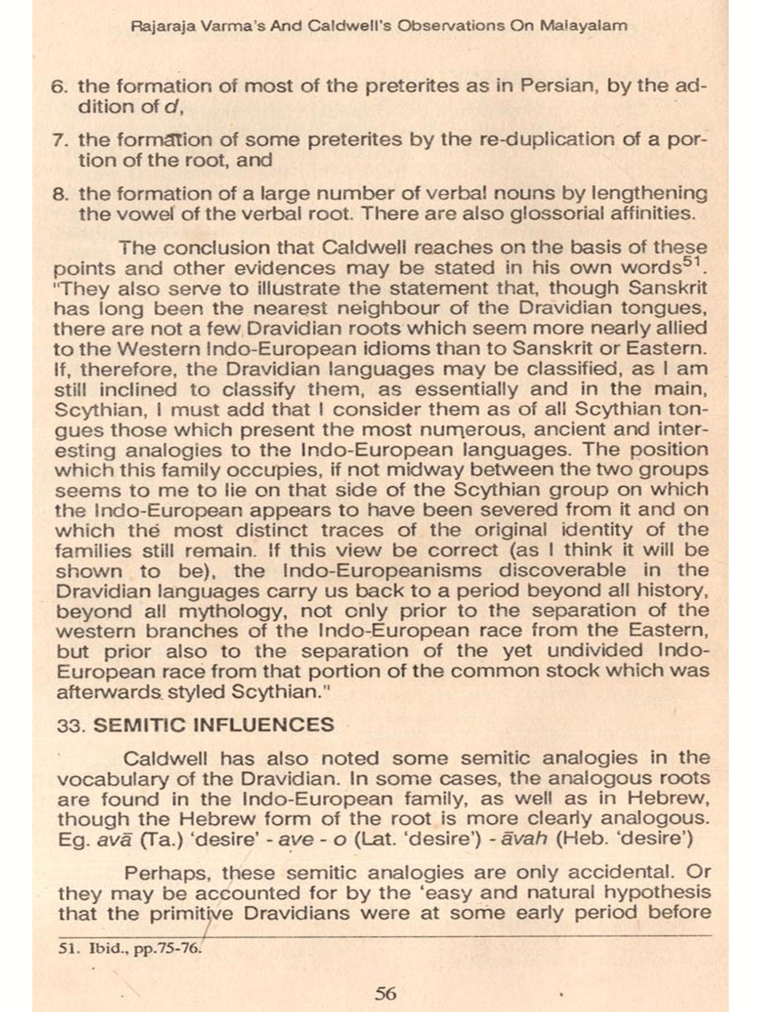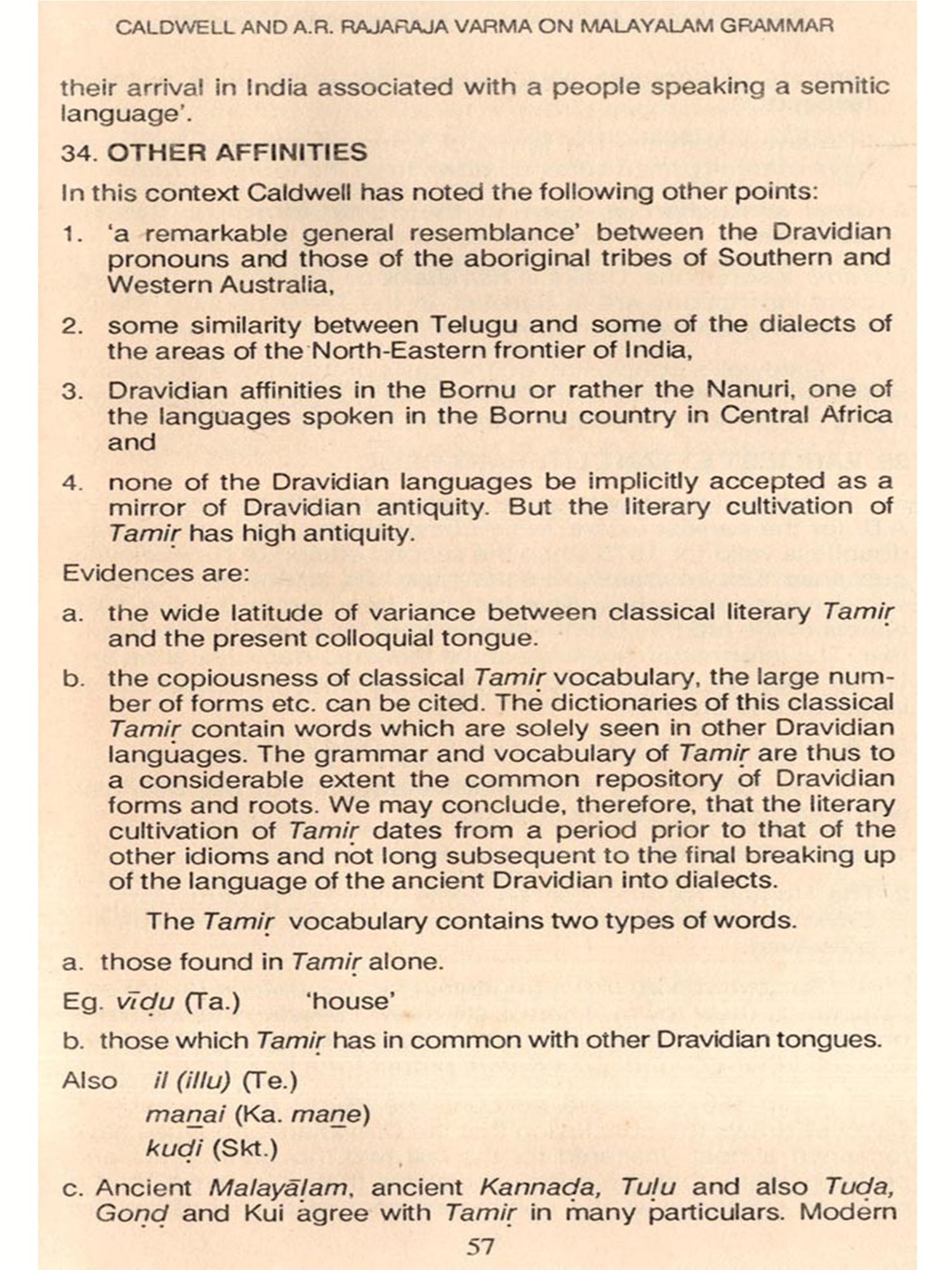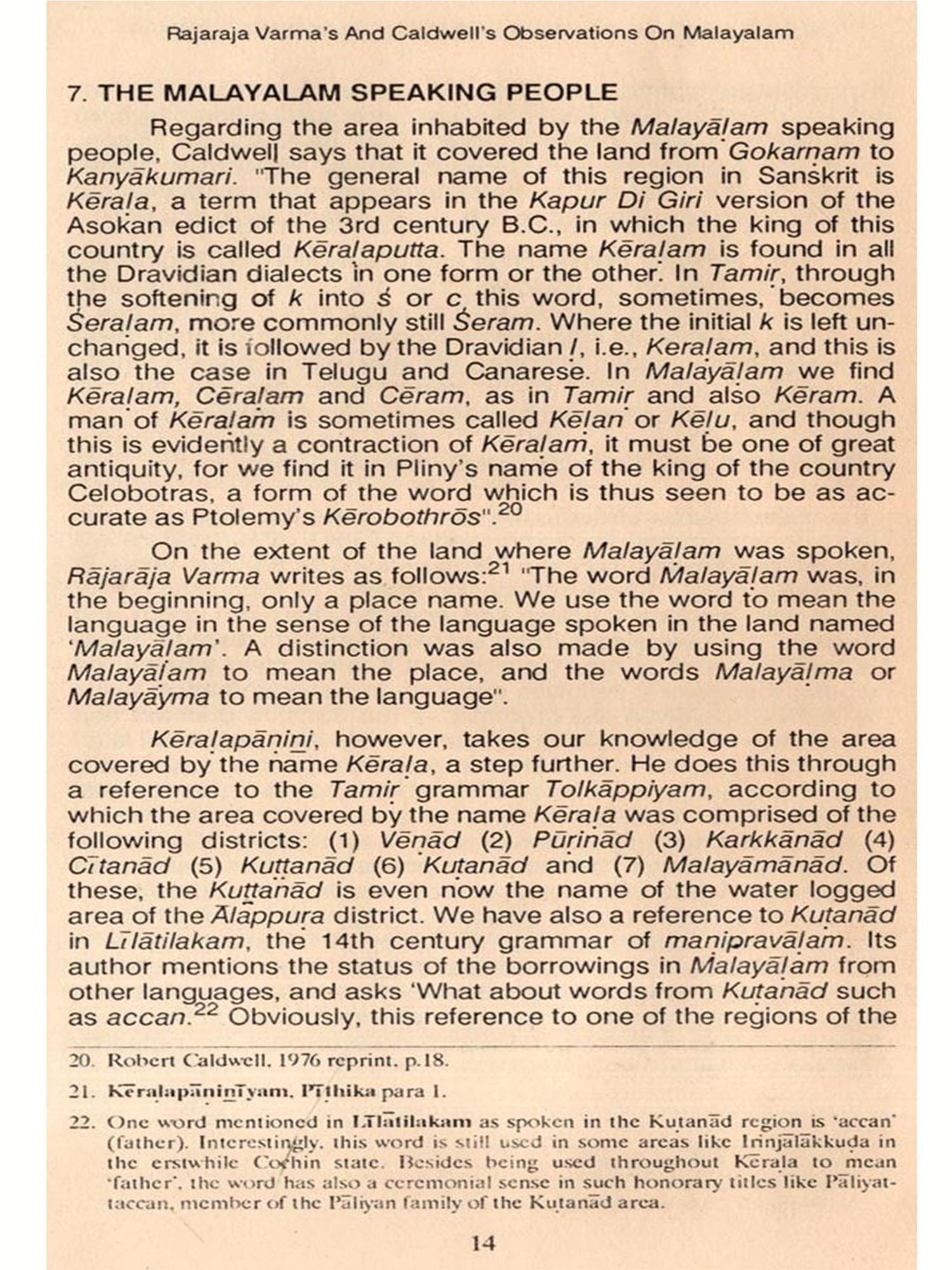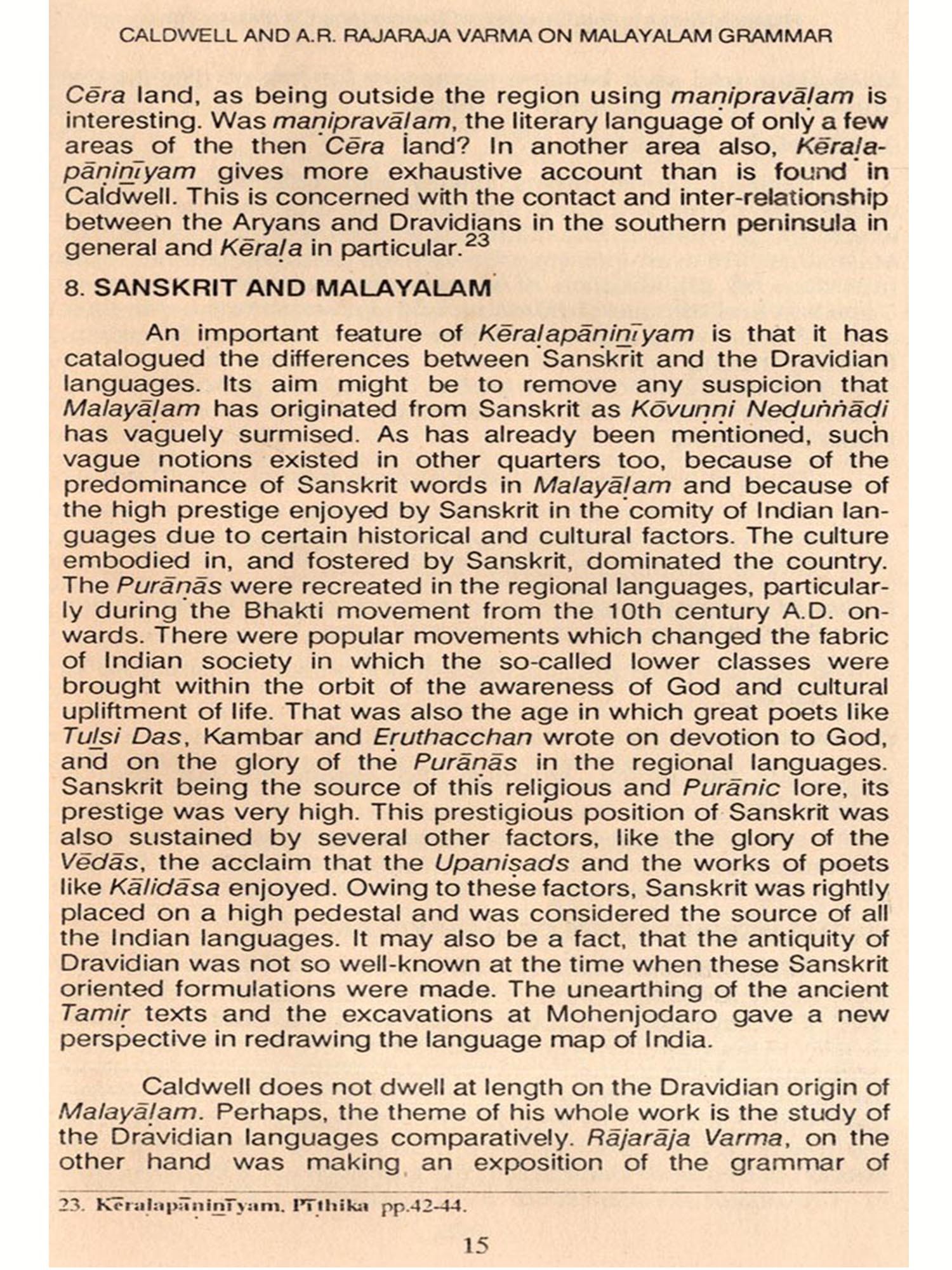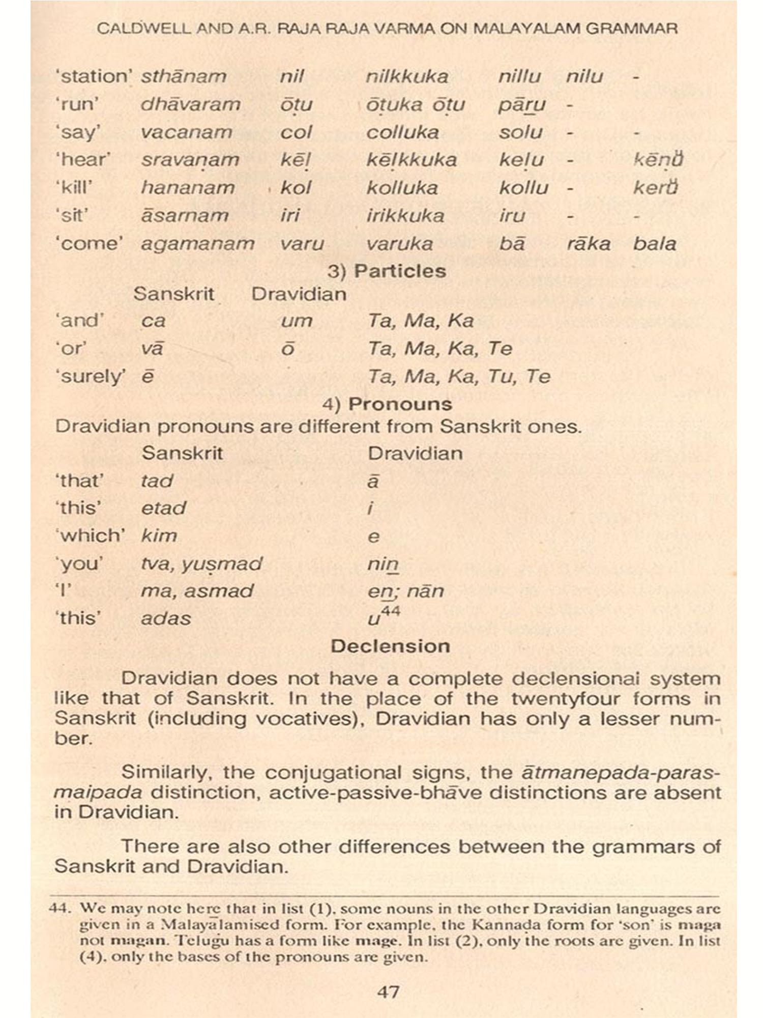 The subject of my investigation is a comparison of the studies on Malayalam Grammar by A.R. Rajaraja Varma, the author of the Keralapaniniyam and Bishop Caldwell, the author of A Comparative Grammar of the Dravidian or South Indian Family of Languages. In my work, I have surveyed the ground covered by the famous Pithika or preface to Prof. Rajaraja Varma's work and also examined comparatively what Caldwell has said on the same areas. I have further examined in detail how A.R. Rajaraja Varma expounds on the Malayalam verb. Further, Caldwell's observations on Malayalam verbs lying scattered in several sections of his work have been made into a connected statement as found necessary. I have also examined some other problems. Some areas like adjectives could not be covered, for want of time. What has been done has been indicated in this report, divided into four main sections.