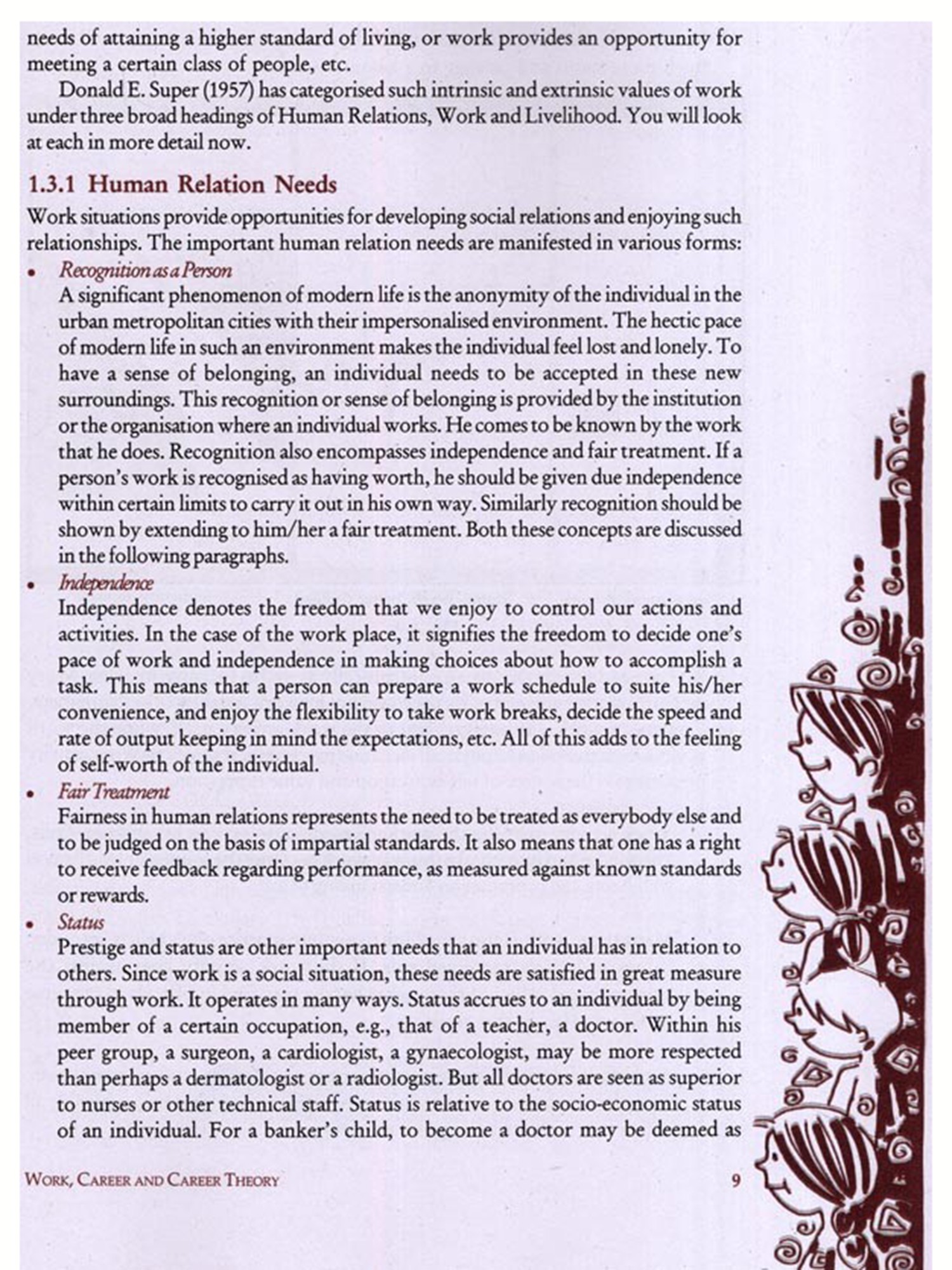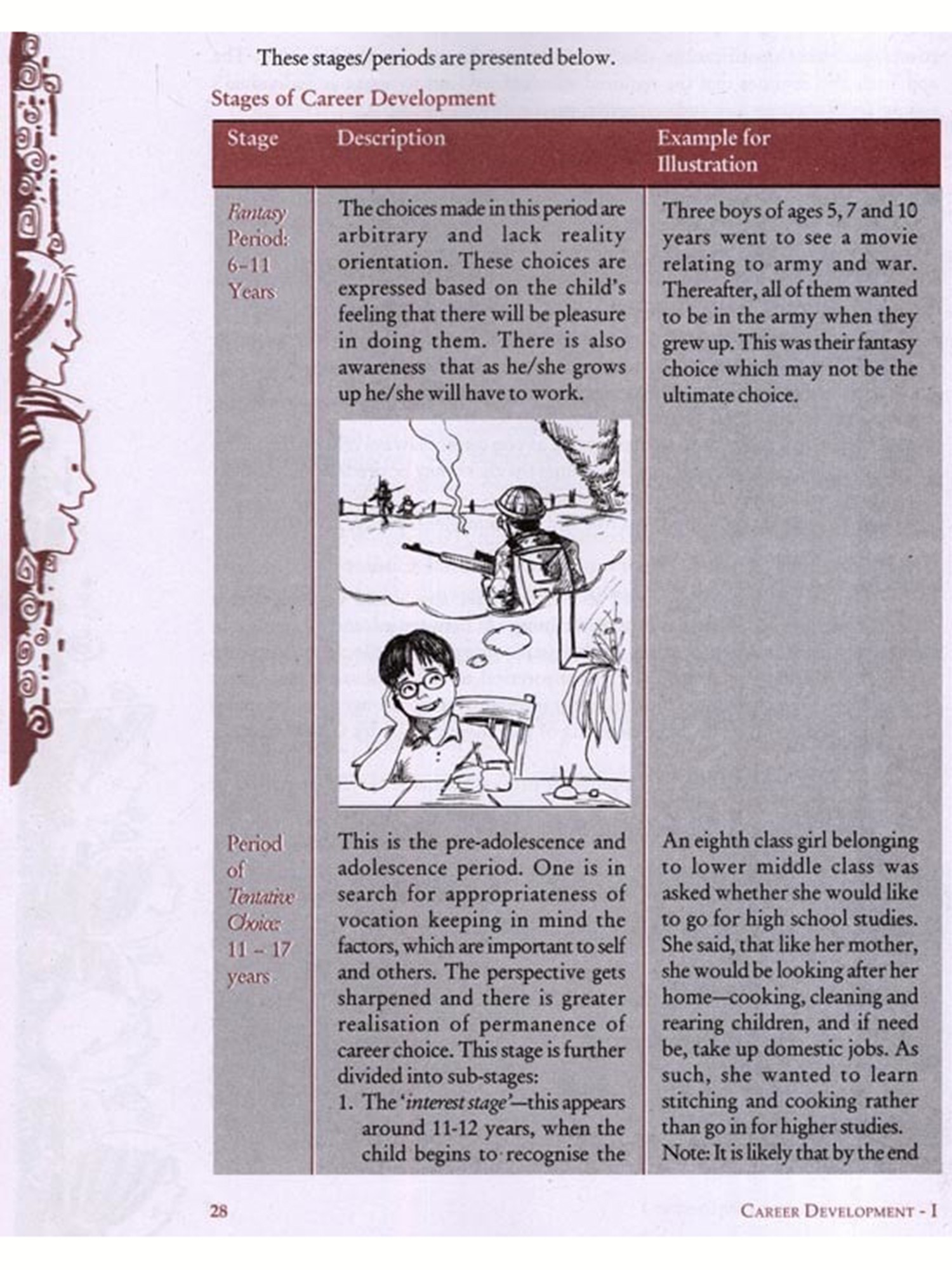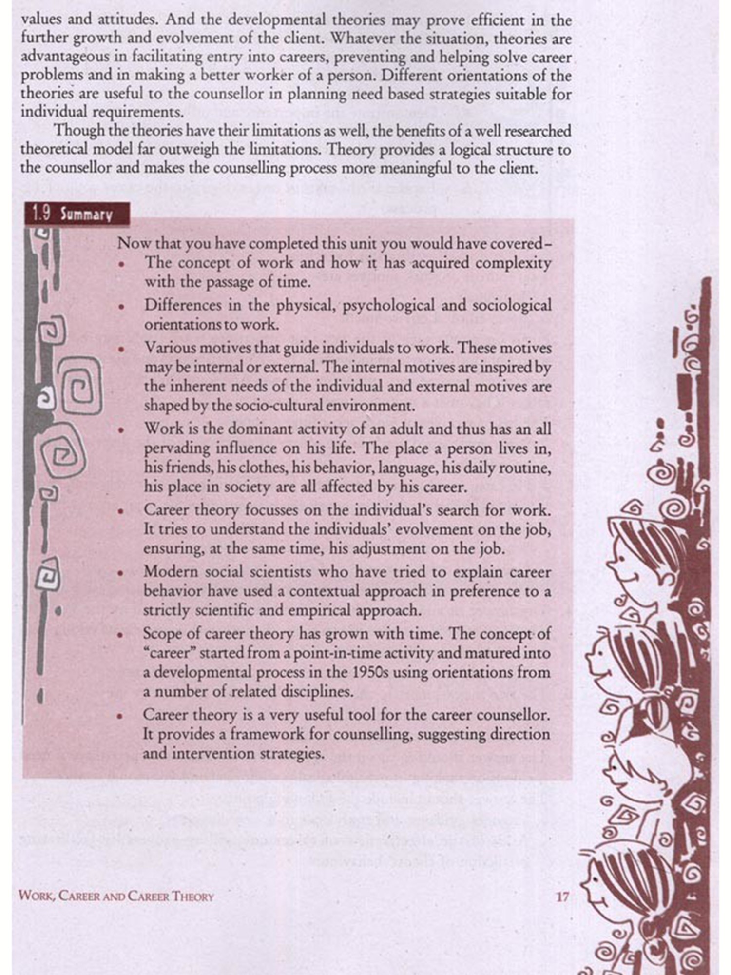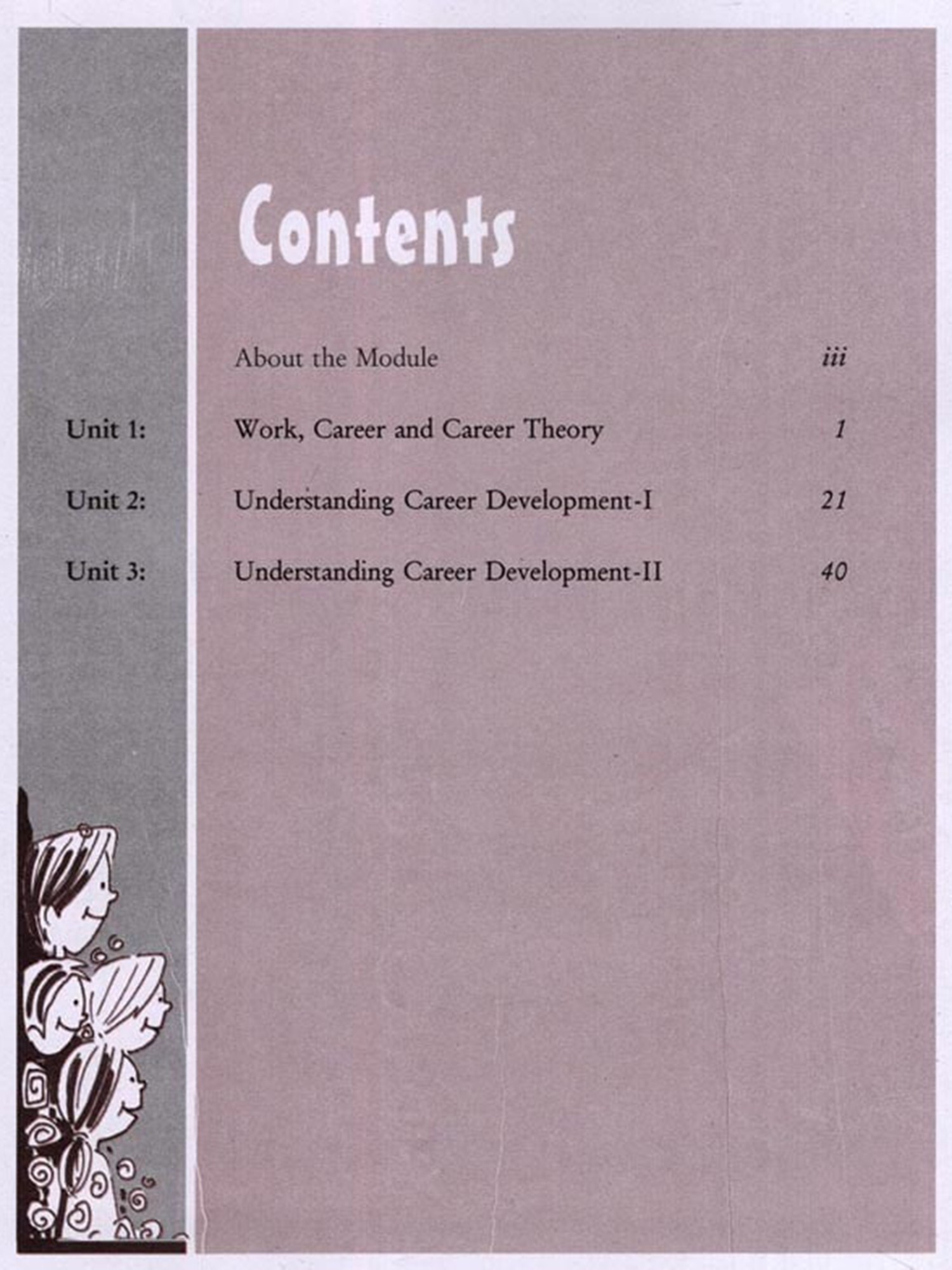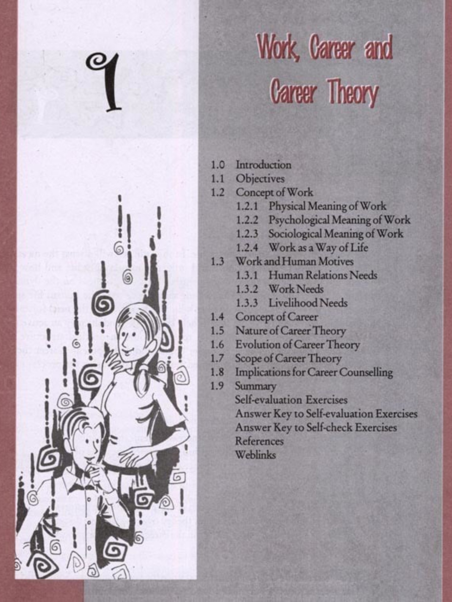 Unit (1), the introductory topic attempts to enlighten the counsellor trainee on the basic concepts of work and career which occupy a central position in the youth's future careers and life style and which form the core of this course on understanding career development. In unit (ii) and (iii) an attempt has been made to describe and evaluate the most commonly used career development theories. It may be noted that the description of the theories are not full-blown but rather fragments have been highlighted to integrate and systematise the career decision making process related to adolescents.