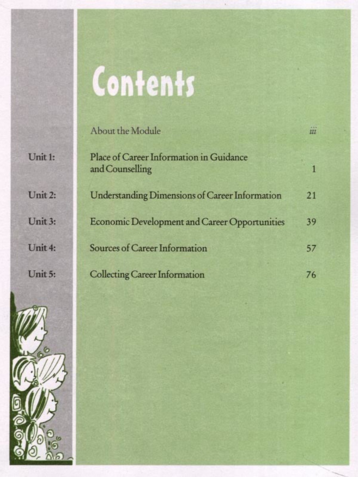 This is the module on Career Information in Guidance and Counselling. The module is aimed at providing you an understanding of nature and functions of career information as one of the essential components of guidance and counselling. The major emphasis is on equipping you with the knowledge that only accurate and up-to-date career information is useful which is required at all the school stages and in all career related matters.