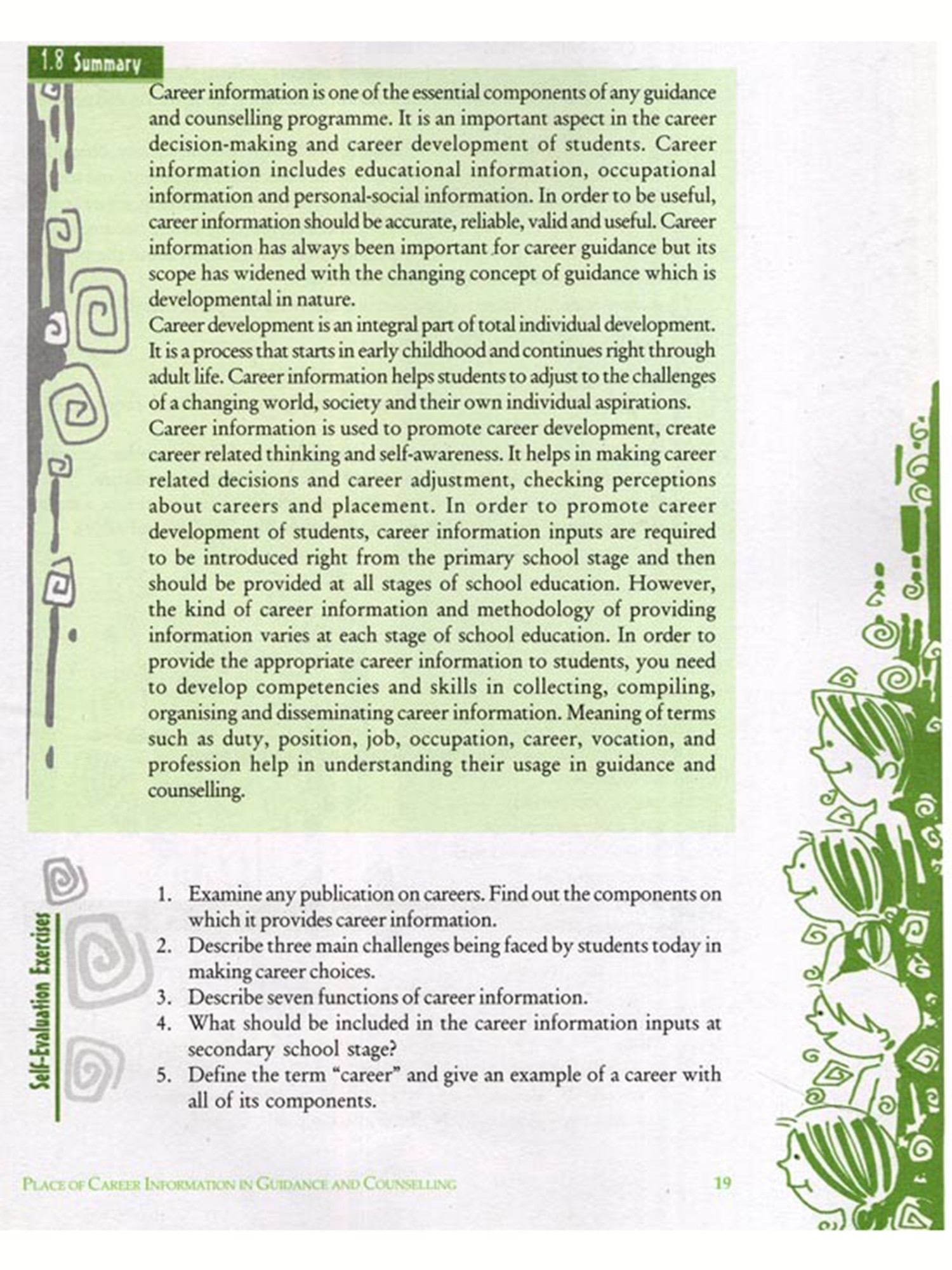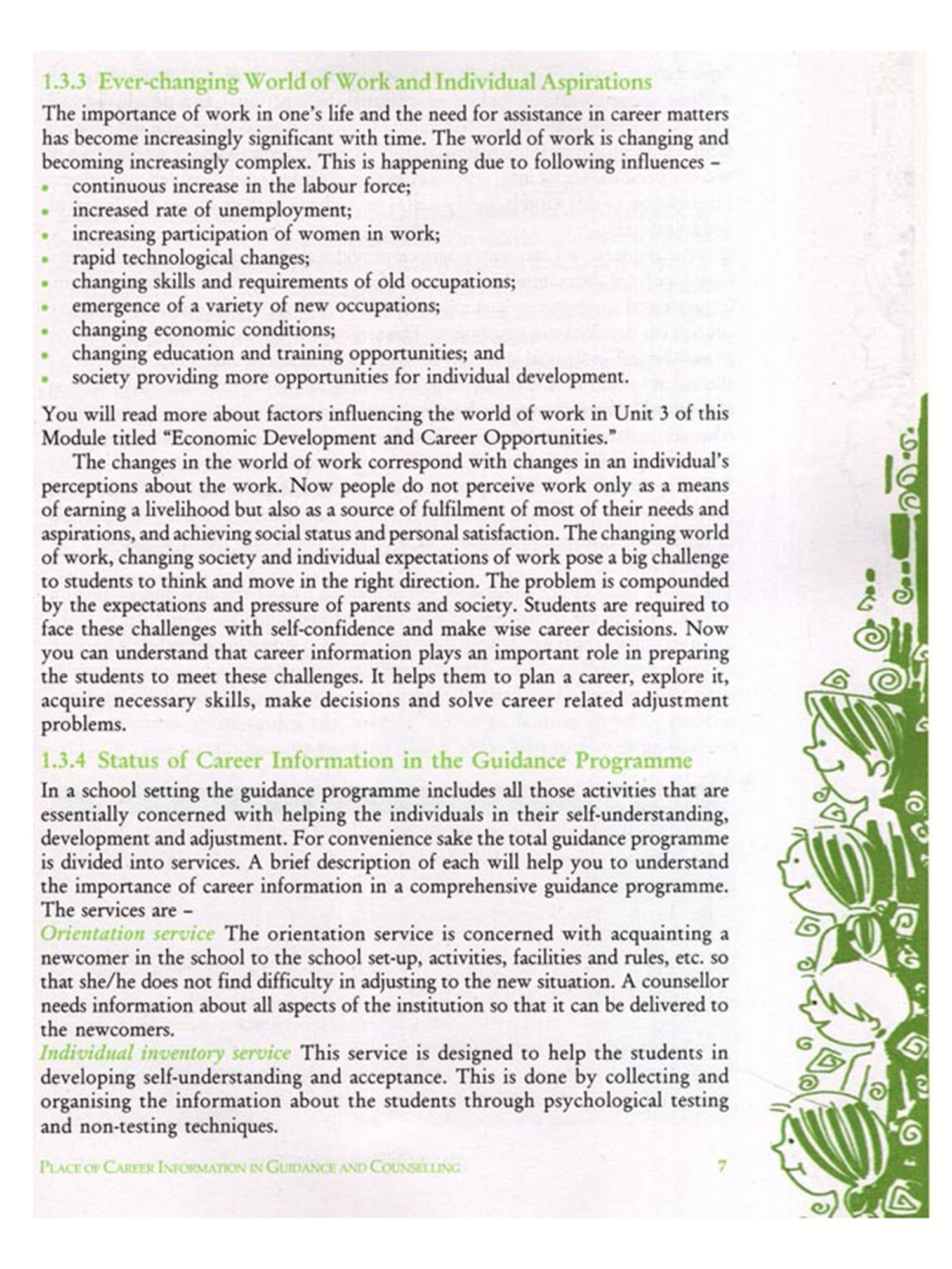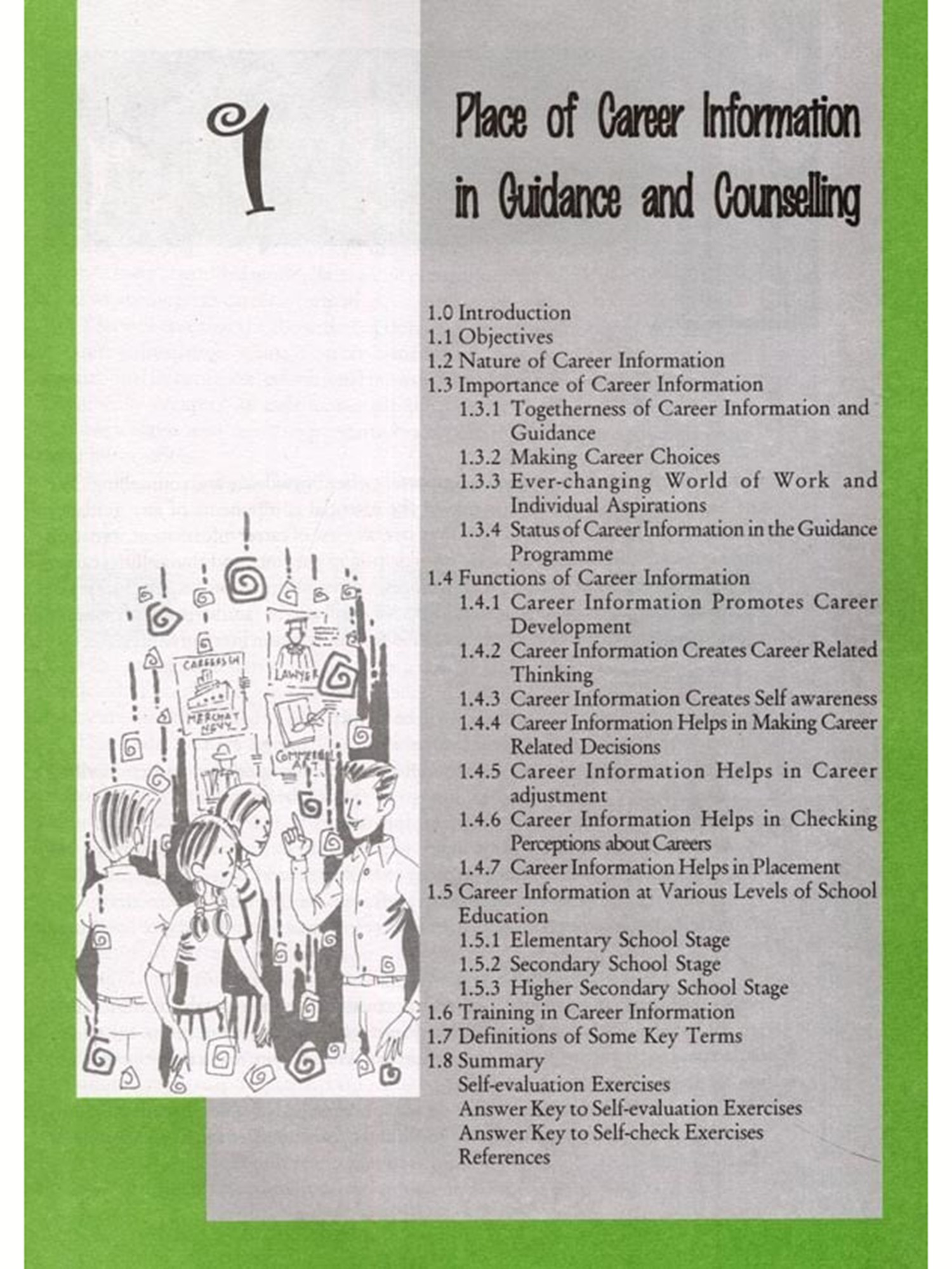 The contents of various units of the module provide you with knowledge of various aspects and dimensions of career information on which you need to collect information for dissemination purposes. Effort has also been made to provide you with knowledge of various sources of career information, variety of forms in which career information material is available from different agencies and criteria to evaluate the materials for its quality and usefulness. The available career information can be supplemented through conducting follow-up surveys, community surveys, want-ad surveys etc. The module also provides an understanding of economic development, ever-changing world of work, factors influencing the world of work and its relationship with employment opportunities.