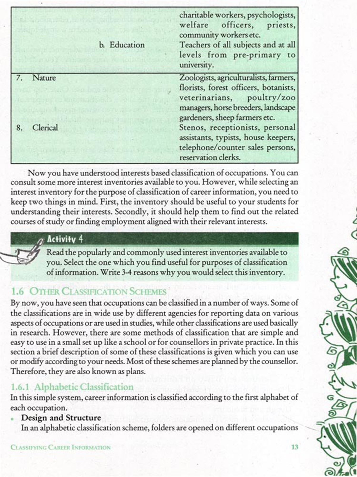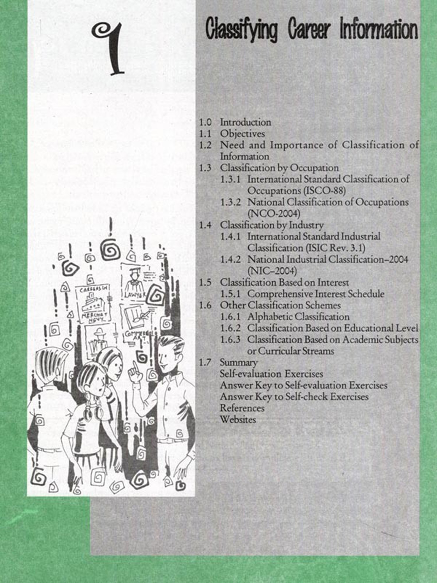 Effective dissemination of career information to students and even teachers requires organisation or classification of career information collected for various sources in some systematic manner. The systematically classified career information also facilitates the task of updating and supplementing the information. Unit-1 provides a brief account of schemes available for classification of career information and their uses and limitations. Some of the schemes are very simple and easy to use in school setting.