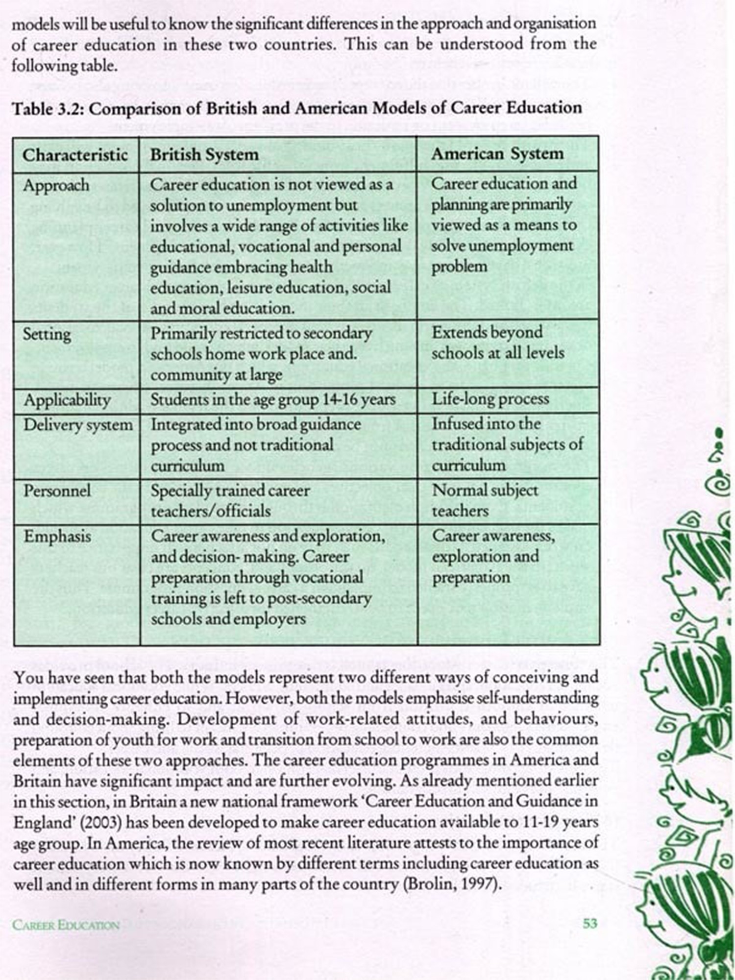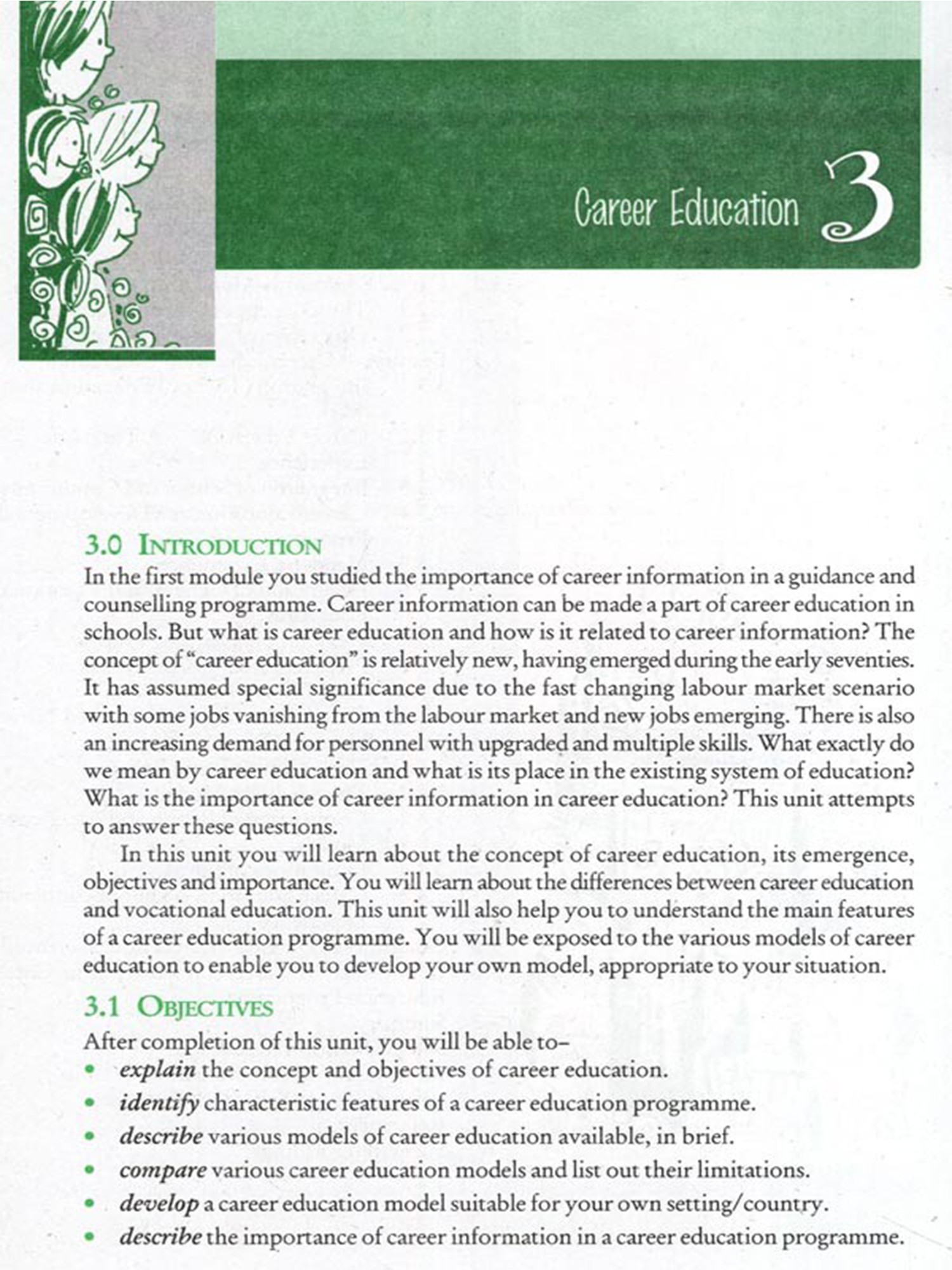 Career information also forms important part of career education programmes in schools. Unit-III is aimed at creating an understanding of concept and objectives of career education, main features of a career education programme and role of career information in the career education programme. Discussion of various models of career education can help in designing model suitable for implementation in a given work setting.