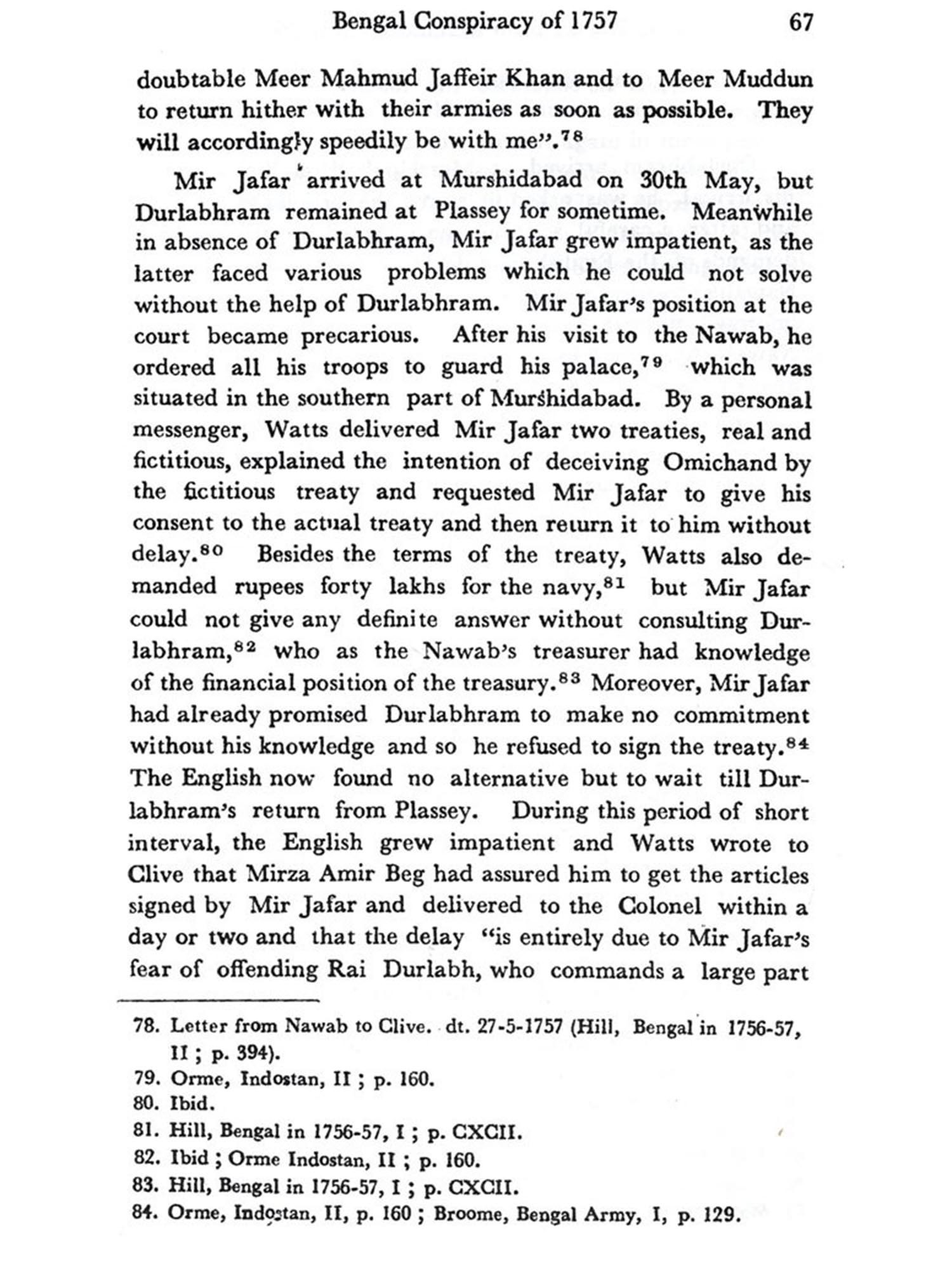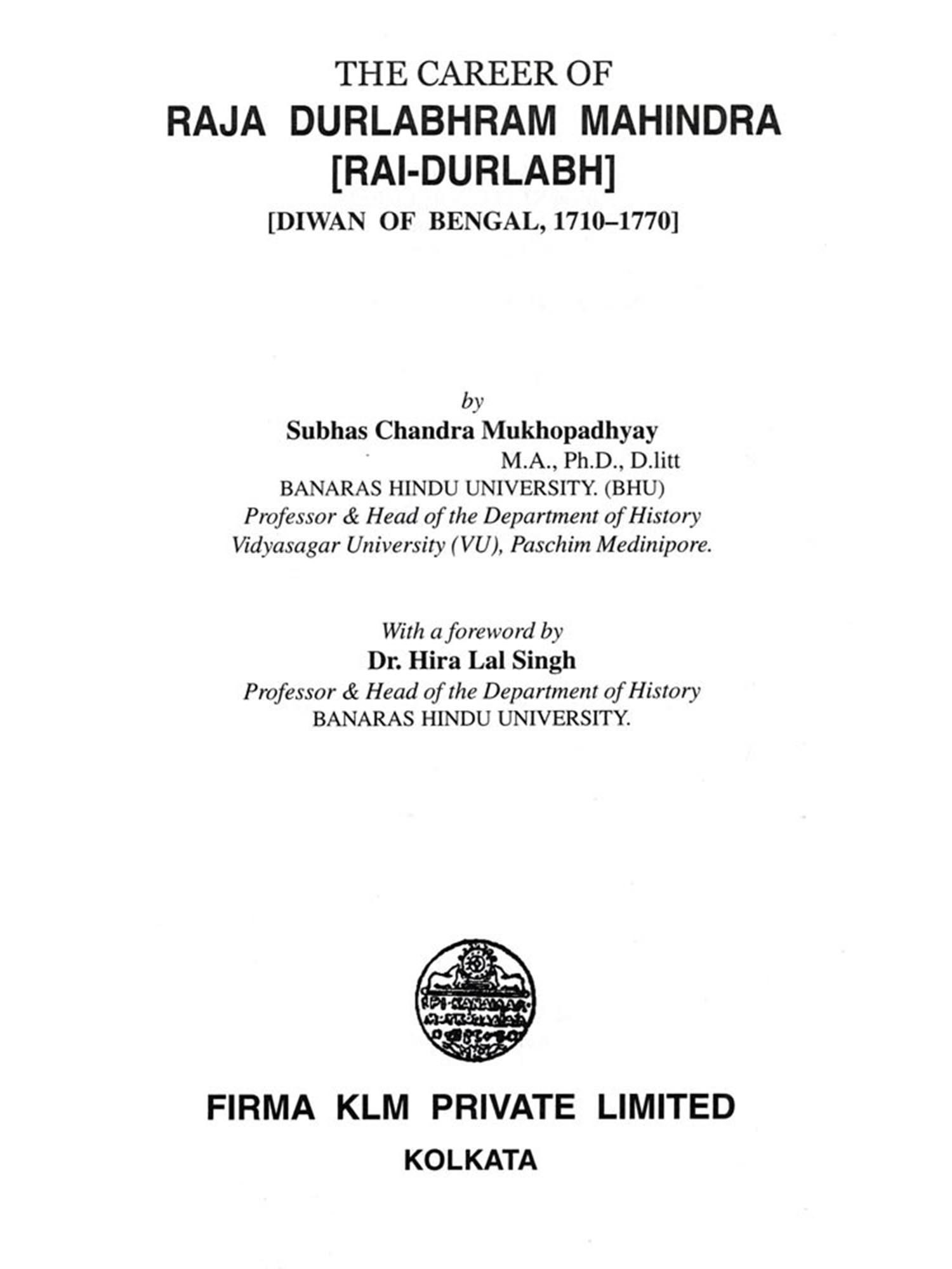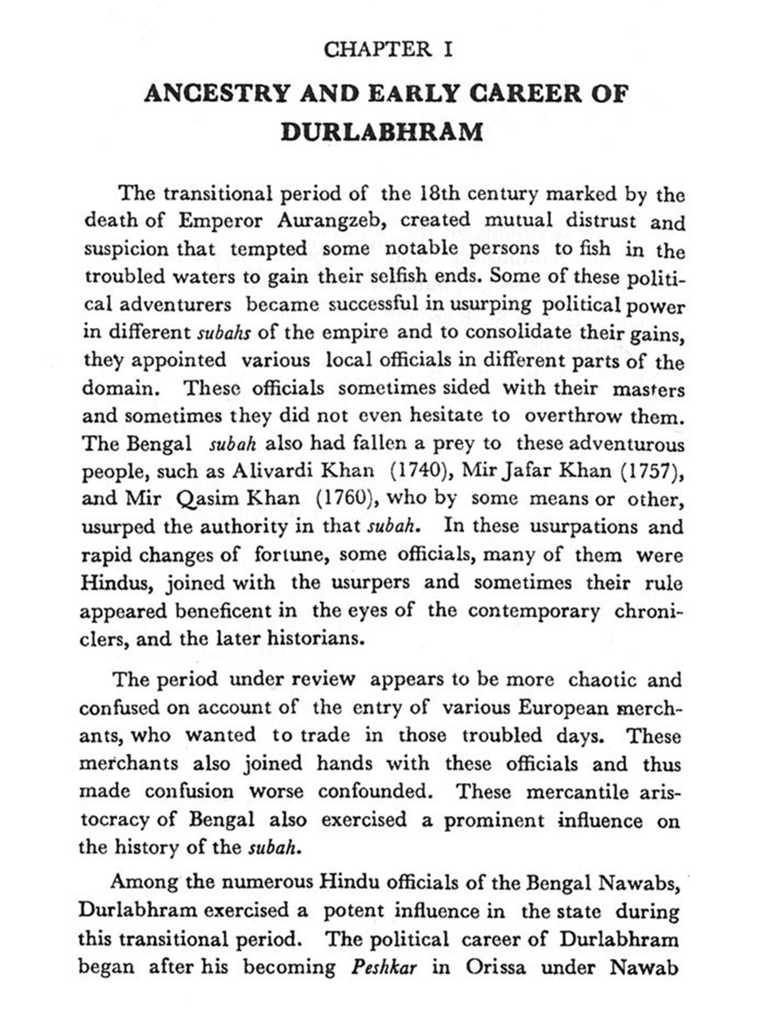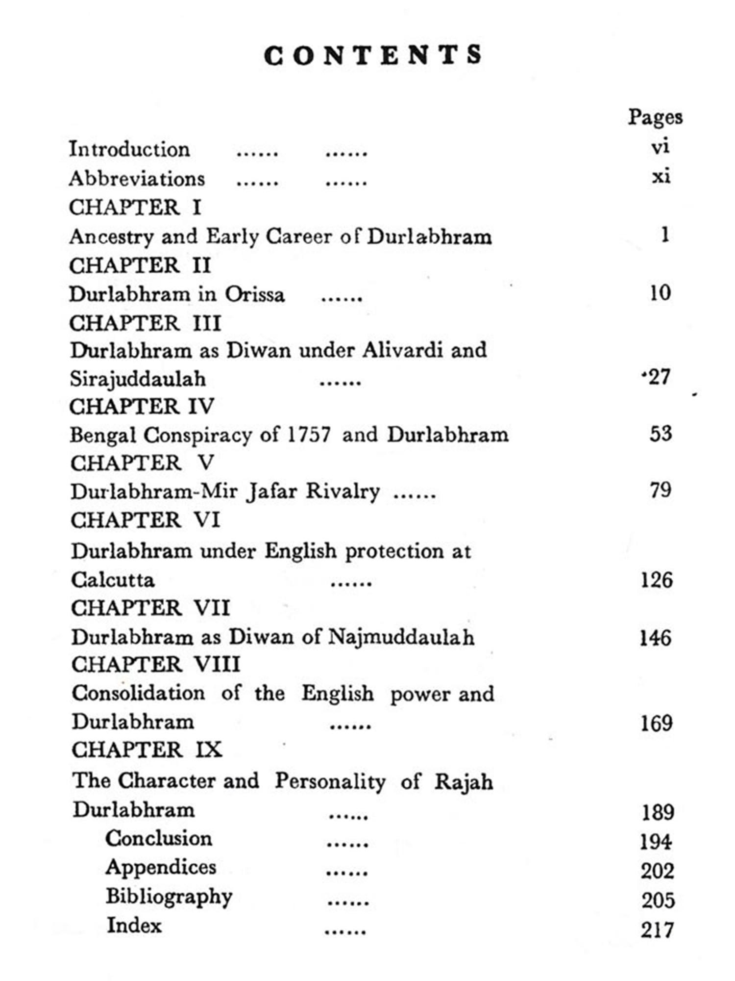 The political history of eighteenth-century India was marked by the break-up of the Mughal empire, the rise of several independent states; the expansion of the Marathas and the emergence of the East India-Company as a powerful factor in Indian politics. Among the states which asserted their independence the subah of Bengal, for a number of reasons, was most important. In 1756, after the death of Alivardi Khan, the young and inexperienced Sirajuddaulah succeeded to the marnad of Bengal. The incursions of the Marathas, the growing power of the Company and great discontent among the influential Hindus for which he himself was partly responsible made the position of the young nawab extremely difficult. Rajah Durlabhram (Rai Durlabh), to whose career the present study is devoted, played the principal role in the events that led to the overthrow of Sirajud-daulah and the establishment of British ascendancy in Bengal. Durlabhram held important positions under Alivardi and his successors. His success in holding on to positions of power and influence until his death in 1770 bears testimony to his abilities, especially to his shrewdness to realise that his interests lay in alignment with the British. He does not seem to have been inspired by any higher motives in shifting his allegiance and taking part in the revolutions which took place in Bengal. Financial advantages for himself and his family were the main considerations that determined his attitudes and policies. In the mid-eighteenth century even British about using their official po-In fact change in the govern-servants of the Company with administrators felt no qualms station for making a fortune government of Bengal provided the a coveted opportunity to make themselves rich.