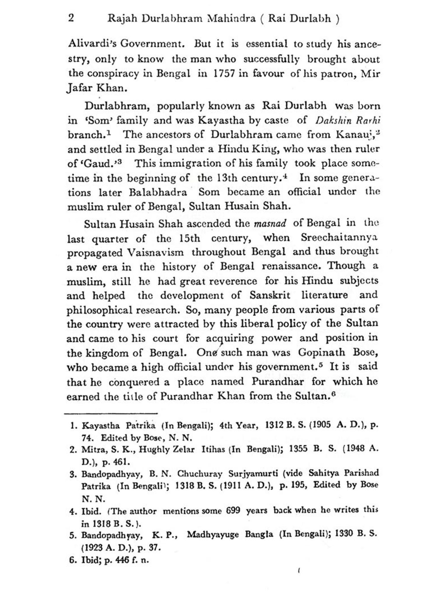 At that critical juncture of Indian History, Alivardi Khan usurped the masnad of Bengal in 1740. For his own interest, he wanted to establish peace and security in the realm. During his rule, he became a popular independent ruler. He employ-ed many Hindu Officers in his court and preferred the services of the Hindus for their skill in the revenue department of the state. The basis of his popular Government depended much on those Hindu Officials. One such Hindu Official, Rajah Durlabhram, became the Chief Diwen of the state and made his influence felt in the various Departments of the state upto his death in 1770. As the Rajah exercised and moulded the state policy to a considerable extent from behind the scene, a thorough investigation of his life and career is deemed essential. The career of Rajah Durlabhram acquired such prominence during that time that he was generally looked upon as the leader of the Hindus.
