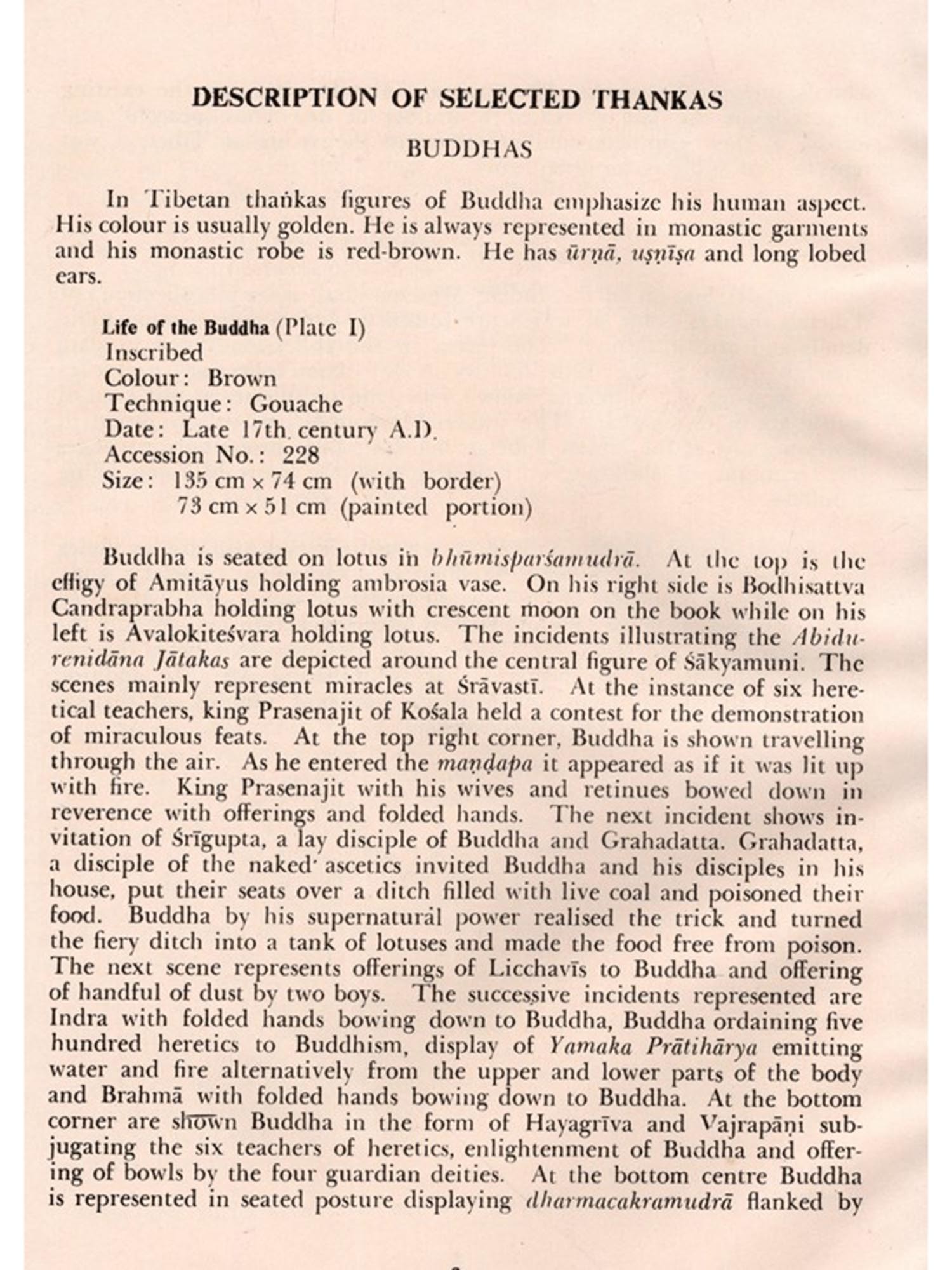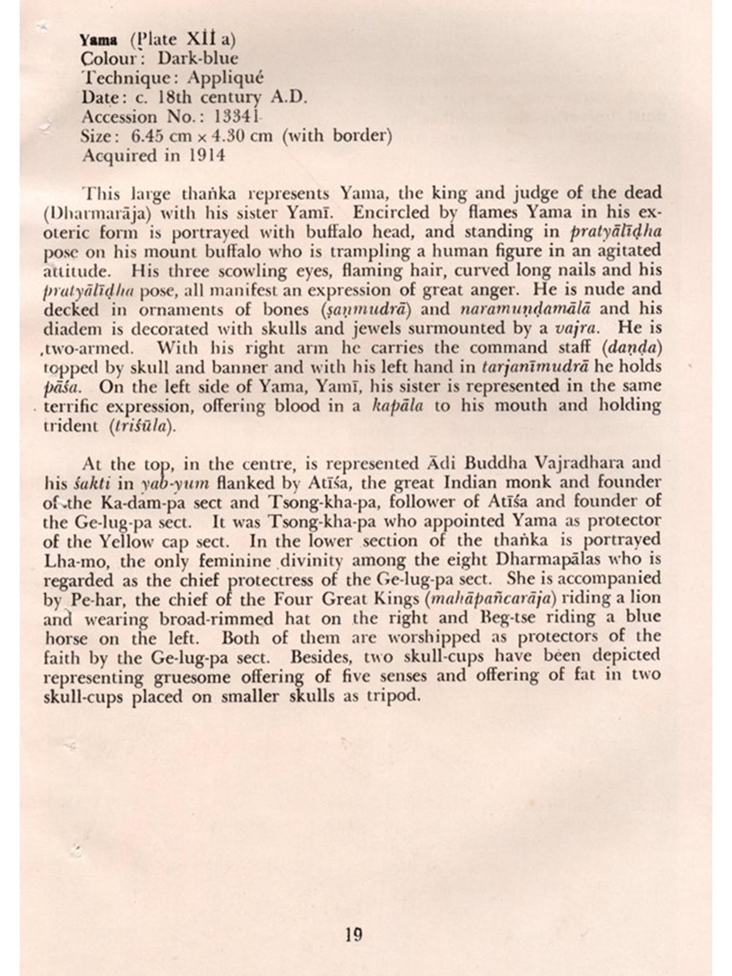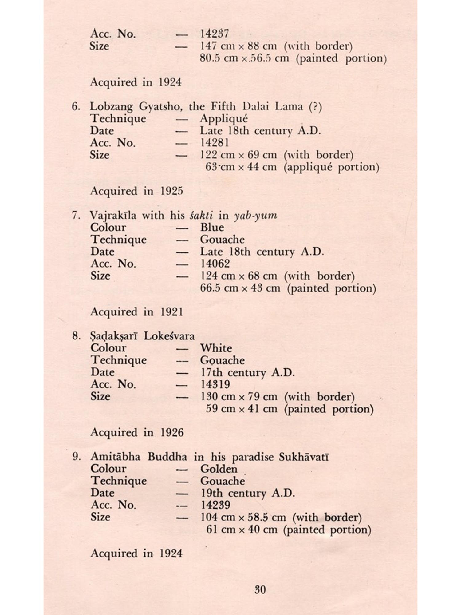 Indian Museum, Calcutta, possesses a moderately large collection of painted scrolls, to wit, about 150 odds produced in Tibet and Nepal, the bulk of which is preserved in the Art Section and the rest in the Archaeology Section, all collected between 1912 and 1974. These thankas depict gods and goddesses of Buddhist and Brahmanical pantheons, preachers of Buddhist faith and historical personages. A few specimens contain inscriptions as well. Of somewhat peculiar interest are those few thankas which may be classified as astrological thankas, the fortune-telling thankas played on with dice as a sort of game. A thanka that depicts the Kalacakra's story, a scene of battle between Buddhist King and the Muslims, is an uncommon specimen. The very large thanka having a size of 645 cm x 430 cm with the painting of Yama and Yami done in applique technique deserves special mention. Twenty-five of these thankas as displayed in the gallery are elaborately dealt with in this catalogue. Besides, a collection of ninety-two thankas in the Reserve of the Art Section has been eventually classified with identification of figures depicted therein as well as other relevant museological data. They range in date from 15th to 19th century A.D. Since Tibetan thankas are mainly undated and anonymous, the dates suggested here are tentative.