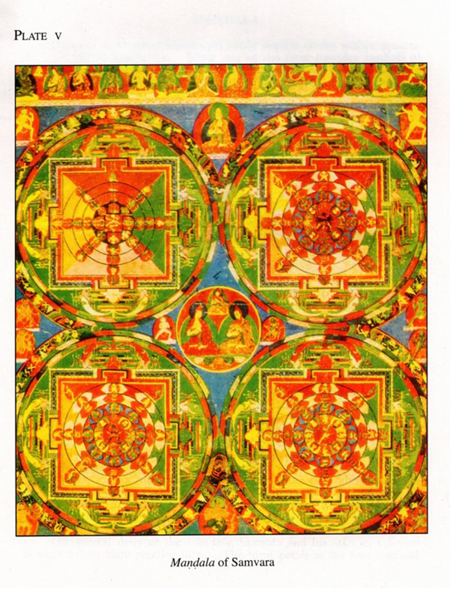 Tibetan art is best known by its thankas or scroll-paintings which are hung in temples or occasionally carried in processions or religious festivals. The term thanka is deduced from Tibetan ta' an ka or t' ansku, meaning something that is rolled up, to be specific, a rolled up image or a painted jconostasis The most popular term thanka has actually replaced its two other names ras bris or tas to moir design on cotton, both corresponding to the Sanskrit word pața. Painted on cotton, more rarely on canvas, generally rectangular in shape, a thanka is always rolled up from the bottom. Generally mandala thankas are square. The painted surface called melon or mirror is bordered by a Chinese silk or brocade. Inside this frame the painting is enclosed by two silk bands of red and yellow colour called 'red yellow rainbow symbolising a divine radiance. A square piece of cloth with figures of dragons or of lotuses applied at the bottom represents the door of the thanka or t' ansgo which signifies the sphere of cosmic waters In early thankas difference between length and breadth is less and border is shown only at the upper and the lower edge, the two sides remaining free. The thanka is stretched between two rods. The upper one is thin and the lower one is round and heavier with wooden or metal knobs at the ends. A thanka is generally provided with a thin piece of silk-covering so that the painting can be protected from damage, dust and dirt when it is not in use.