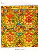 A group of thankas is again effected on uniformly gilded background. Embroidered thankas were however introduced in Tibet from China whereas thankas made of appliqué work were used from early times in Tibet. There is a reference in the Myancun to a large thanka made in the times of the kings of Gyantse which was shown in public and carried in processions during festivals. This kind of thankas are prepared by various pieces of cloth and sewn again into a sort of patch work com-posing figures of deities and monks. The fifth Dalai Lama also mentions a large thanka in his biography and he also records the names of the artists. The Tashilunpo monastery also possessed a large appliqué thanka which was ceremonially hung on a wall twice a year. Such large appliqué thankas were generally presented to the public at annual festivals. The thankas having a golden background are called gser t' an or golden thankas. Here the figures are sometimes drawn in black lines, sometimes represented in vivid colours. In some golden thankas figures are coloured with gold against a uniform red background.