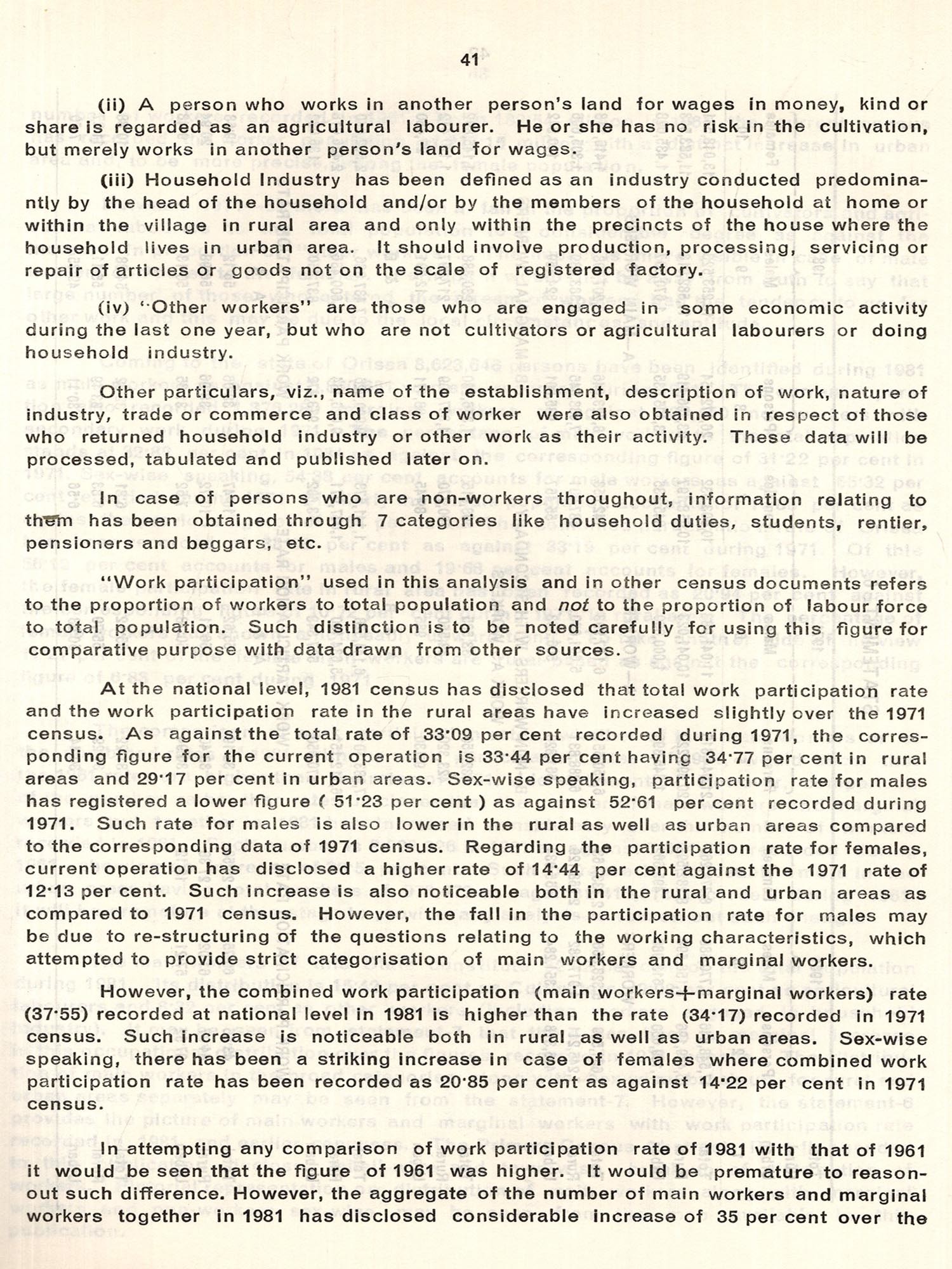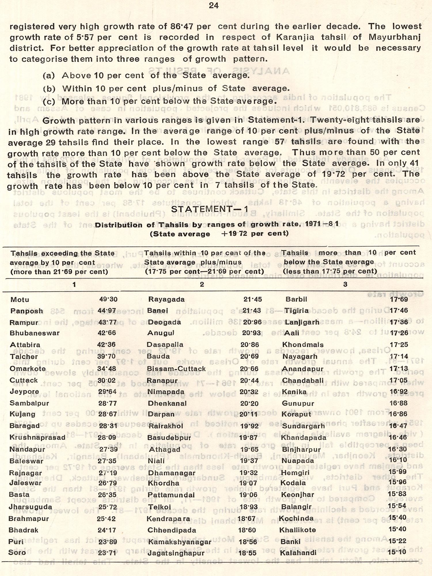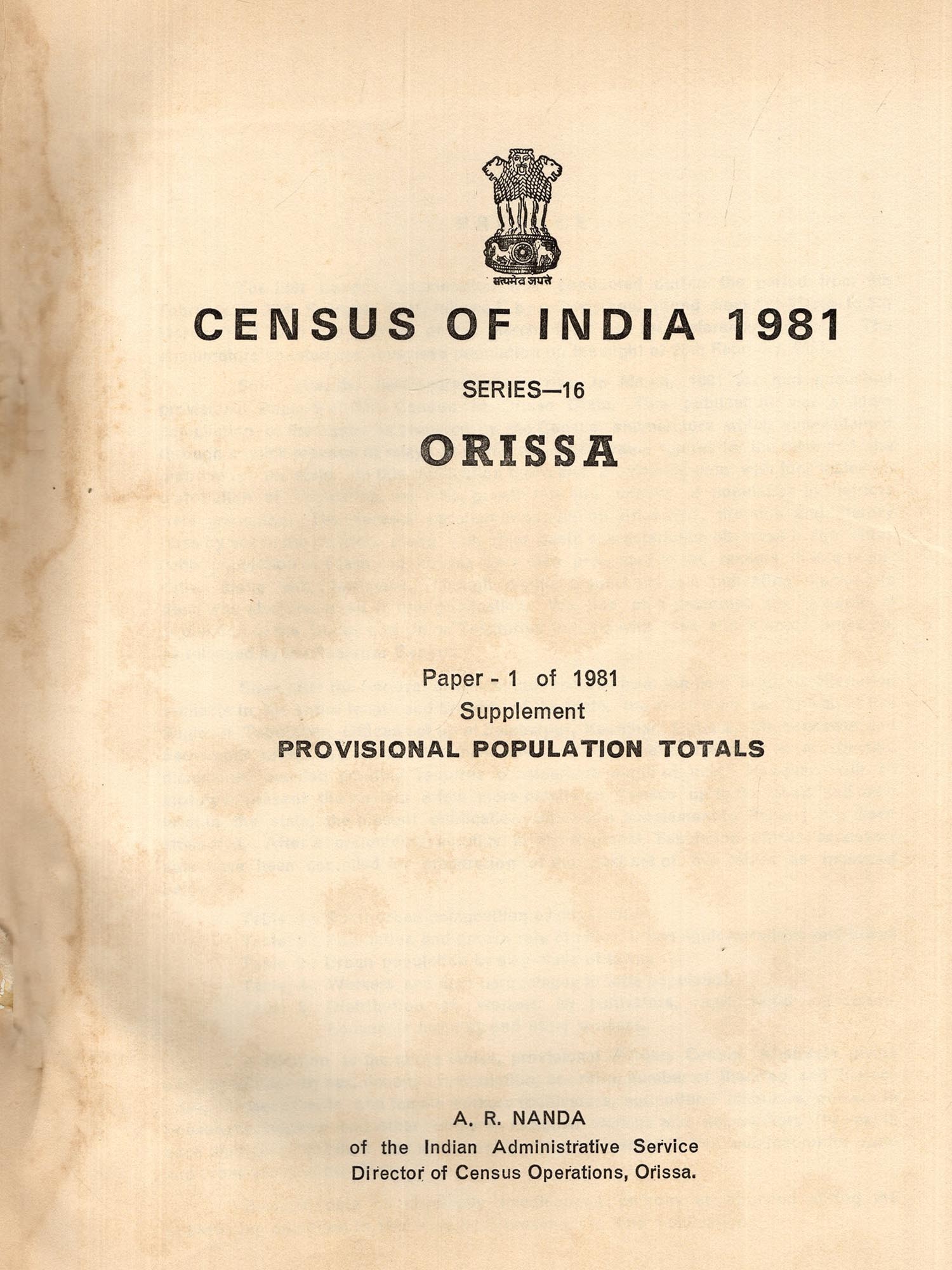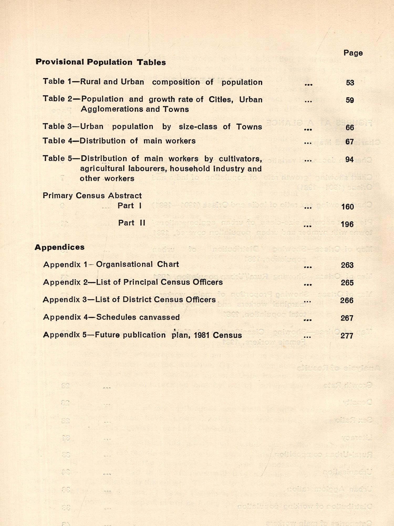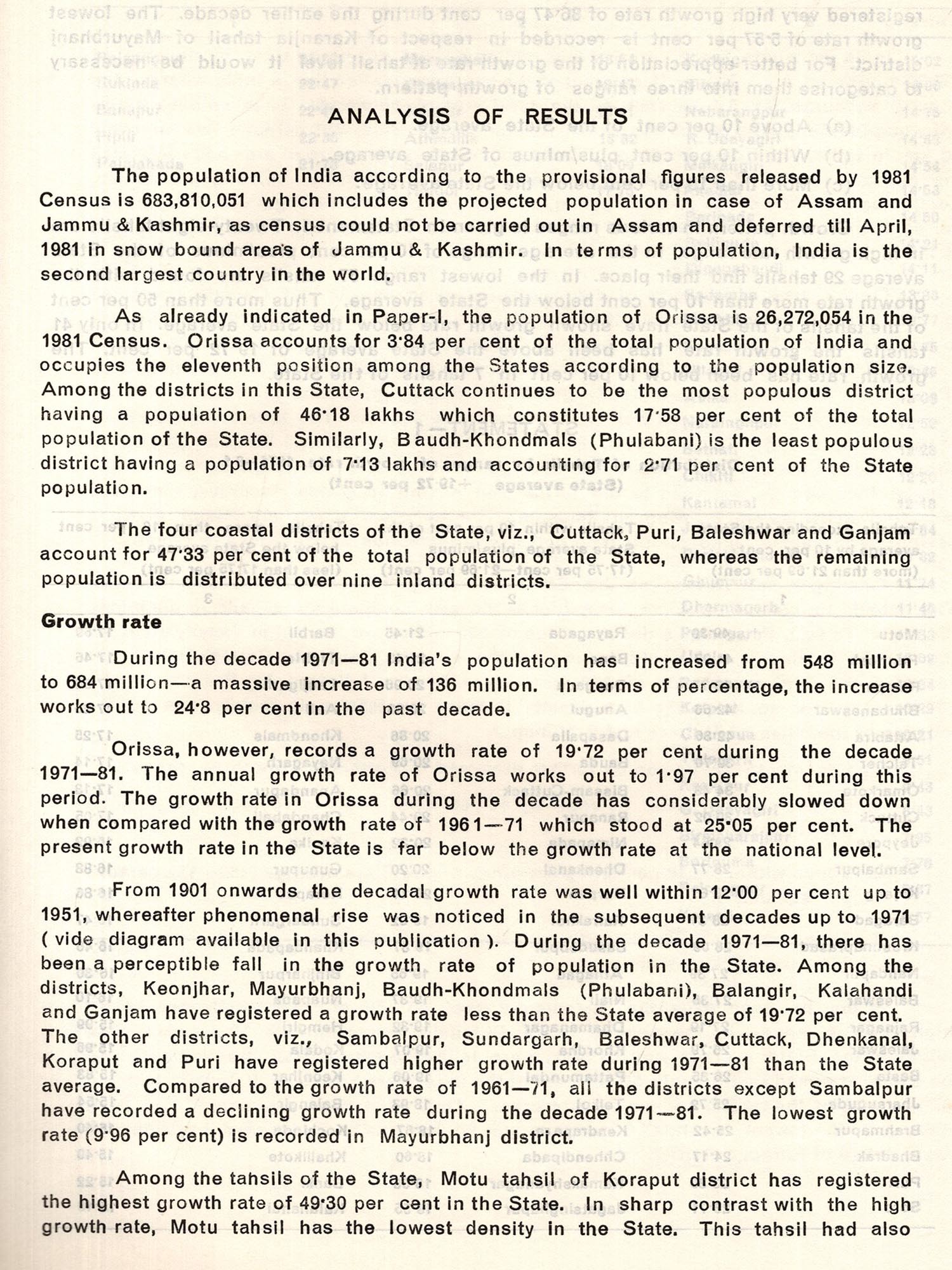 Soon after the field operation was over in March, 1981 we had published provisional Paper-1 of 1981 Census of Orissa State. This publication was a mere compilation of the abstracts prepared by the Census enumerators which were obtained through a quick process of relay. It contained consolidated figures for the state and the districts of the state. In this publication basic and provisional data with four tables on distribution of population, sex ratio, growth rate and density of population by districts were presented. The decadal variation in population since 1901, literates and literacy rates by sex in the districts along with other basic characteristics observed in the cities (with population of 1 lakh and above) were also presented to the readers in this publication along with a few maps. Though cryptic, a short analysis indicating discernible trend was also presented in this publication. We had also presented the provisional population of the States and Union Territories in India with sex and literacy break up, as released by the Registrar General.