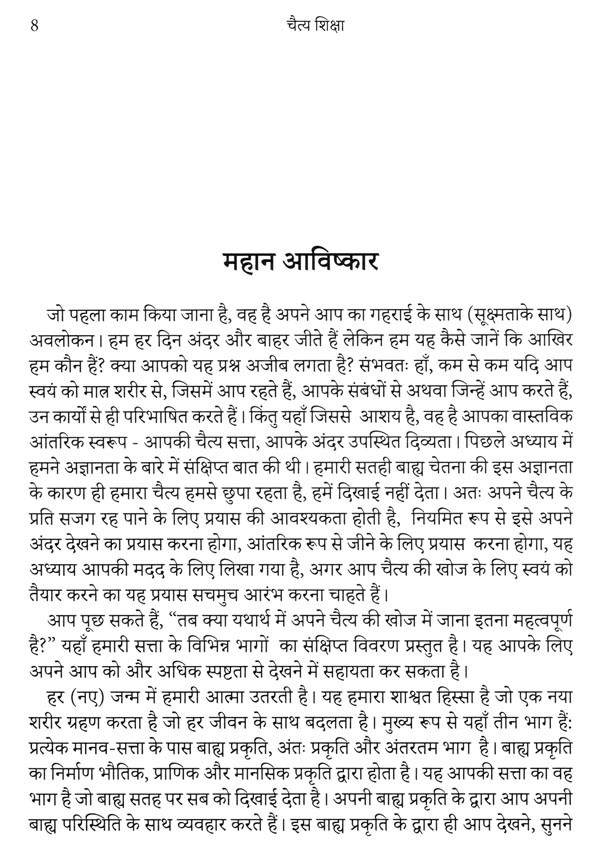 इस पुस्तक का भाग 2 विशेष रूप से शिक्षा से संबंधित है। पूर्णांग शिक्षा, जैसी श्रीअरविन्द और श्रीमाँ ने परिकल्पना की थी, आत्मा के चारों तरफ़ ही केंद्रित है। आदर्श स्थिति में शिक्षक की जागृत चैत्य सत्ता ही छात्रों के लिए चैत्य शिक्षा का परिवेश तैयार करती है। निःसन्देह रूप से अपनी चैत्य सत्ता को ढूँढ़ पाना भागवत कृपा पर निर्भर करता है, और कोई इस खोज की तीव्र अभीप्सा के बावजूद तुरंत परिणाम पाने की माँग नहीं कर सकता है। इसमें वर्षों लग सकते हैं, एक से अधिक जीवन लग सकता है, आत्मा की खोज में। परन्तु, यह भी सच है कि कोई पूर्णांग शिक्षा की शुरुआत का अभ्यास तब तक नहीं कर सकता है, जब तक उसने कम से कम अपने अंदर आत्मा की खोज शुरू न कर दी हो।