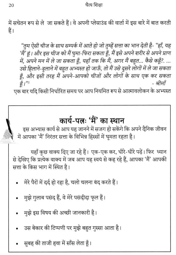 इस पुस्तक के अभ्यास कार्य श्रीअरविन्द आश्रम (पांडिचेरी) में प्ले-ग्राउंड के प्रश्नोत्तर सत्त्रों के दौरान श्रीमाँ के द्वारा दिये गये अभ्यास कार्यों पर आधारित हैं। इनमें से कई प्रश्नोत्तर अद्भुत सहायता प्रदान करते हैं जब हम अध्यात्मिक-पथ पर होते हैं। आत्मनिरीक्षण सम्बन्धी प्रश्न, कार्य-पत्न और जाँच-सूची पिछले बीस वर्षों से मीरंबिका में तैयार की गयी हैं। ये कार्य-पुस्तिका और जाँच-सूची आपको स्पष्टता लाने में और अपने प्रयास को मजबूत बनाने में मदद करने के लिए हैं।