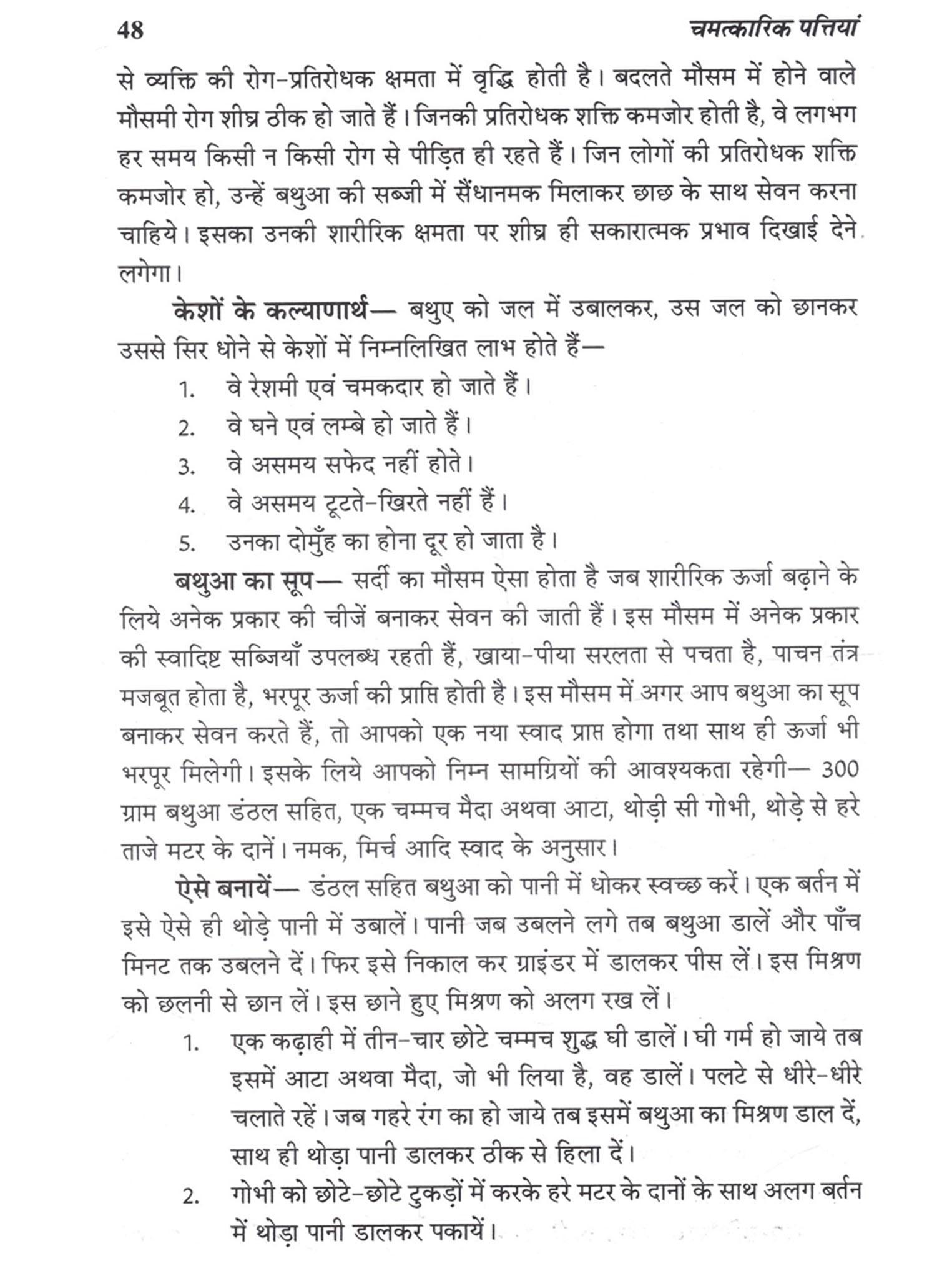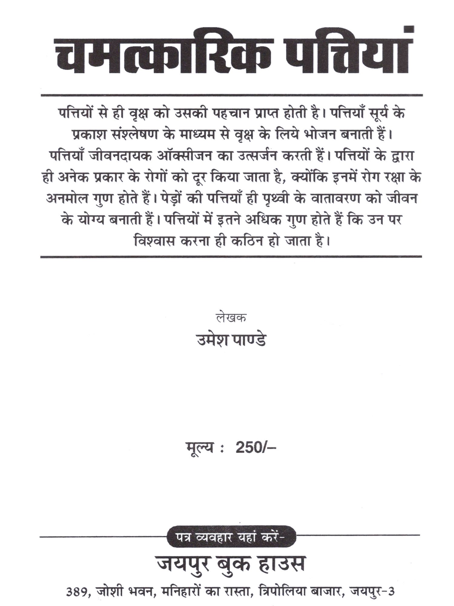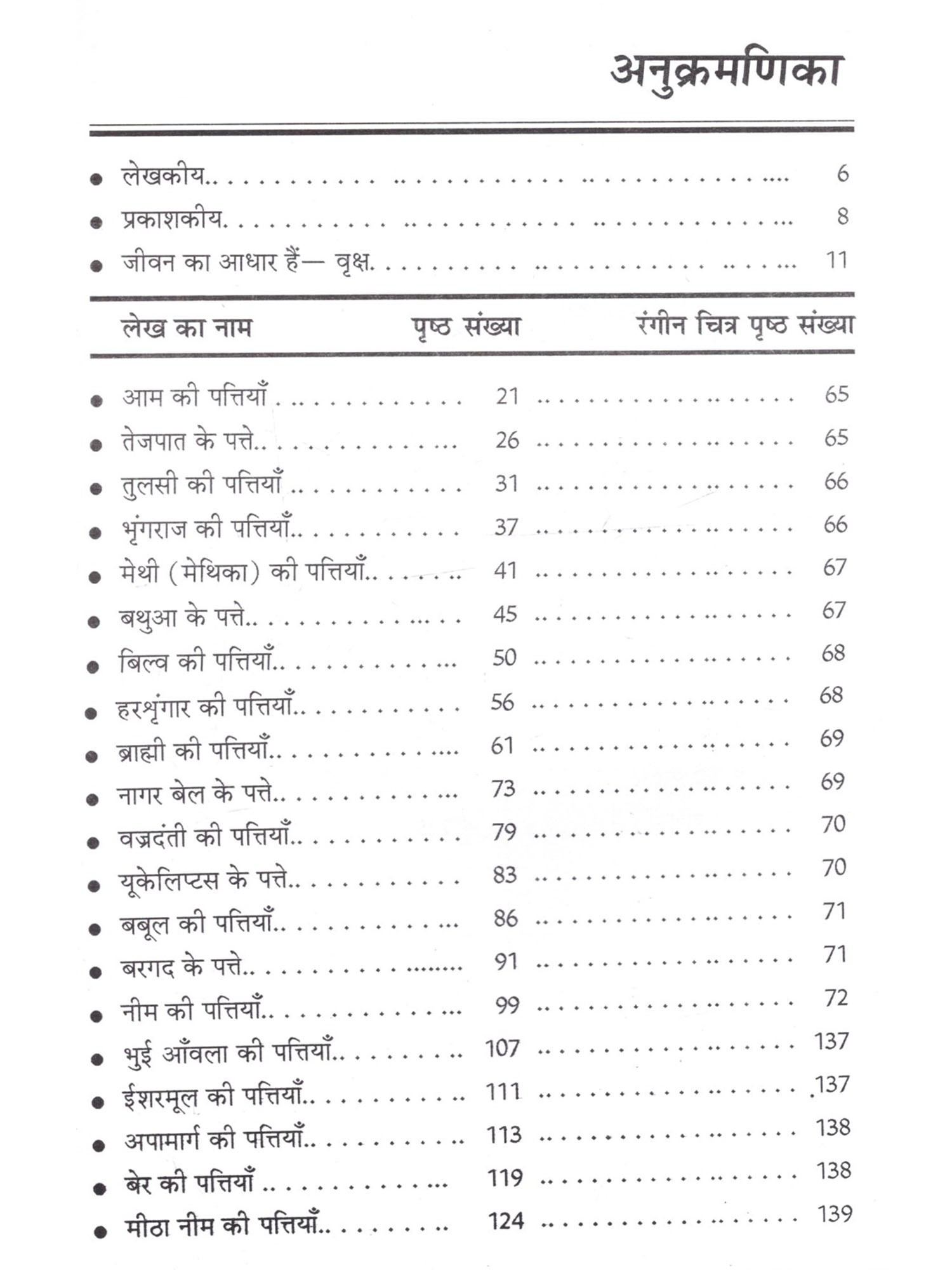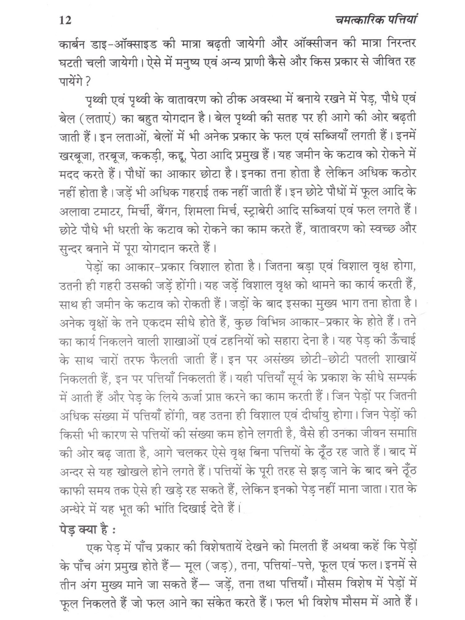 इस सम्पूर्ण जगत में सूक्ष्म अथवा दीर्घ प्राणों और पौधे यह दो ही जीवित है, शेष समस्त वस्तुएँ अजीवितों की श्रेणी में आती हैं। हमारे प्राचीन ऋषि-मुनियों ने वृक्षों के सम्बन्ध में अनेक दिव्य बातों का अथवा तथ्यों का वर्णन किया है, जो मानव के लिये सर्वथा कल्याणकारी हैं। हमारे प्राचीन ग्रंथ पौधों के गुणगान से भरपूर हैं। उनमें कई तथ्य ऐसे भी हैं जो हमारी समझ से परे हैं, किन्तु उन सभी बातों में बहुत दम है। उदाहरण के लिये कहा गया है कि जिस व्यक्ति के घर में बिल्व का एक वृक्ष लगा होता है उसके यहाँ साक्षात् लक्ष्मी का वास रहता है अर्थात् उसके यहाँ अर्थ सम्बन्धी बाधा खड़ी नहीं होती। इसी प्रकार जिस घर की सीमा में पलाश, कंचन, अर्जुन, करंज एवं शूल युक्त पौधे होते हैं वहाँ शांति रहती है। इसी प्रकार घर की सीमा में बेर का वृक्ष होना परिवार के सदस्यों के बीच बैर उत्पन्न करता है, शत्रुता पैदा करता है। घर की सीमा में बबूल, खैर एवं बांझ अनार के वृक्ष होने से वहाँ के बच्चों को कष्ट उठाना पड़ता है। ऐसे घर में बच्चों को कई बीमारियाँ होती हैं। जिस घर की सीमा में निर्गुडी का वृक्ष होता है, वहाँ सुख-शांति बनी रहती है। उस घर में कोई असामान्य बाधा नहीं होती। इसीलिये इस पौधे को संभालू भी कहा गया है। कहा गया है कि घर में रेगिस्तानी पौधों का होना शत्रु बाधा, अशांति एवं धनहानि कारक होता है। कैक्टस के पौधे इसी श्रेणी में आते हैं। वृक्षों के रोपण के सम्बन्ध में कहा गया है कि जो व्यक्ति अपने घर से इतर दो बरगद के वृक्षों का रोपण करता है, उसके अनेक पापों का शमन होता है। आमलक वृक्ष को लगाने से व्यक्ति की जमीन सम्बन्धी परेशानियाँ दूर होती हैं, फिर उस व्यक्ति चमत्कारिक पत्तियां 7 यूँ तो वृक्षों के समस्त अवयव अर्थात् जड़, तना, पत्ती, फल, फूल इत्यादि सभी परम उपयोगी होते हैं, किन्तु मूल रूप से अधिकतर वृक्षों की जड़ एवं पत्तियाँ प्रधान रूप से परम उपयोगी होती हैं, क्योंकि किसी भी वृक्ष के मूल प्राण तत्व उसकी जड़ अथवा इसकी पत्तियों में होते हैं, शेष भाग इन प्राण तत्त्वों को नीचे से ऊपर पत्तियों तक ले जाने का कार्य करते हैं। जड़ें जमीन के अन्दर होती हैं, जबकि पत्तियाँ प्रकट रहती हैं, दिखाई देती हैं। पत्तियों से ही सबसे ज्यादा गैसों का उत्सर्जन एवं अवशोषण होता है अर्थात् पत्तियाँ ही कार्बन डाइऑक्साइड का शोषण करती हैं और पत्तियाँ ही ऑक्सीजन को उत्सर्जित करती हैं जिससे वातावरण प्राणवायु से भरा होता है। औषधि रूप से भी पत्तियों का बहुत ज्यादा महत्त्व होता है और न यह केवल औषधियां उपयोग हेतु होती हैं बल्कि इनसे अनेक दूसरे कार्य भी होते हैं। उदाहरण के तौर पर कुछ पत्तियों द्वारा हवन करने से घर की ऋणात्मक ऊर्जा समाप्त होती है एवं घर में सकारा