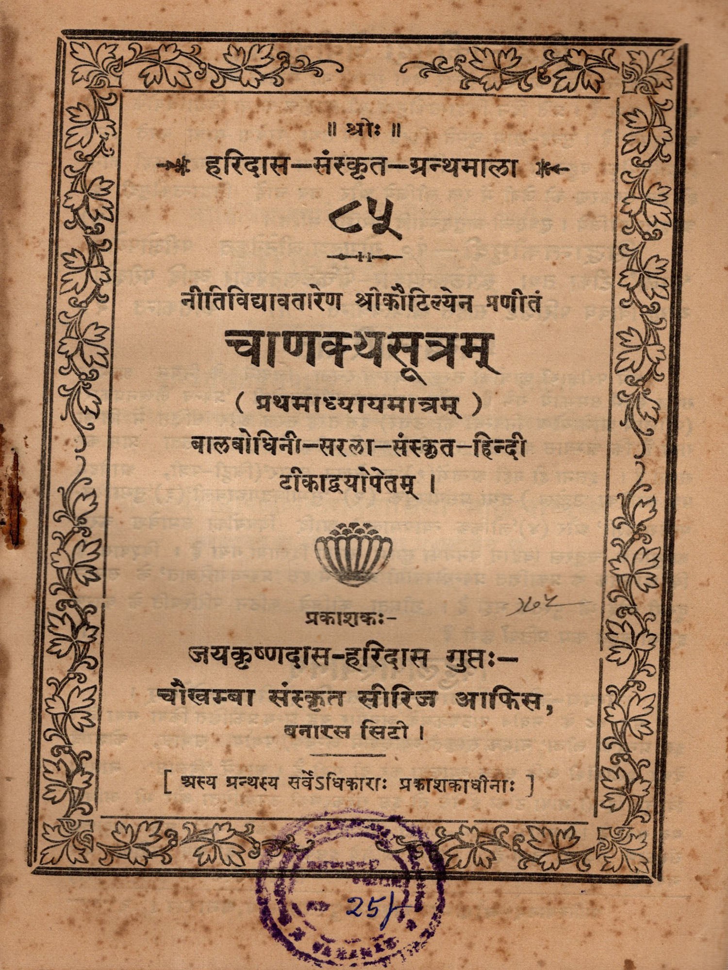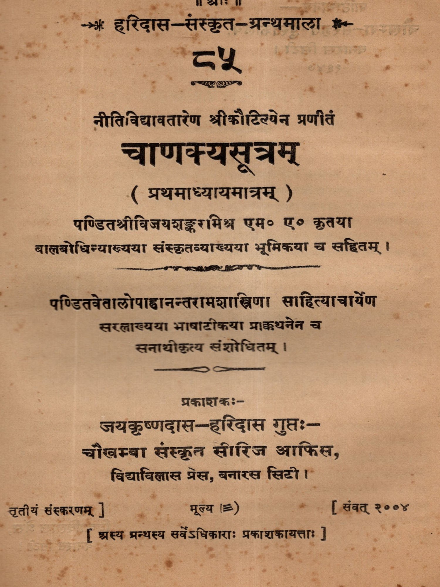 चाणक्यसूत्रम् (प्रथमाध्यायमात्रम्): Chanakya Sutra (Chapter 1 Only) With Two Commentaries on Balabodhini and Sarala in Sanskrit and Hindi (An Old and Rare Book)