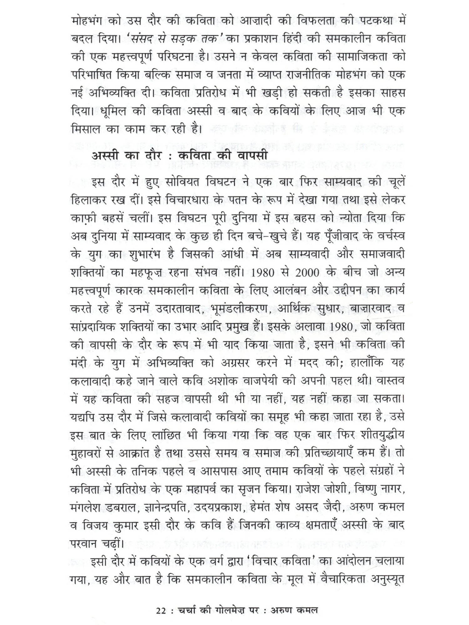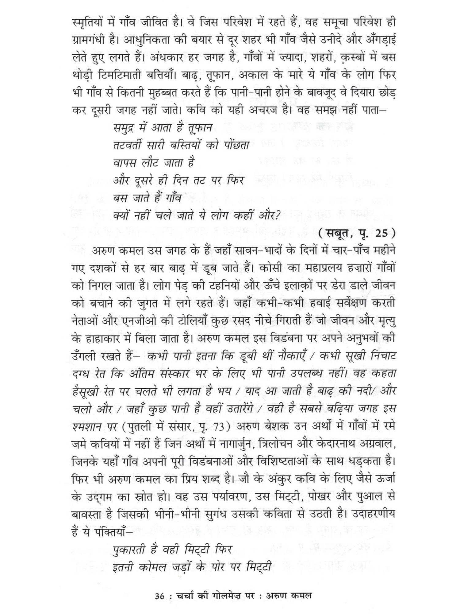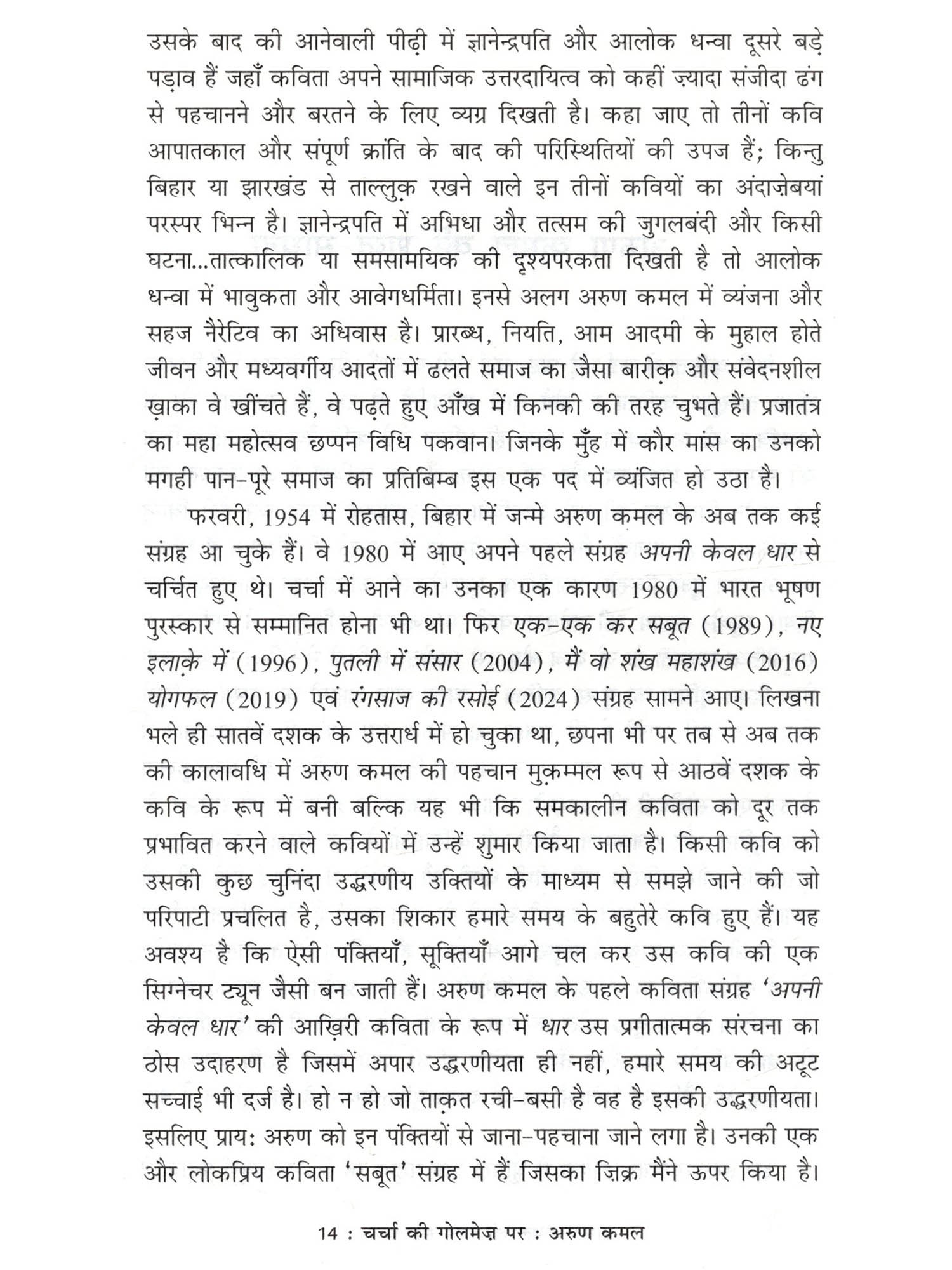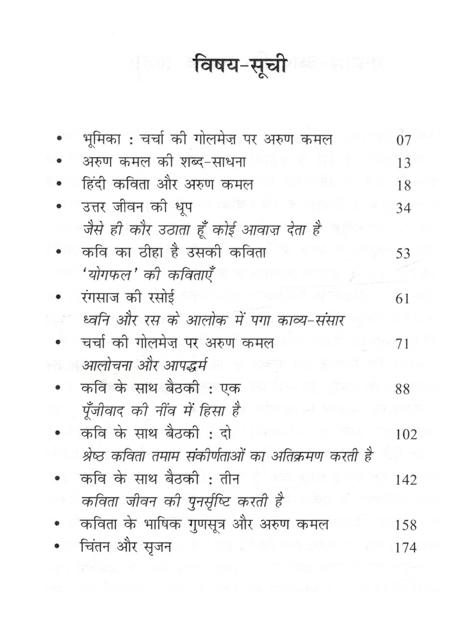 हिंदी के सुधी कवि, समीक्षक, भाषाविद ओम निश्चल ने दशकों से कविता की काया और अंतःकरण में रमते हुए अरुण कमल के कवि वैशिष्ट्य का जैसा सुपाठ यहाँ किया है, वह अन्यत्र दुर्लभ है। 'चर्चा की गोलमेज पर अरुण कमल' एक ऐसी कृति है जो एक साथ आलोचना और काव्यास्वाद दोनों रसों से परिपूर्ण है। जिस तरह कविता के नाप की भाषा अरुण कमल के पास है, वैसी ही सुपठनीय हलोरी-पछोरी हुई भाषा में ओम जी ने अरुण कमल की कविता के विवेचन को एक उदात्त भाष्य में बदल दिया है।