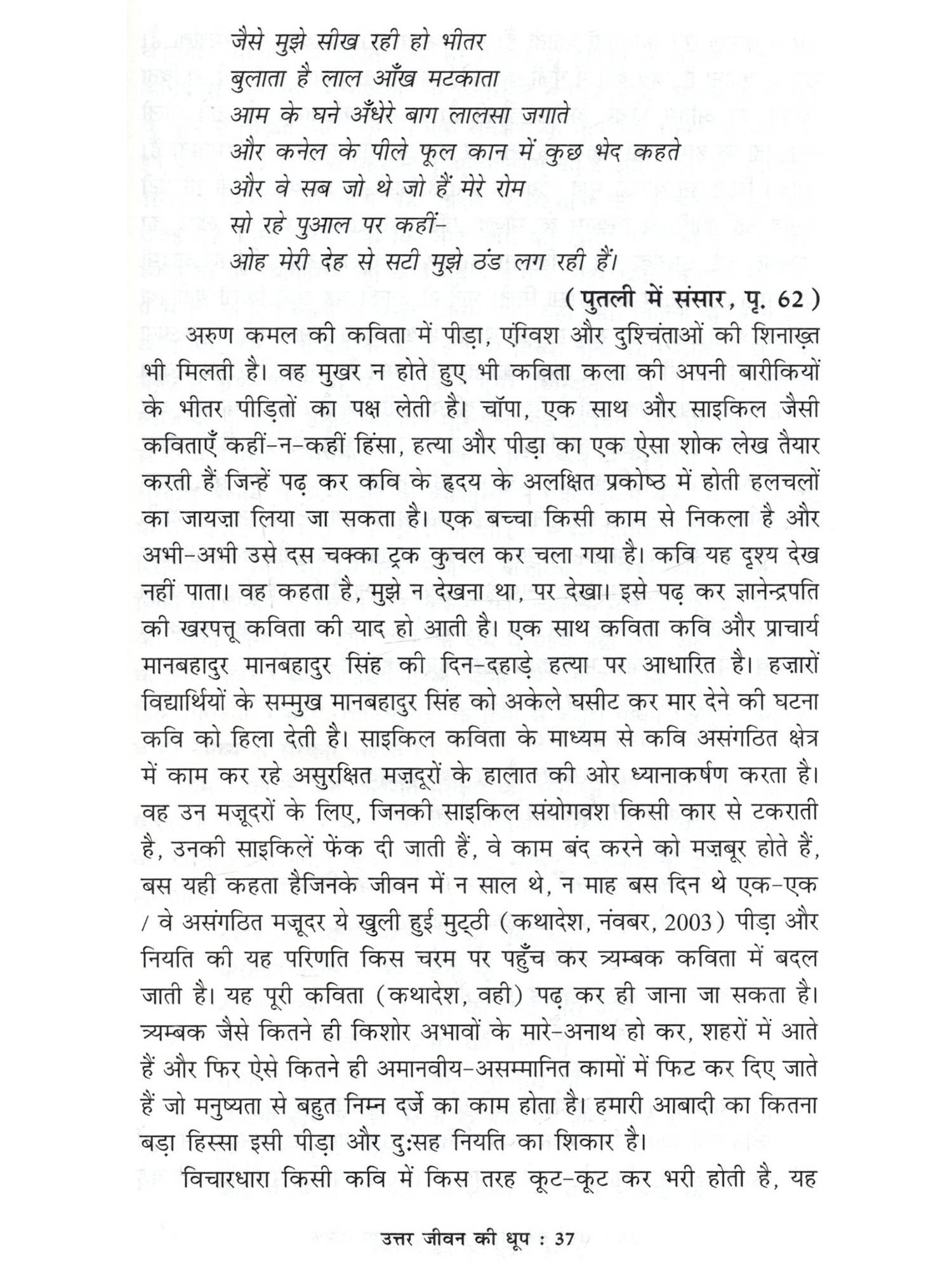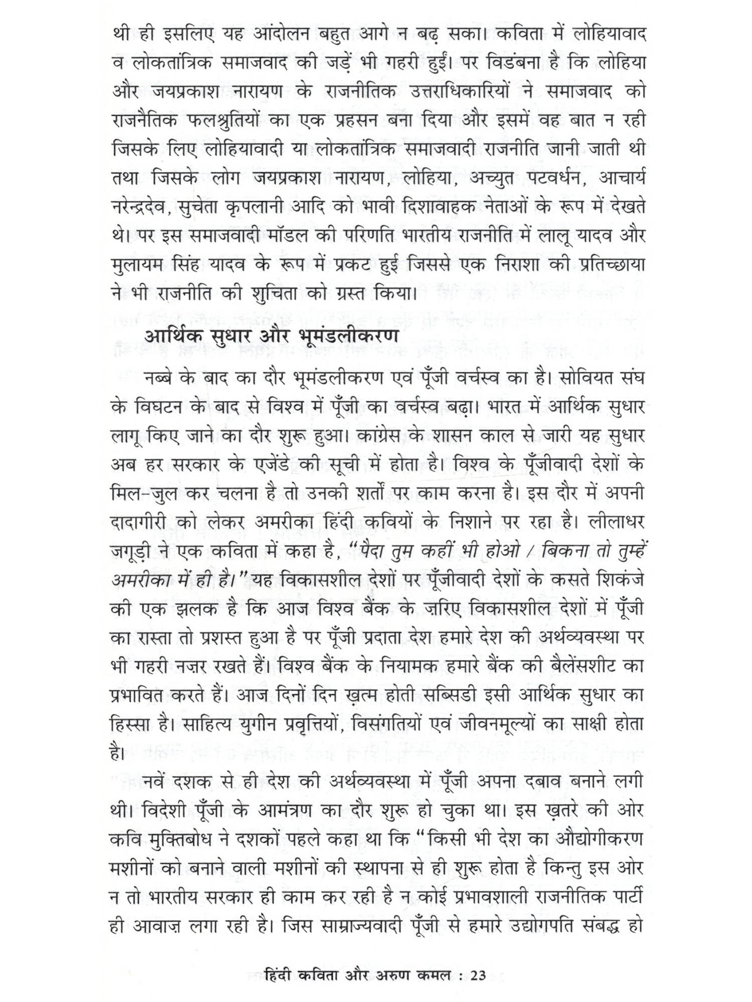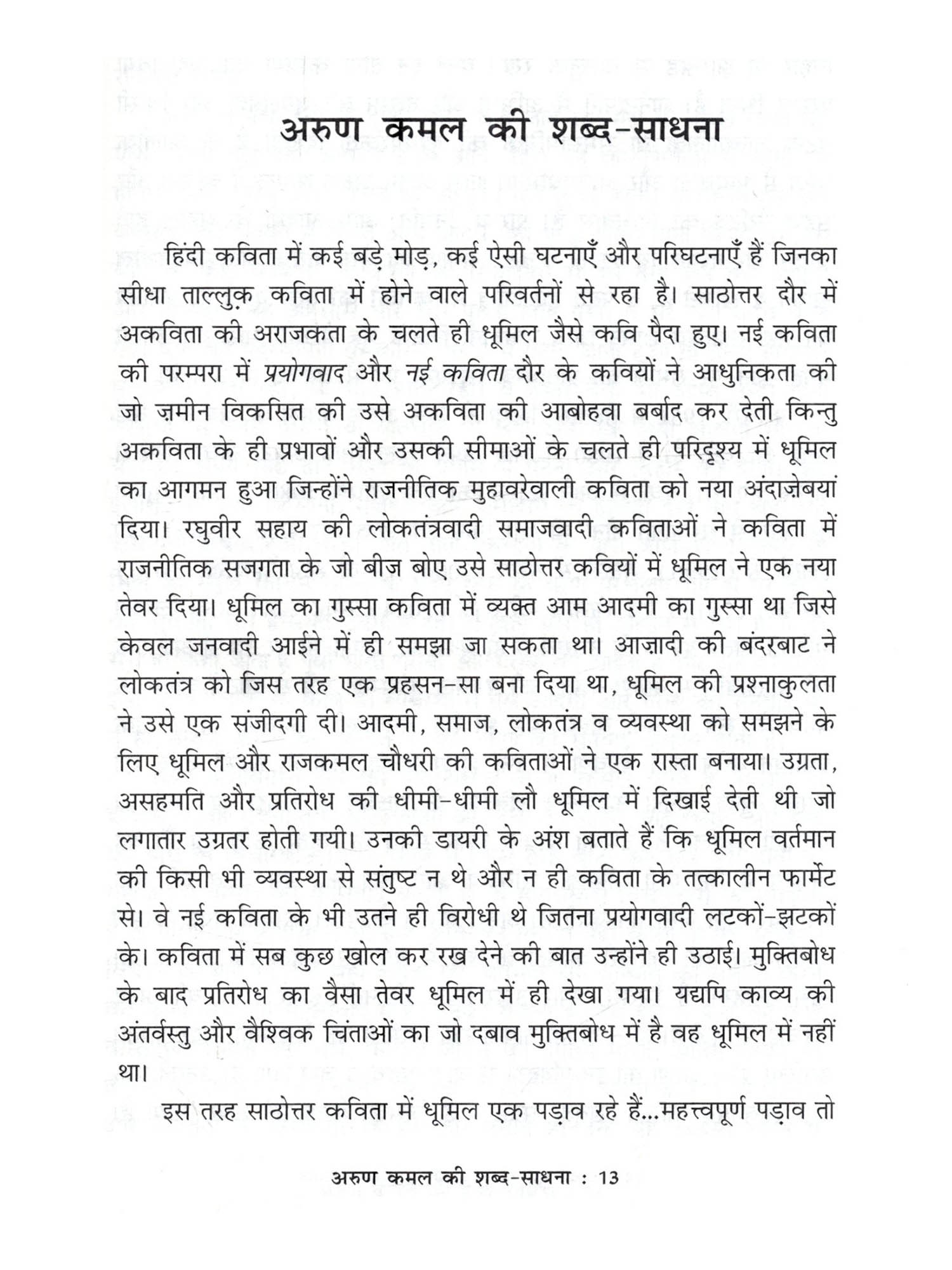 कविता का अरुण कमल आठवें दशक के आरंभ में कविता के क्षितिज पर अरुण कमल का आगमन कई दृष्ठियों से कविता के लिए मंगल सूचक रहा है। राजनीतिक प्रभावों और आंदोलनों के बीच गुजरते समय के संकट को पहचान लेने और उसे कविता में पिरोने का जो सलीका उनके पास है वह अचूक और अनिंद्य है। वे अद्वितीयता के सर्जक होने के नाते अपने 'स्व-भाव', 'वाक्संधि' और 'वाक्मुद्राओं' के कबि तो हैं ही, पुरा और अधुनातन में रमते विचरते हुए वे पुनः पुनः 'स्व-भाव' में लौटते और अपनी कविता का छेद पुनराविष्कृत करते हैं। कविता का यह अरुण कमल हिंदी ही नहीं, अन्य भाषाओं में भी न मिलेगा। अपनी ध्वन्यात्मकता से मोहाविष्ट करने वाले, समय की देह के साथ पीड़ित अंतरात्मा के अतल में उतरने वाले अरुण कमल को पढ़ना, उन्हें समझना कविता की कोख से उपजे जीवन-सारांश को समझना है।