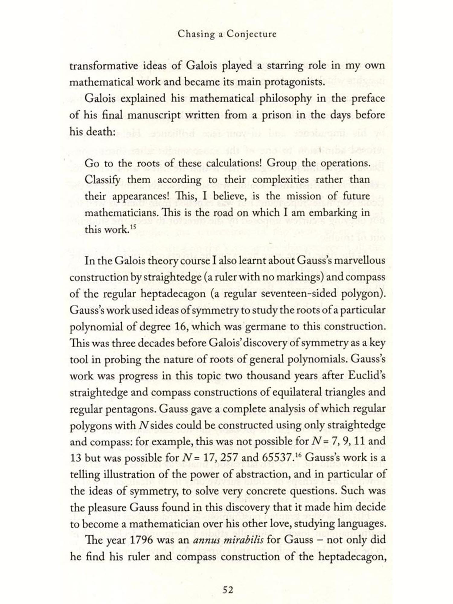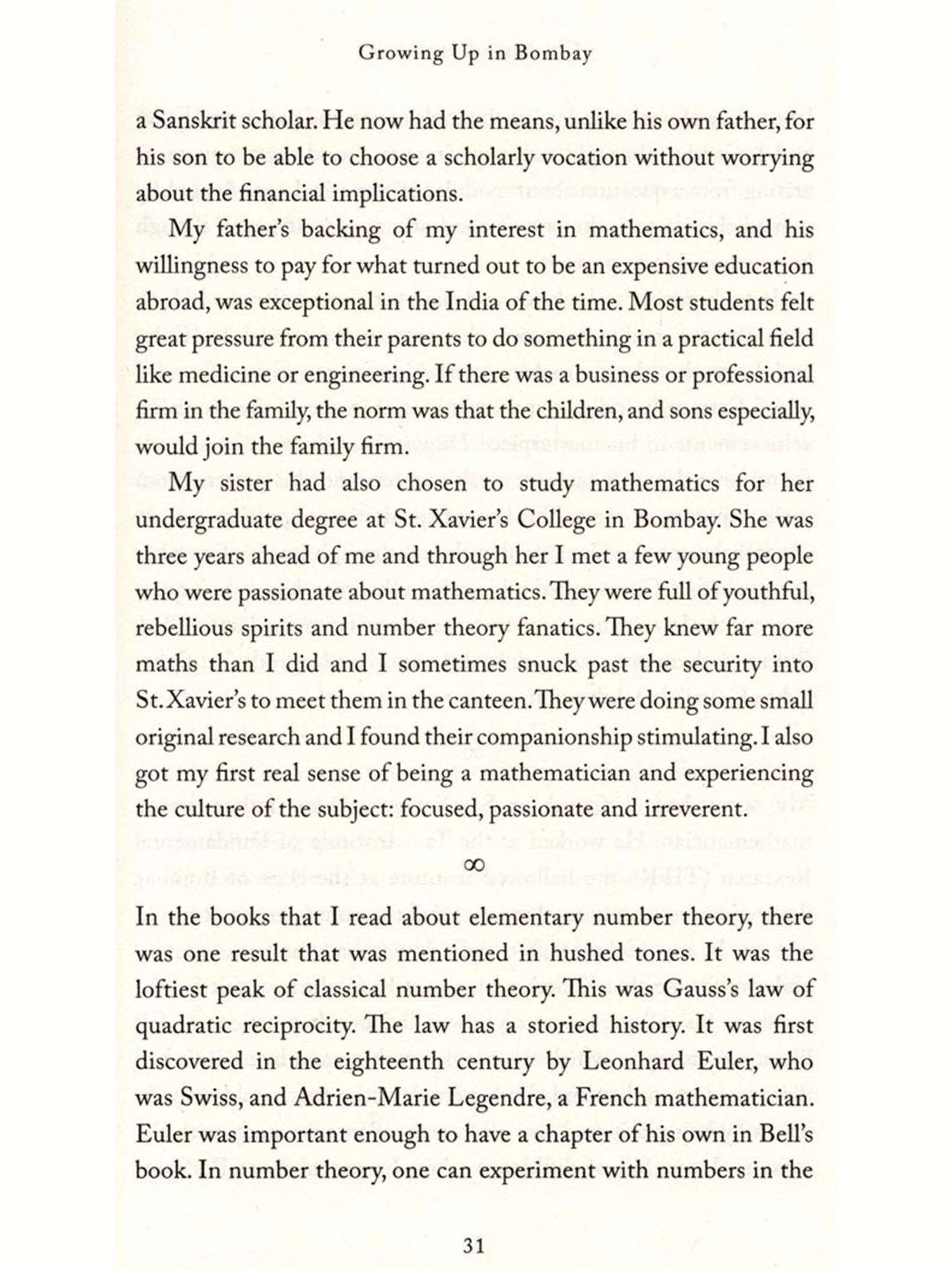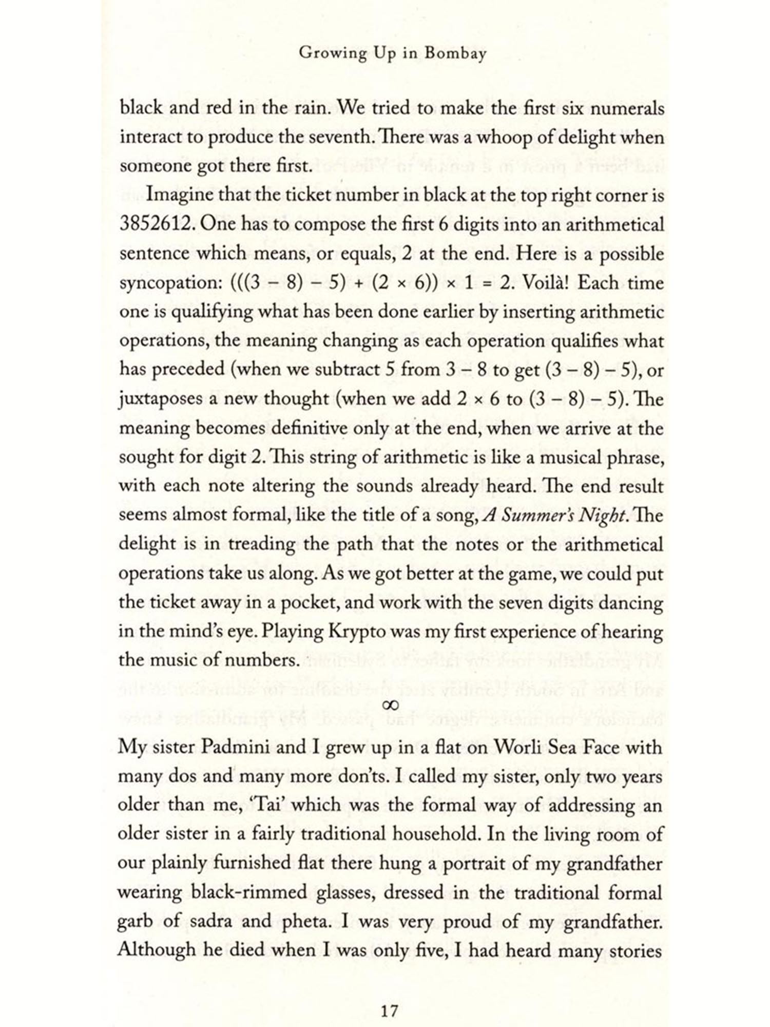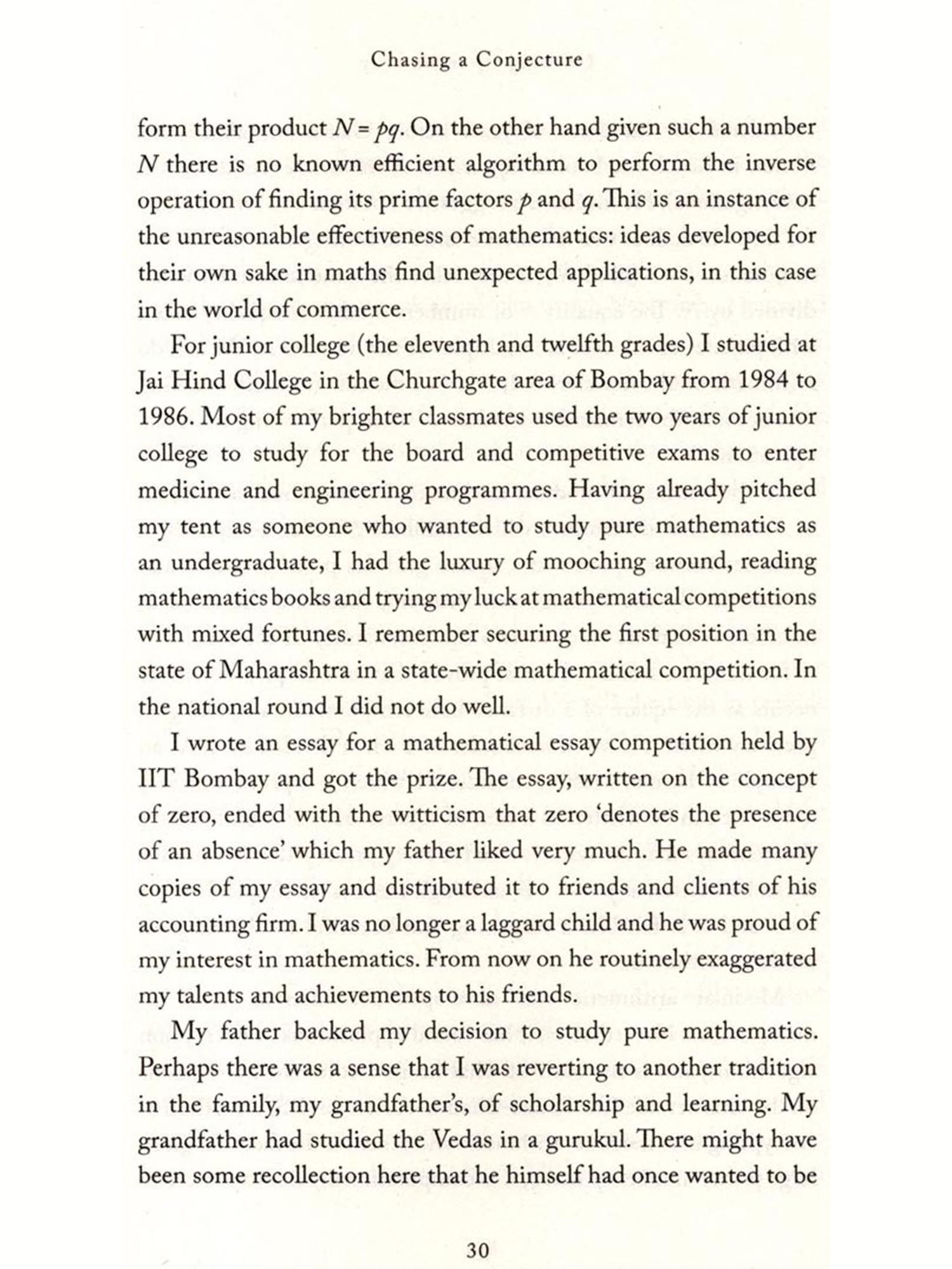 A conjecture is like an unfulfilled fantasy in the world of pure mathematics where the most fantastic things happen routinely. Proving a conjecture is like trying to make a fantasy come true, and it can consume a mathematician for years, just as the effort to produce a great work of fiction, music or art can take over the life of its creator. This unusual, beguiling memoir is about such a journey. It begins with a child growing up in Mumbai, fascinated by mathematics, and ends with a man, just turned 40, winning a prestigious prize for proving, with a fellow-traveller, one of the most important conjectures in number theory the branch of mathematics that studies whole numbers. In this compelling account, Khare illuminates a quest that might seem impossibly esoteric to the outsider, but seen through his eyes, becomes palpably real and human. At its core, this is a book about the creative process; the mysterious ways by which ideas arise in the mind and take flight, amid many false starts and obstacles. While this undoubtedly requires solitude, a lot of the action also takes place in a delightfully collaborative atmosphere, across continents, which Khare evokes vividly. Paraphrasing a famous mathematician, Khare says, 'It is the person and not the method who solves a mathematical problem.' So, appropriately, this book is also about a person, most poignantly about a man navigating the push and pull of creative ambition while trying to fulfil personal commitments such as wanting to be with his ill mother in Mumbai.