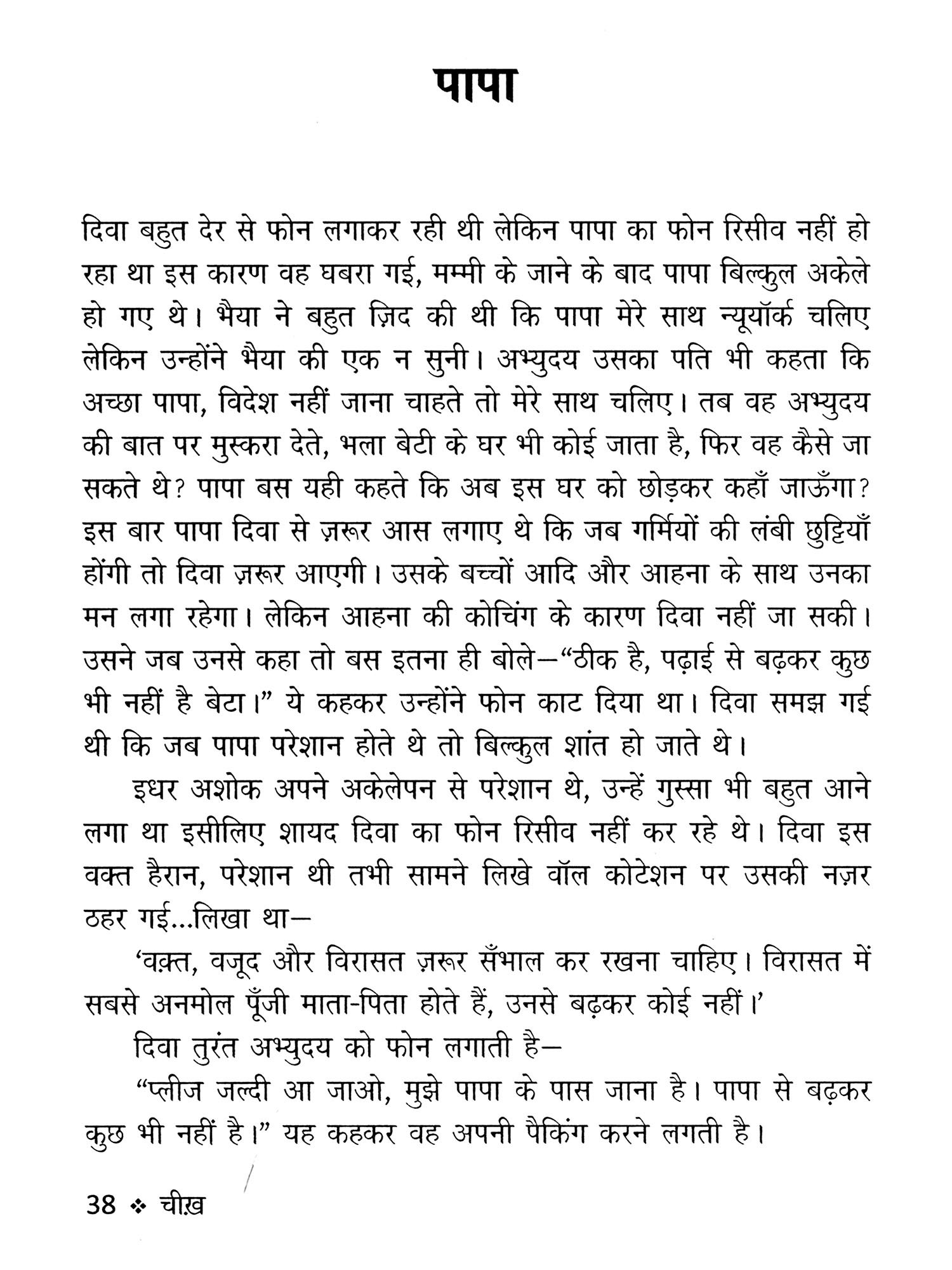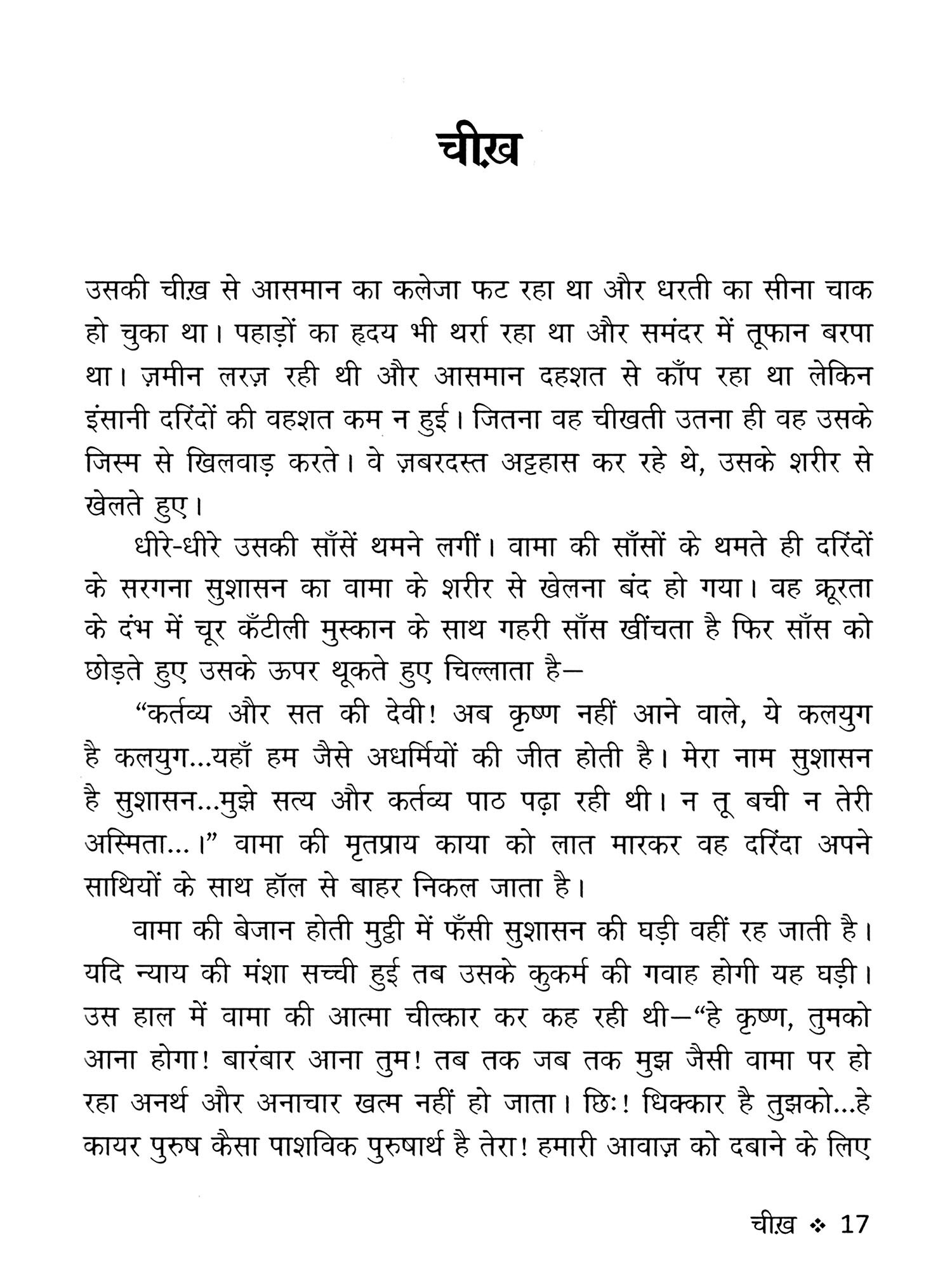 कोशिश बस इतनी सी है कि जिक्र इनका करें तो कैसे करें? बात जब निकली है तो बात इनकी भी होनी चाहिए। मेरा लघु कथा-संग्रह 'चीख' को रचने का उद्देश्य उक्त प्रश्नों से संबंद्ध है। मेरा प्रयास यकीनन यही है कि मैंने अपने इस लघु कथा-संग्रह 'चीख़' में जर्द पीले पत्तों के गिरने के दर्द को बाँटने की कोशिश की है। जिन आँखों का पानी सूख गया है वह इतनी खुश्क हो गई हैं कि रोना चाहें भी तो रो नहीं सकतीं। मैंने इन खुश्क आँखों को पुरनम करने हेतु उसकी बेबसी के बिंदुओं को खोज उन्हें इस संग्रह में दर्ज किया है। लोग कहते हैं टूटा हुआ दिल भी कभी जुड़ा है भला? जी हाँ अगर सकारात्मक सहयोग, साझा साथ हो तो टूटे को भी जोड़ा जा सकता है। इस लघु कथा-संग्रह में मैंने टूटे हुए दिल के टुकड़ों को सहेजने की भरसक कोशिश की है। रीत चुका जिनका समय, बोसीदा किताब की तरह खस्ताहाल है जिनकी जिंदगी, जिन्हें चाहकर भी हँसाना मुश्किल हो। उदासी जिनका ओढ़ना-बिछौना हो। थोड़ी-सी कोशिश है इस लघु कथा-संग्रह के माध्यम से ऐसे उदास चेहरों पर मुस्कान लाने की।