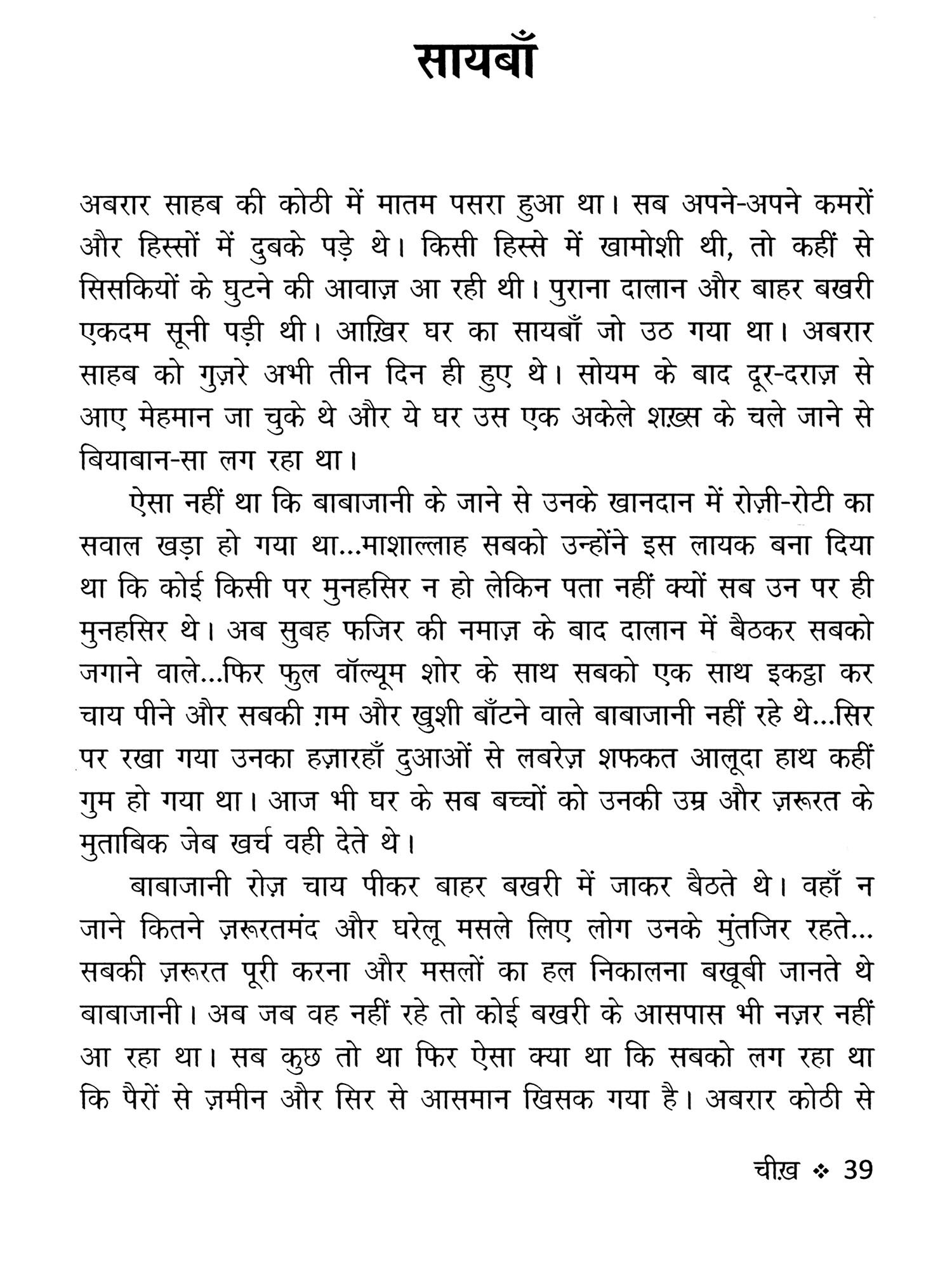 "जर्द पत्ते दहशतजदा हैं कि पेड़ से गिर कर कहाँ जाएँगे खुश्क आँखों की बेबसी देखो आँख रोती है मगर उसके आँसू नज़र आते नहीं दिल टूट कर टुकड़े-टुकड़े है और पैरहन लहू में नहाया हुआ बोसीदा जिंदगियों के चेहरों में उदासी का डेरा ठहरा सा है उनके होंठों से हँसी गायब है।"
