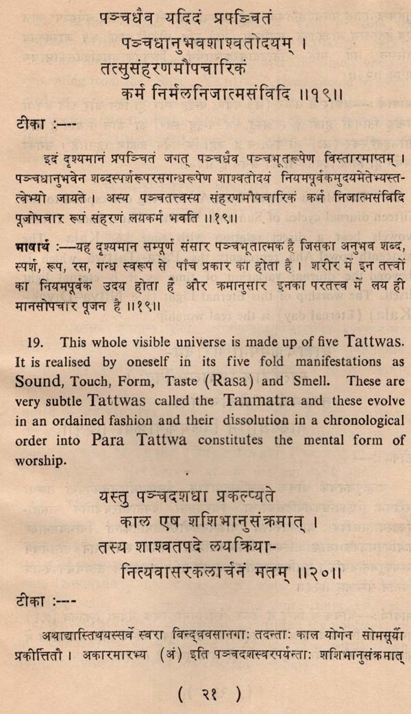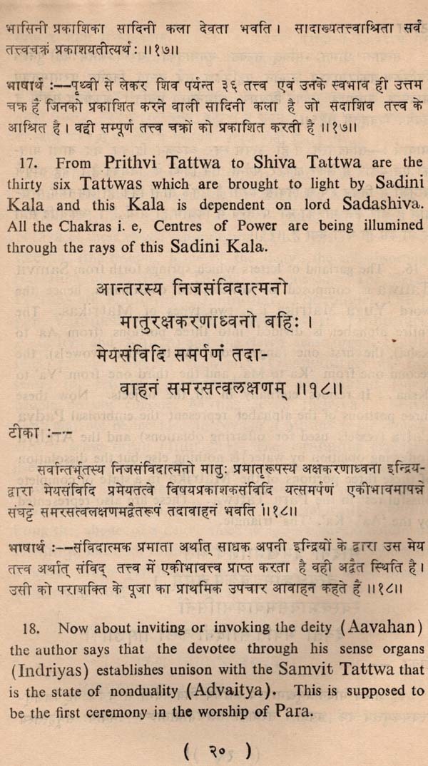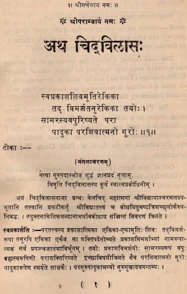 The 38 shlokas contain the complete secret of this type of worship. The principle of Advaita Tattwa which is the theme of this work, is also exhaustively available in a book Vigyan Bhairava, in Anushtup Chanda, by Bhairavacharya Acharya Deshika Pravar, Bhaskar Ray, freely quotes from both these works in his book Nitya Shodashkarnav in the 8th Ullas. Thus it is beyond doubt that these two works Chid-Vilash and Vigyan Bhairava were published before Bhaskar Ray's period. We obtained this work from kumwar Balbir Singh who is a famous poet and a disciple of Maharajji.