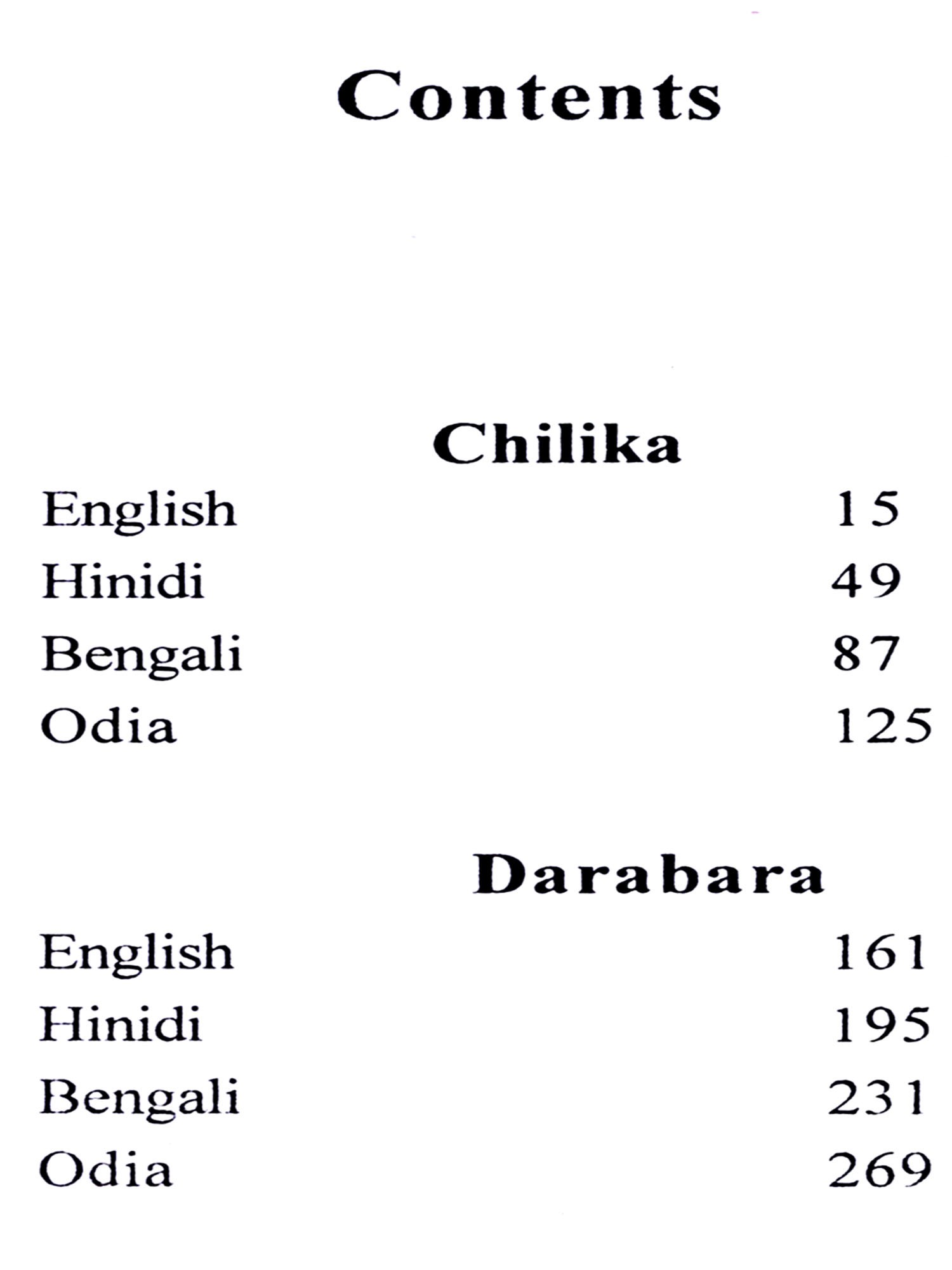 Odisha Sahitya Akademi has taken up translation of classics of Odia literature into English and other Indian languages. Present anthlogy containing two kavyas, Chilika and Durbar, of Radhanath Ray, have been translated into English, Hindi and Bengali.