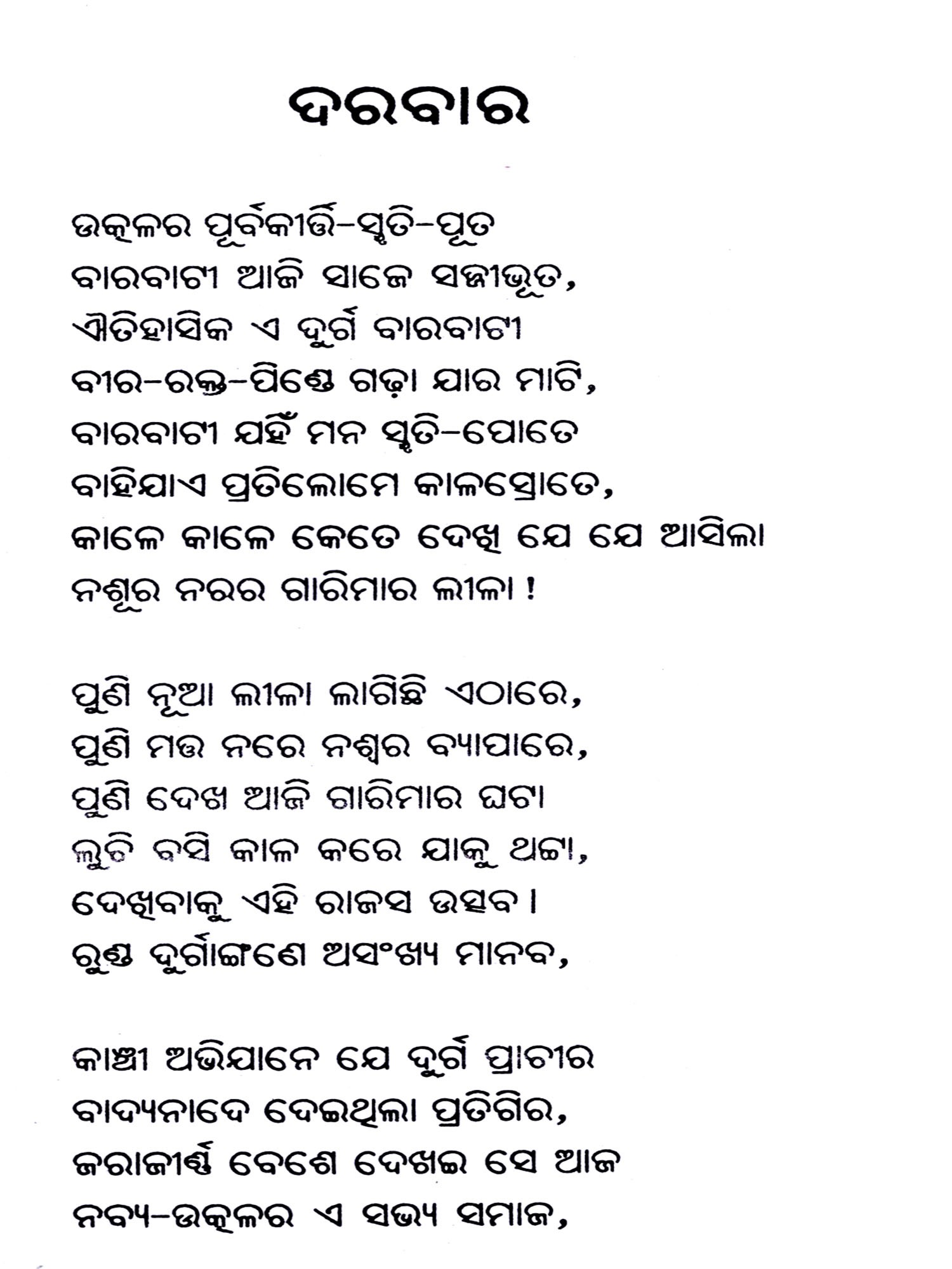 Apart from text books, Radhanath started writing poems, prose and began translting texts from Sanskrit to Odia. At the beginning he wrote in Bengali and subsequently switched over to Odia. He worte nine kavyas starting with Kedar Gouri and ended with the publication of Durbar.