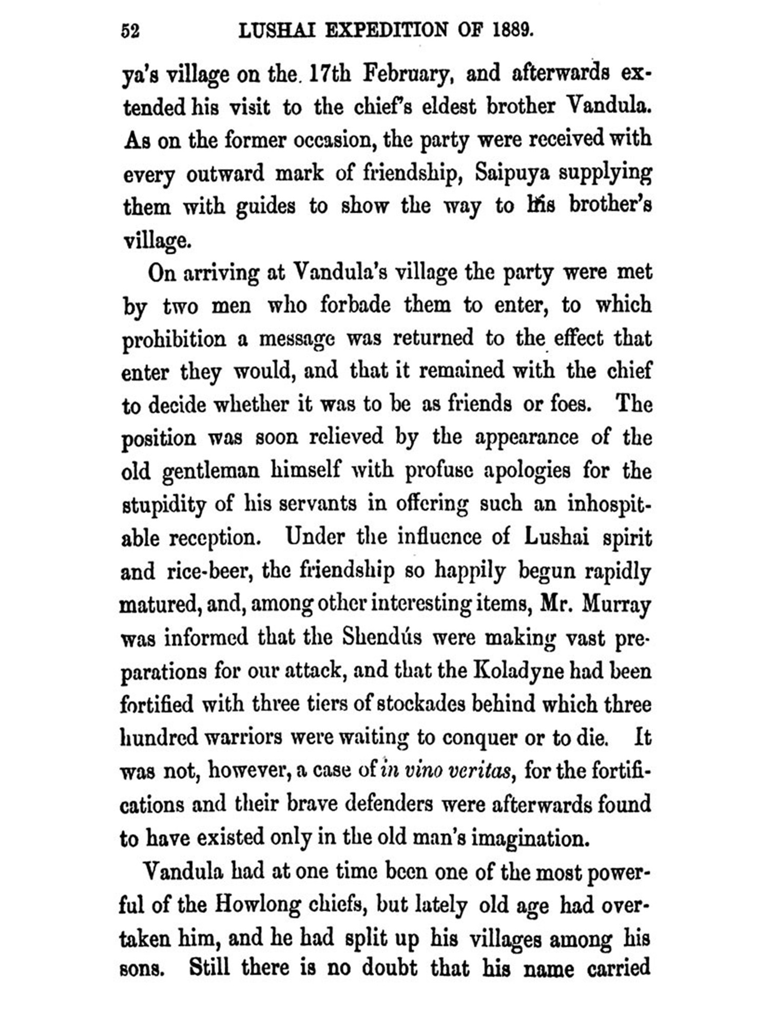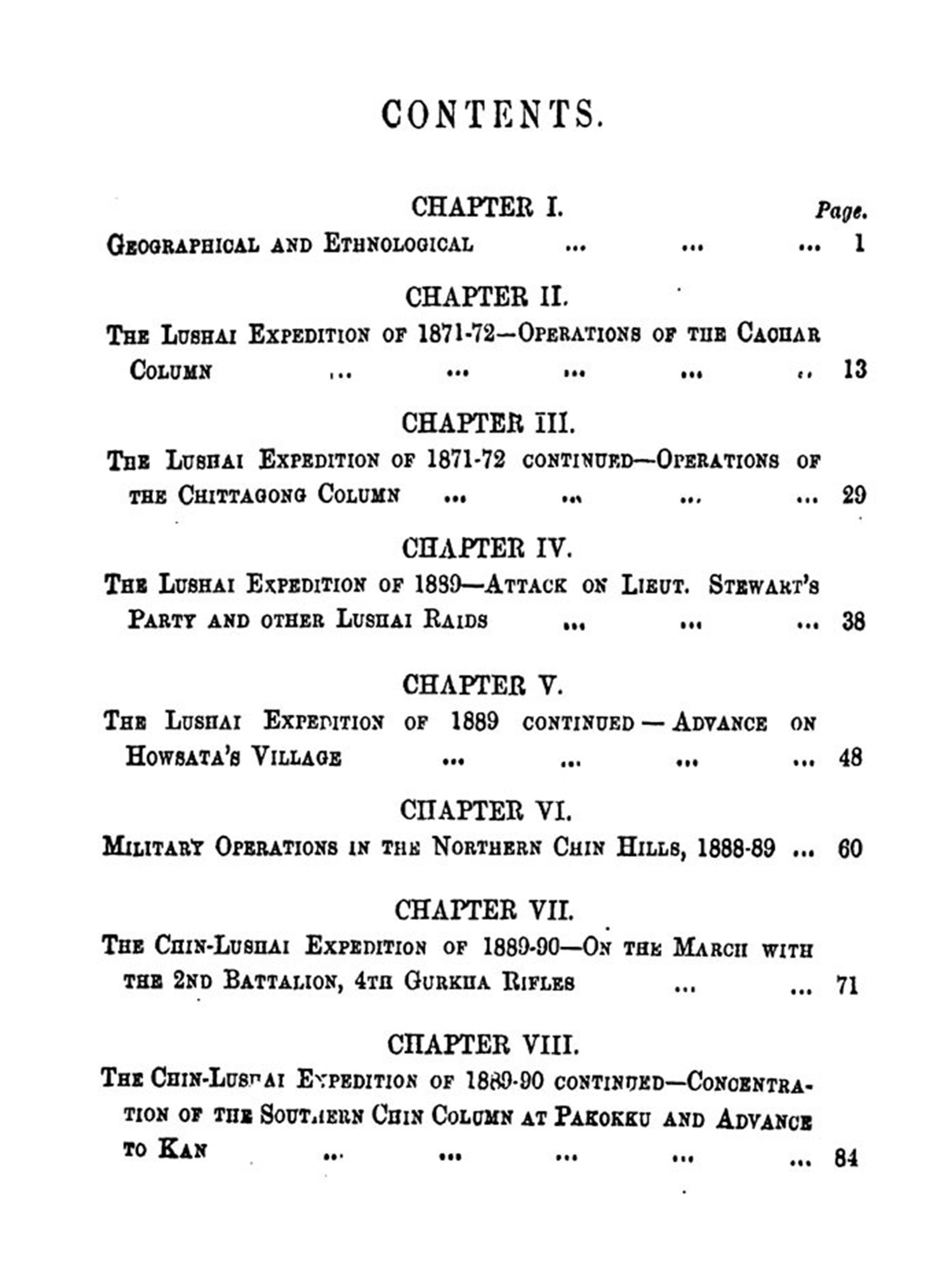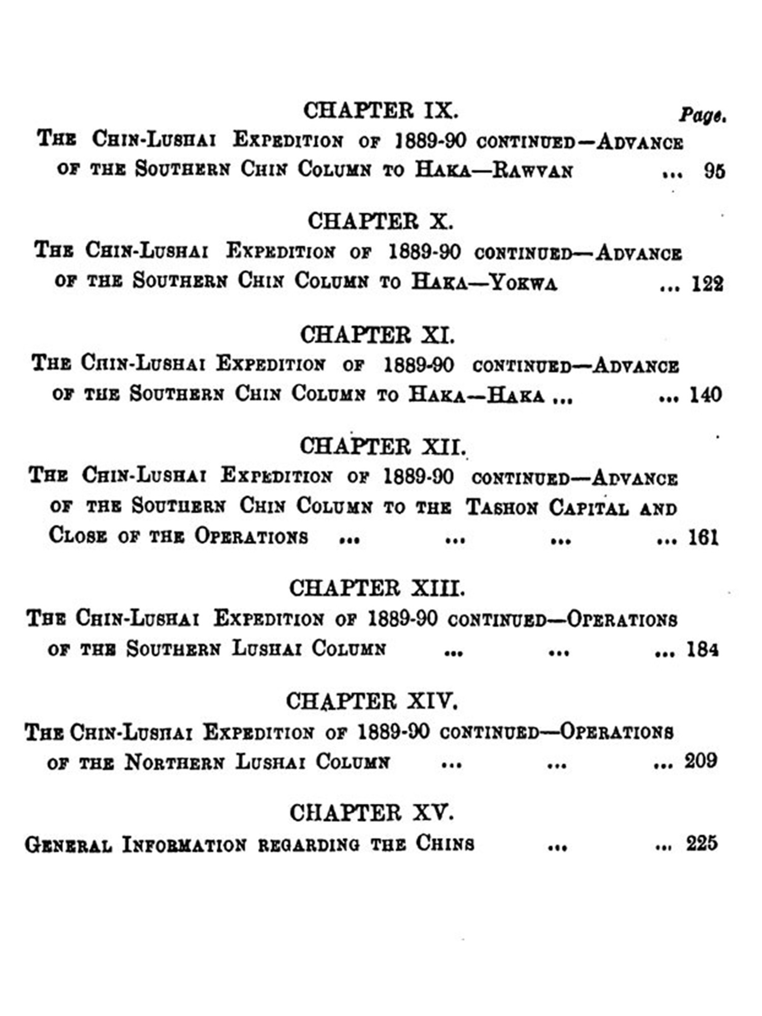 In a campaign or expedition into a new country, it can easily be understood that the matters regarding military operations, political negotiations, or characteristics of the people concerned, which come within the personal observation of a medical officer, must, from the nature of his duties, bé of very limited extent, and that he is usually debarred, by his position, from acquiring an accurate knowledge of the undertaking as a whole. It is therefore almost entirely owing to the kindness of Colonel W. P. Symons, c.B., of the South Wales Borderers, Colonel V. W. Tregear, c.B., of the 9th Bengal Infantry, and Colonel G. J. Skinner, D.S.O., of the 3rd Bengal Infantry, who commanded the Chin Force, Lushai Force, and Northern Column of the latter respectively in the expedition of 1889-90, and who placed the information in their possession at my disposal, as well as to that of Mr. G. M. Chesney, Editor of the Allahabad Pioneer, who allowed me to search the files of his paper for former re-cords of the Chin-Lushai Country, that I am enabled to place the following volume before the public. I have also to thank Colonel R. M. Clifford, 1.S.C., Lieutenant E. W. M. Norie, Intelligence Officer, Lieutenant M. E. Wil-loughby, 2nd Bengal Laneers, and Surgeon-Captain A. G. E. Newland, of the Indian Medical Service, for generously furnish-ing me with information, etchings and photographs.