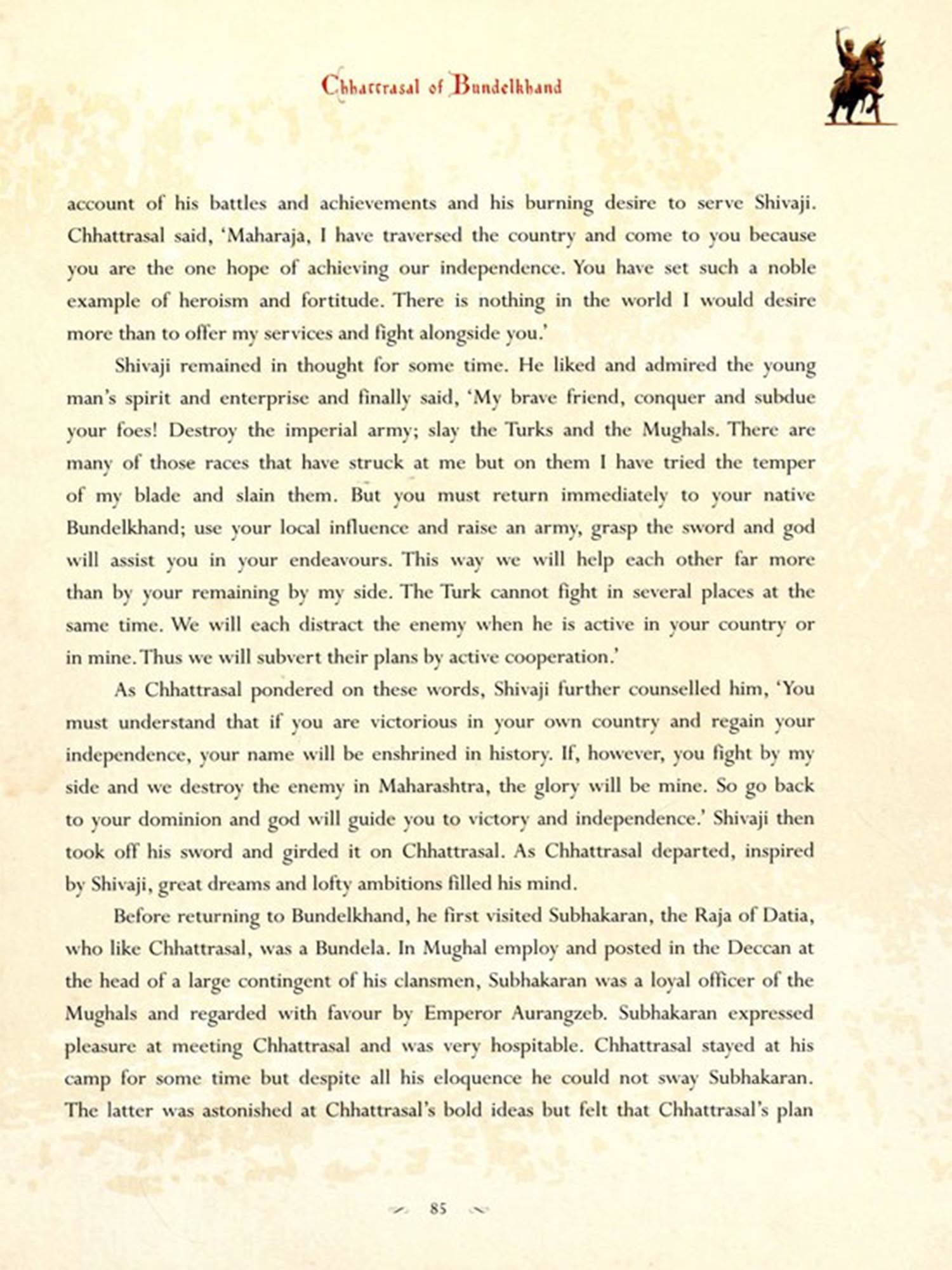 This collection of stories ranges from prehistoric times to as recently as the last century. Those of ancient times are based more on bardic legends, but as we progress in time, there is greater historic fidelity of events. These accounts are not arranged in a chronological order as each has a flavour independent of the other. The common link however is that they are all based on dramatic events of history or on epic poems of great bards like Chand Bardai, Lal Kavi, Sukhdharma and others. Some however are sourced from a combination of both history and bardic legends. The markers of history are kept in mind even when these accounts are enlivened by bardic poems. The discovery of historical facts is scientific in method. But history tends to be dry, unless it is embellished and supported by great literature. On the other hand ballads can be soul stirring and bring tears to your eyes, which history seldom does. Bards were attached to the courts of Indian kings. In Rajasthan, Bundelkhand and Saurashtra, bards were even considered a sacred order and as hereditary guardians of history and pedigree. They were treated with great respect by the kings and were esteemed higher than Brahmins. As Colonel Tod says in his Annals and Antiquities of Rajasthan, "The Rajput attends more to the martial song of the bard than to the litany of the Brahmin. In some states rulers used to rise when one of their order entered or left an assembly. Bards often accompanied kings during wars and thus their reporting was first hand. Bards have been called 'the historians of mankind". They are essentially historians, genealogists and reciters of warlike poetry. Much would have been lost but for the bards and charuns whose epics are passed down from generation to generation. Thus traditions have been kept alive.