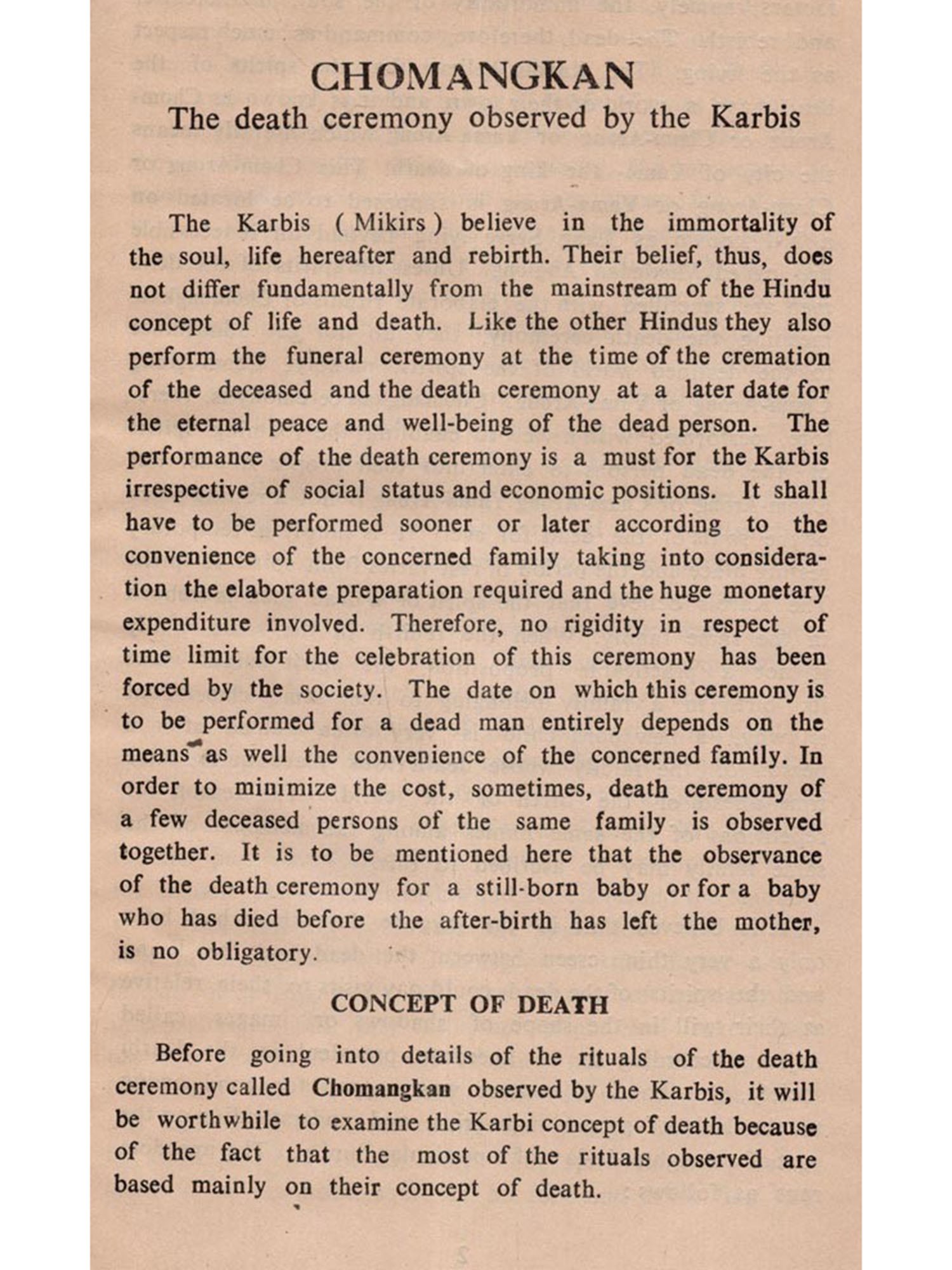 The Karbis, who were still recently known as the Mikirs, are a major hill tribe of Assam. They also call themselves Arleng which mean a man. Although they are found to inhabit mainly the Karbi Anglong District of Assam, some scattered Karbi inhabitated pockets are found in the North Cachar Hills, Sibsagar, Nowgong and Darrang Districts. Racially the Karbis belong to the Mongoloid group, while linguistically they belong to the Tibeto Burman Group.