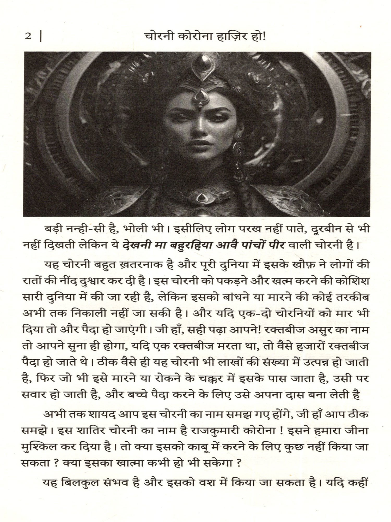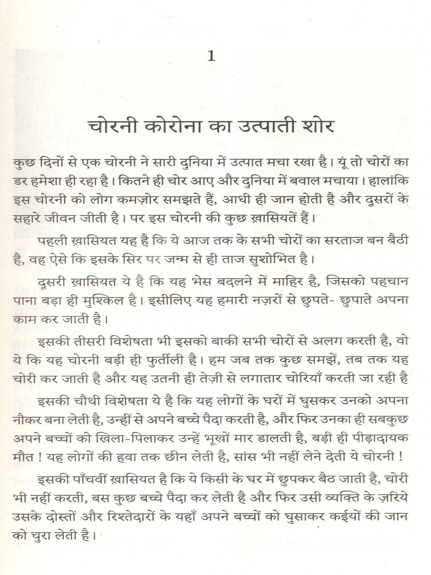 साहित्य भूत और भविष्य को समेट एक नए भाव को व्यक्त करता है, जो कि मनोरंजक हो जाता है, बल्कि ज्ञान की सीमा को परछाई बनाकर भविष्य का आभास कराता है। प्रस्तुत पुस्तक "चोरनी कोरोना हाज़िर हो" में हमने इन्हीं सारी बातों पर विचार करने का प्रयास किया है। चोरनी इसलिए नहीं कि उसने करोड़ों जान असमय चुरा लिया, बल्कि समाज के बहुत सारे रीति-रिवाज, साज-सम्बन्ध, व्यवसाय-व्यापार, और स्थिति-परिस्थिति को उथल पुथल करके छोड़ा है।
