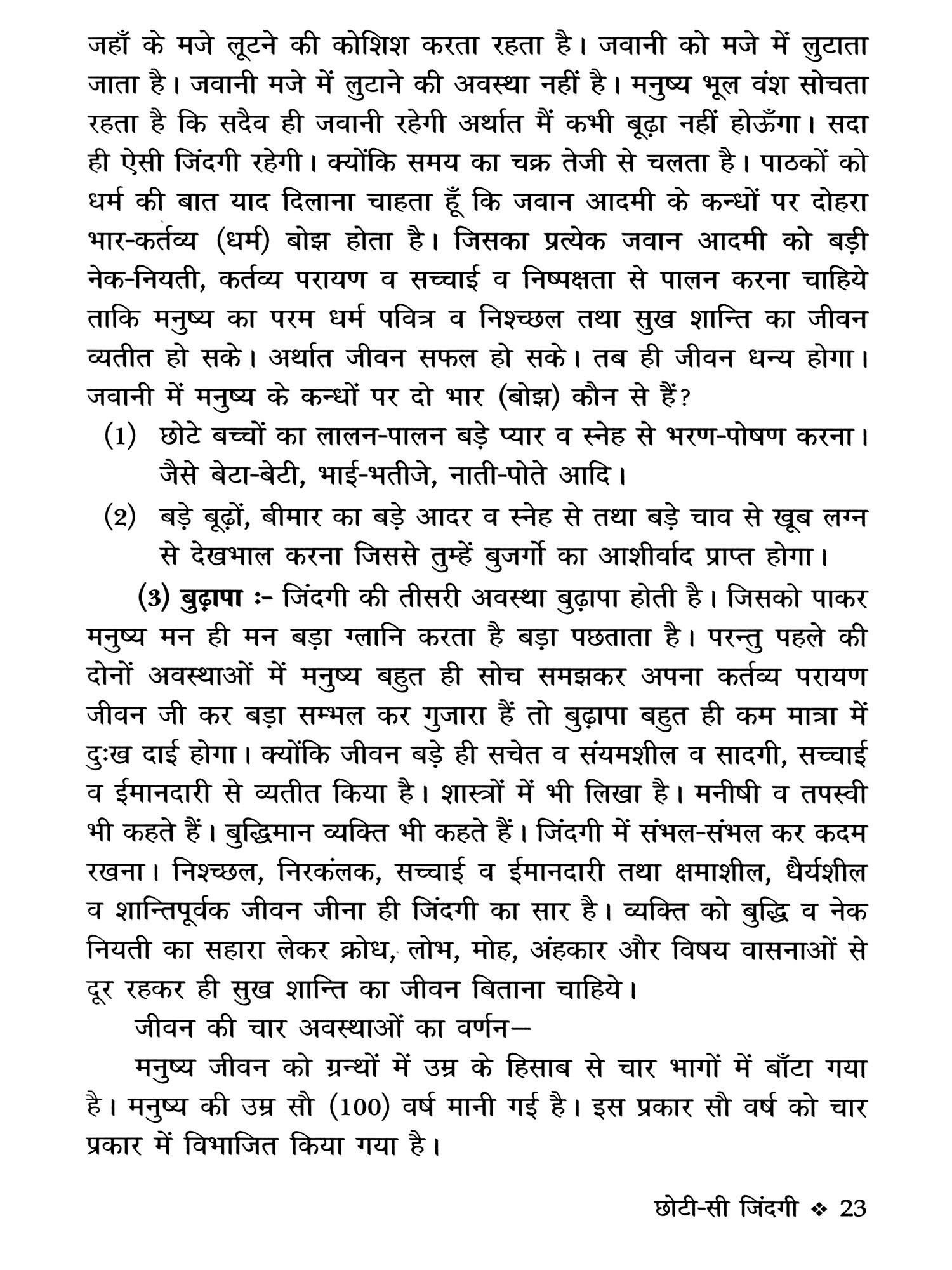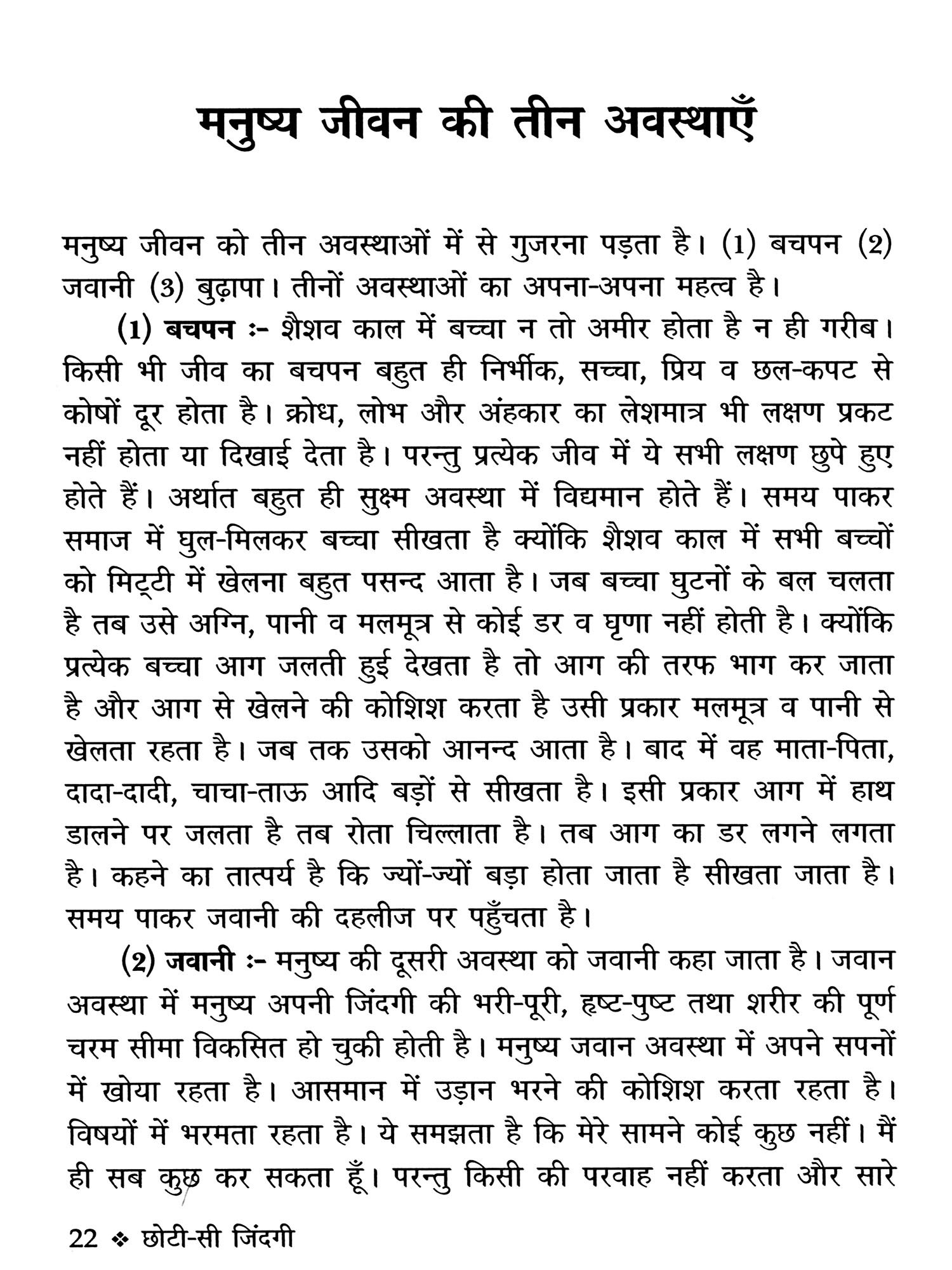 मनुष्य की जिंदगी को सौ (100) वर्ष की माना गया है। किसी-किसी विद्धान ने मनुष्य की जिंदगी को तीन भागो में विभाजित करके बाँटा गया है। बचपन, जवानी और बुढ़ापा।
