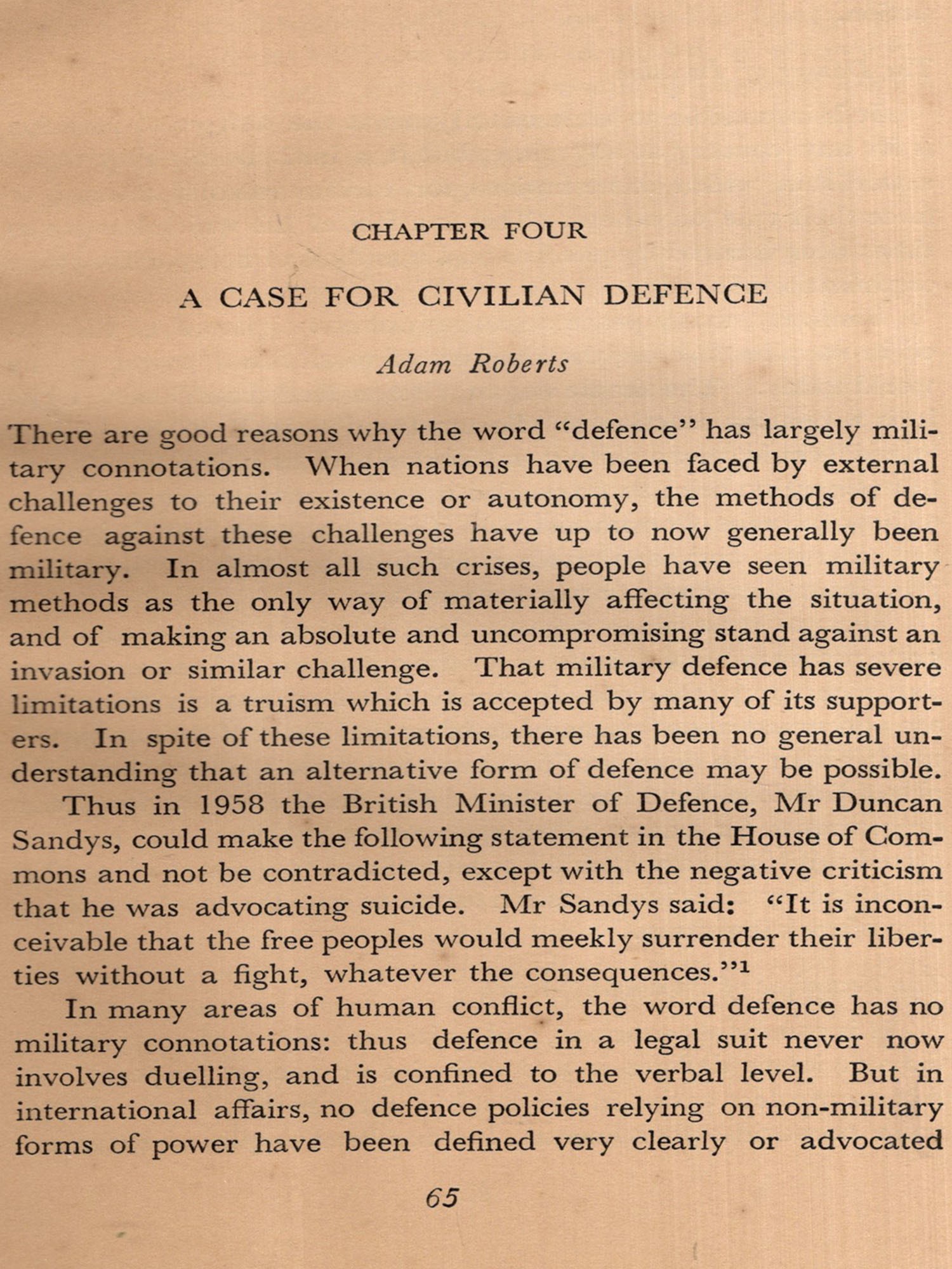 I have deliberately grounded the case for this valuable collection of essays on a pragmatic basis-rather than arguing that non-violent defence is inherently better or more noble than the resort to violence for that is what the authors themselves have done. As Adam Roberts expresses it, "All the authors of this book con-sider that nonviolent action should be judged, not in terms of a doctrine which one may accept or reject, but as a technique, the potentialities of which in particular situations demand the most rigorous and careful study."