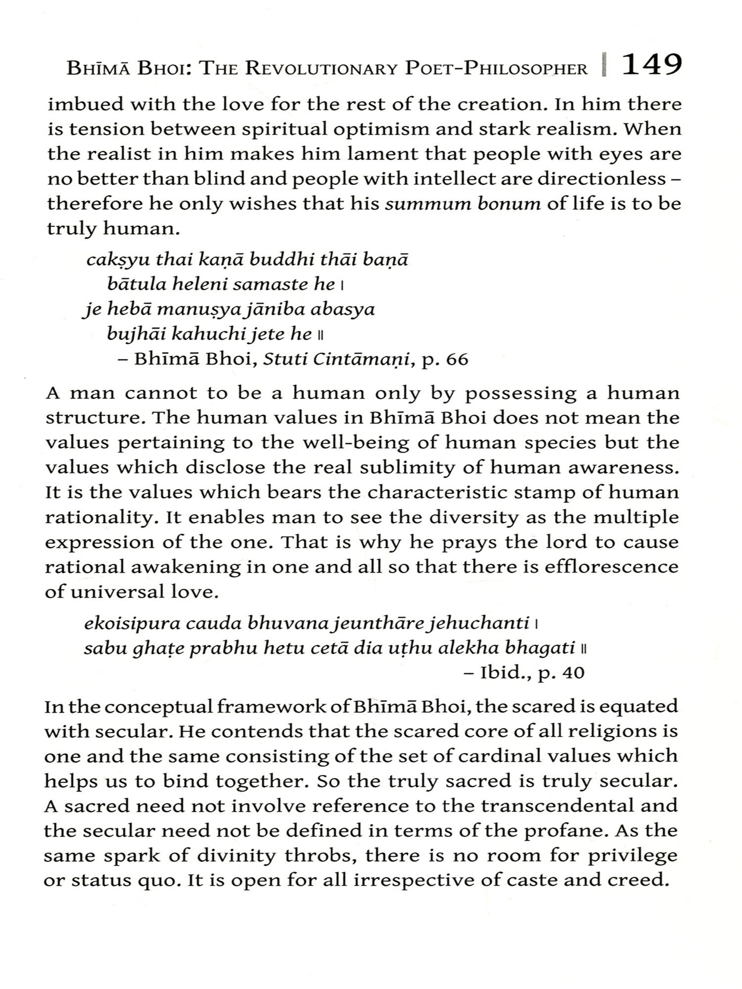 Indian religious and philosophical traditions are holistic. This is due to the accommodability in the understanding of various viewpoints ranging from polytheism, monotheism, pantheism, monism, and so on. Where there is no conception of God, the same place is given to a universal and objective truth and power. The Indic religions are neither God-centric nor man-centric, but holistic. Religious or divine knowledge is given importance in life as a source of understanding the very purpose of life and its relationship with the whole universe. It is only in this understanding or knowledge wherein the purpose of life is also fulfilled along with others; there is no purpose of God to be fulfilled as He is the ultimate and a complete whole. This includes a moderate man-centricity within the holistic spiritual achievements. God is not there at the centre of religion and religious beliefs, unlike in the Medieval West.