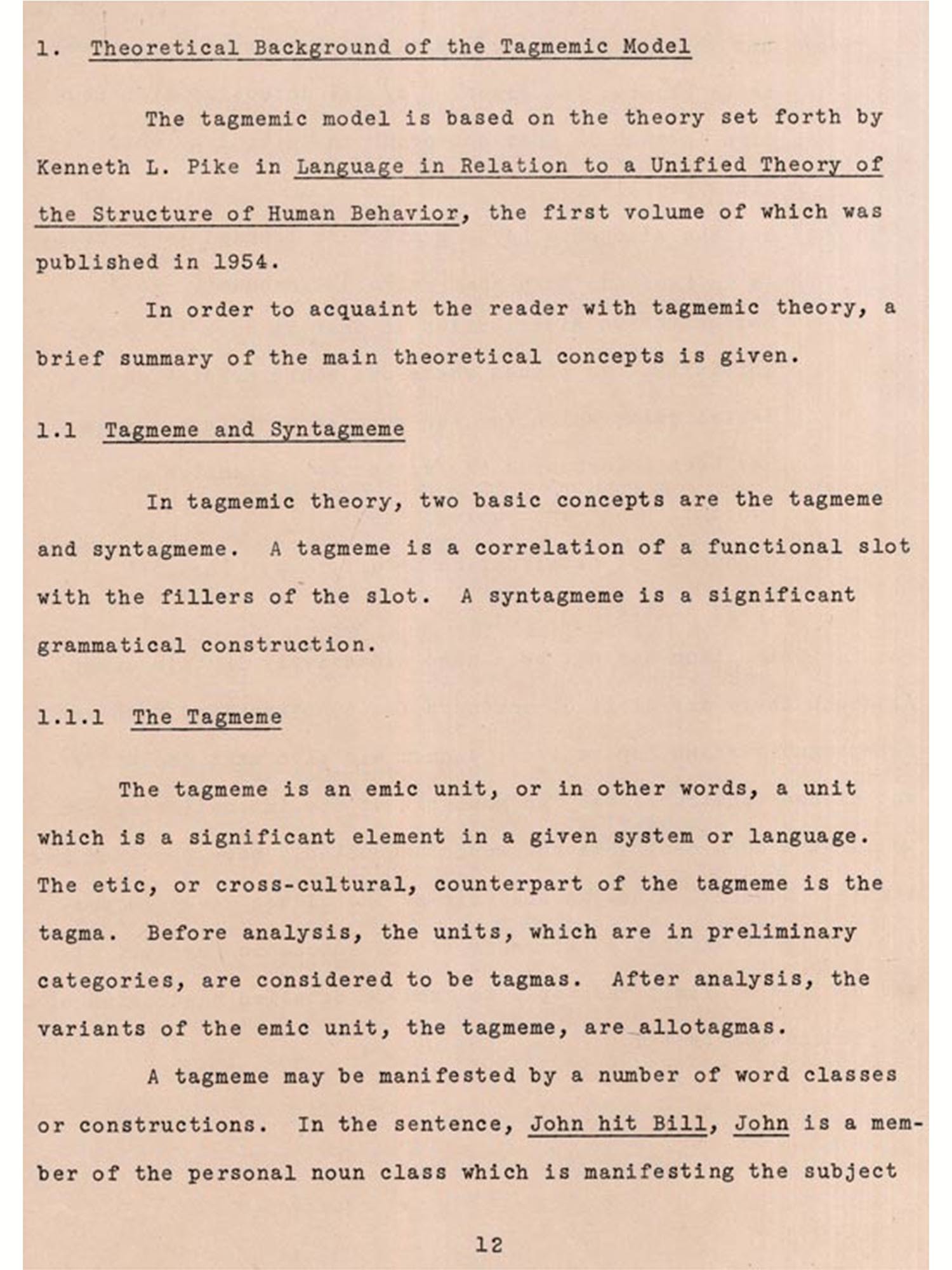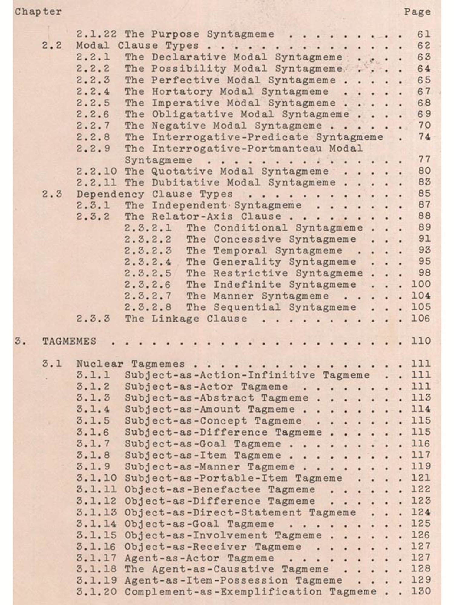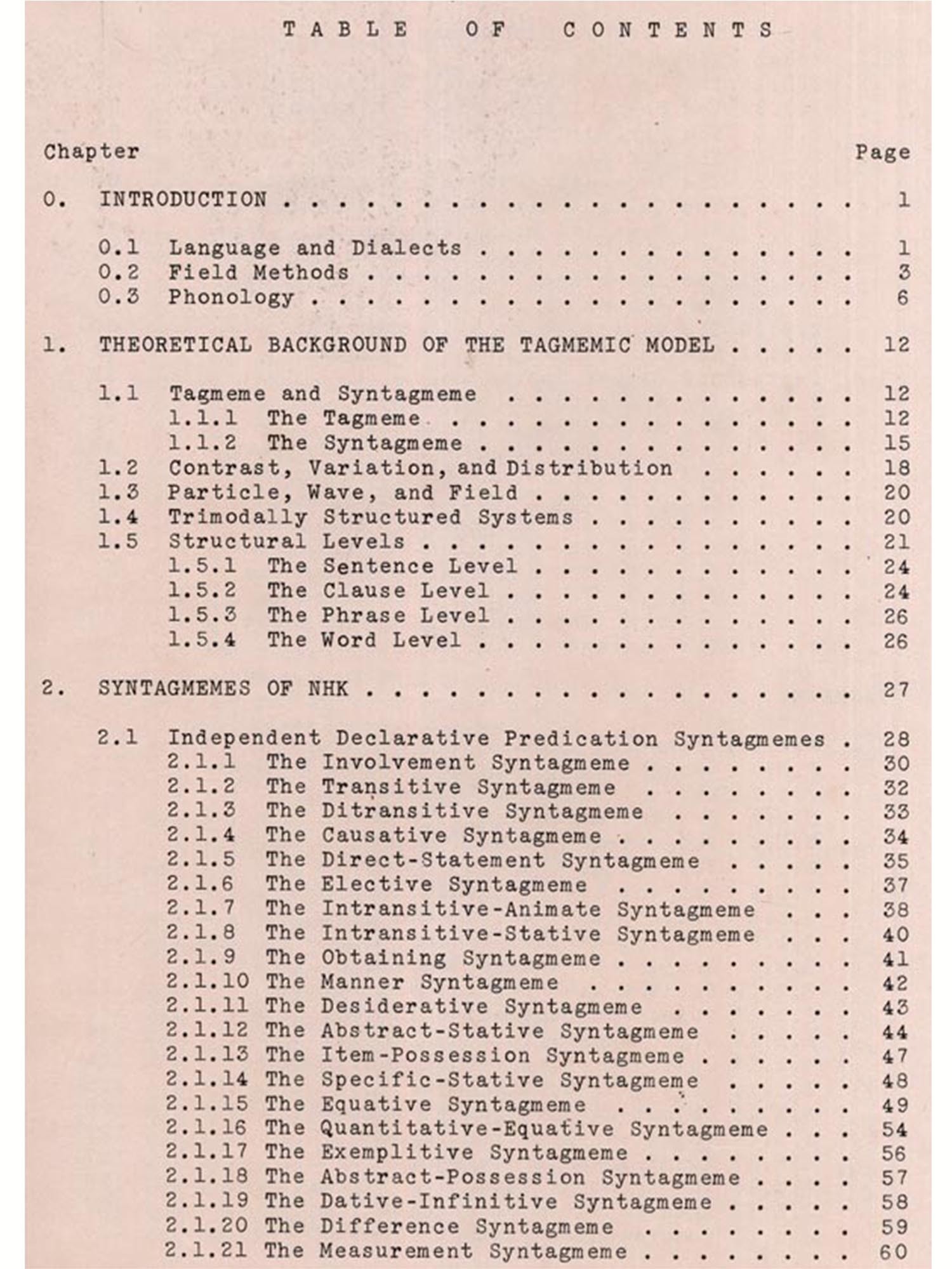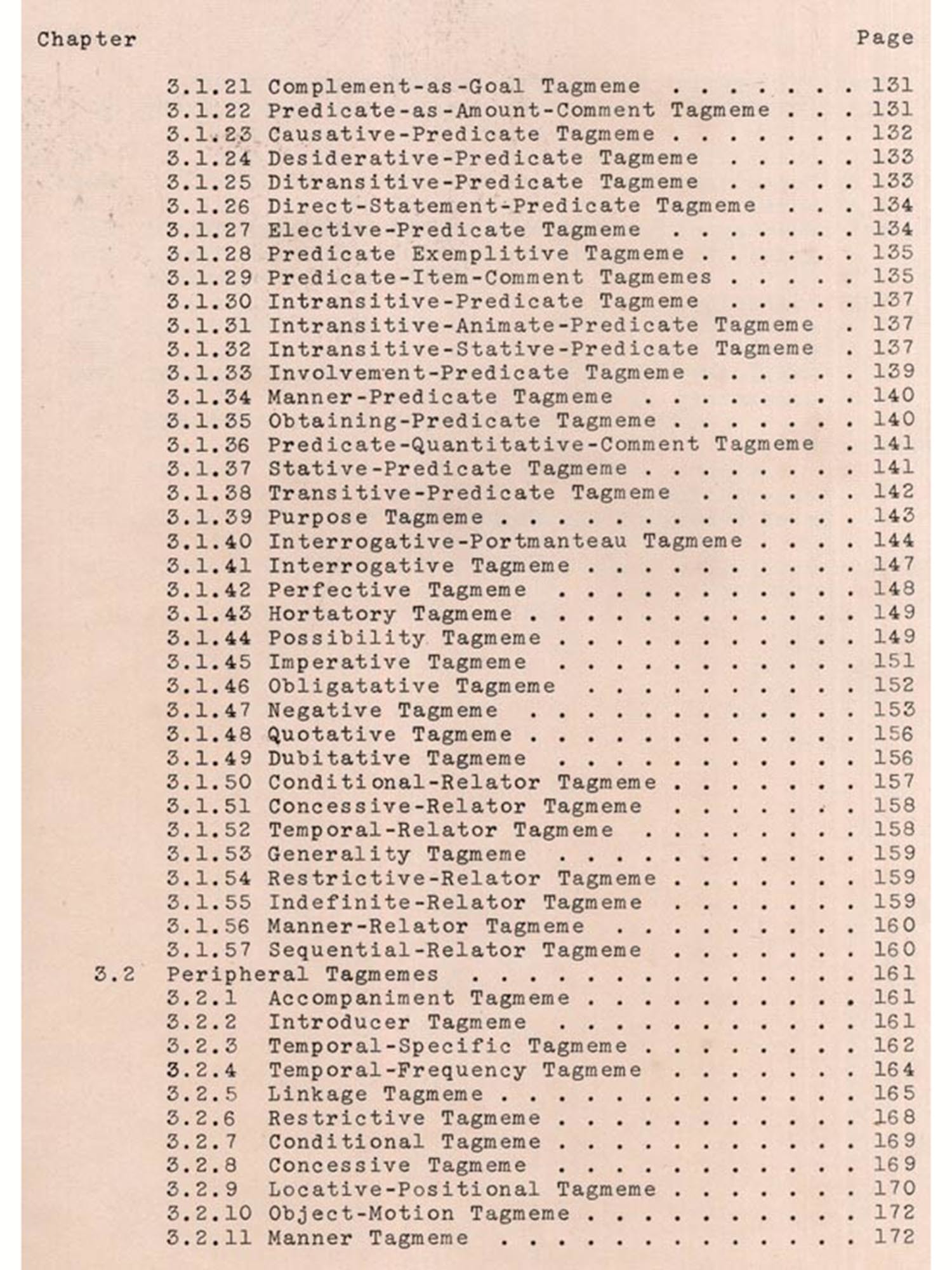 In the application of the tagmemic model to the data I have appreciated the counsel of Professor Pike. Finally, I wish to express gratitude to Professor Chavarria-Aguilar, Professor Gedney and Professor Paper for their comments on this monograph.