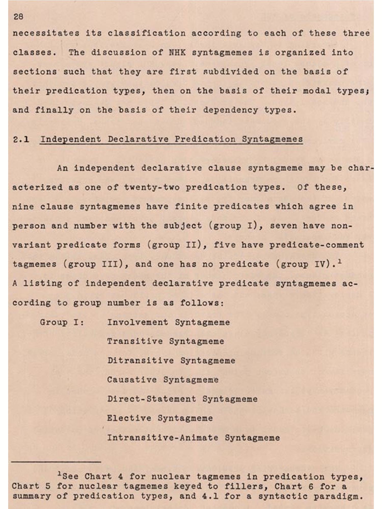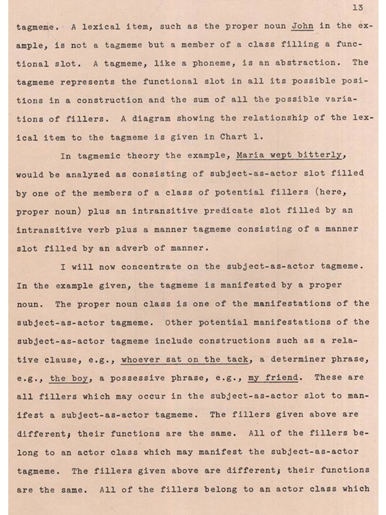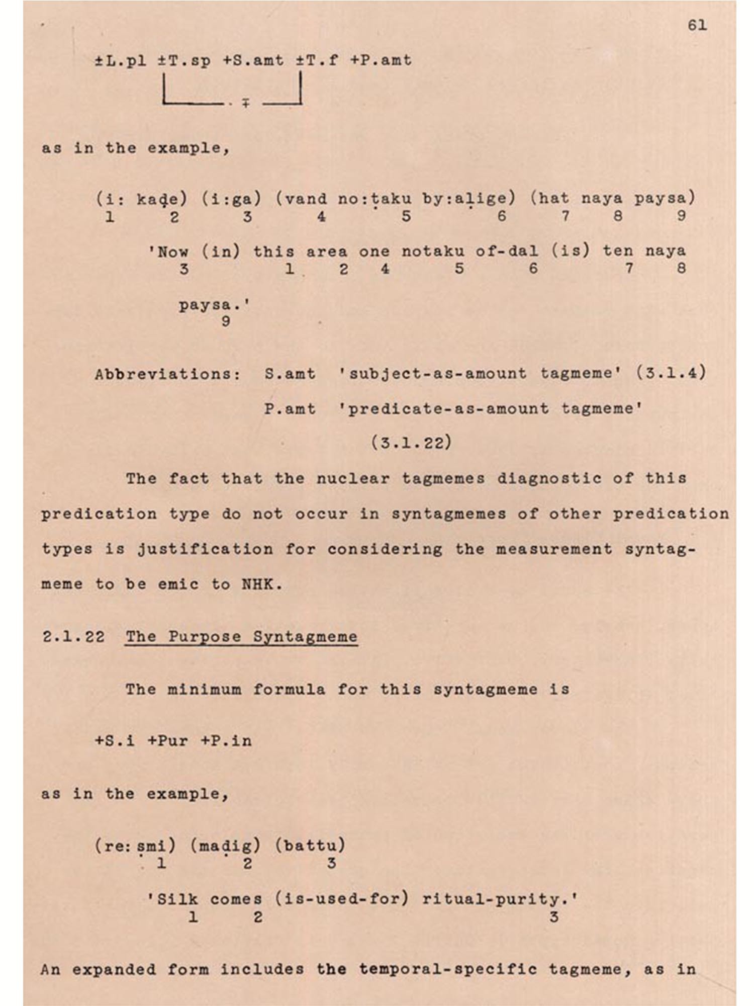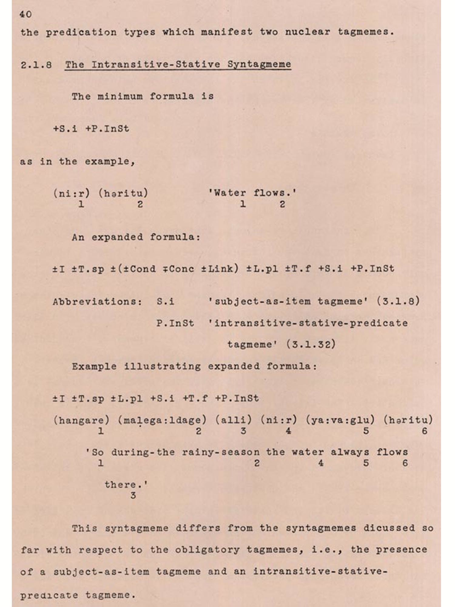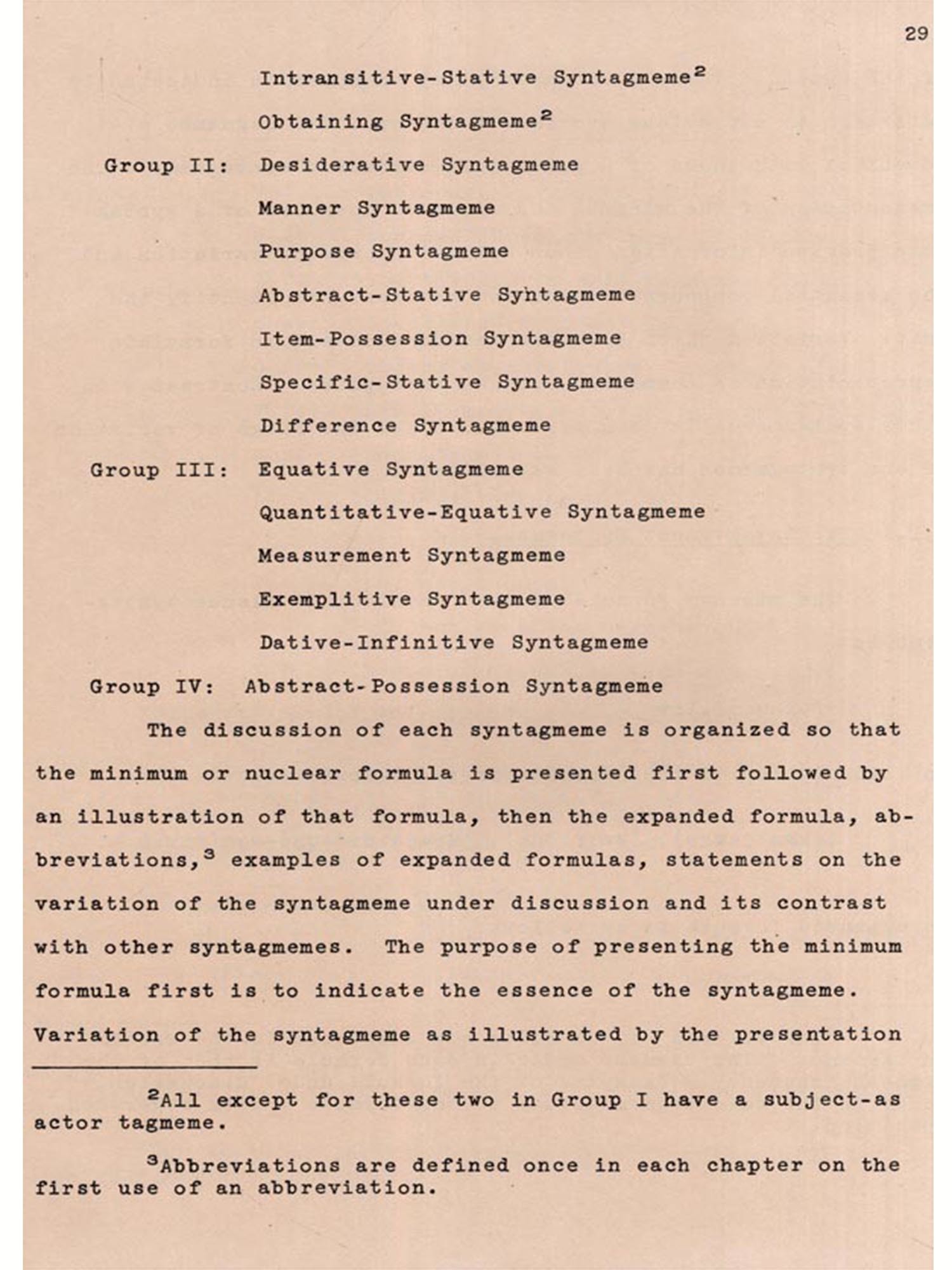 In the application of the tagmemic model to the data I have appreciated the counsel of Professor Pike. Finally, I wish to express gratitude to Professor Chavarria-Aguilar, Professor Gedney and Professor Paper for their comments on this monograph.