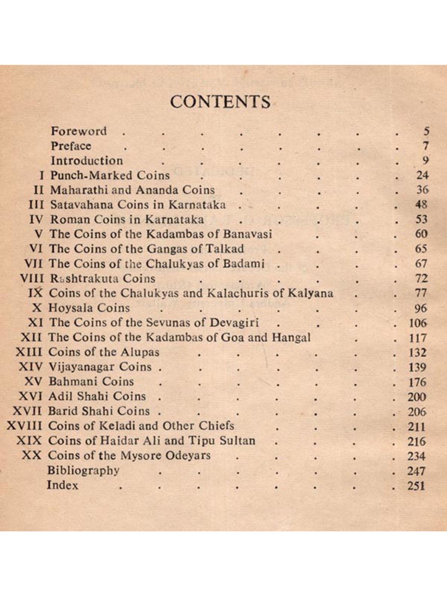 The present work contains twenty chapters. Each chapter is devoted to the study of the coinage of a major dynasty which ruled Karnataka. The period covered is from the early times to the modern period. As far as possible, coins have been illustrated by line-drawings.