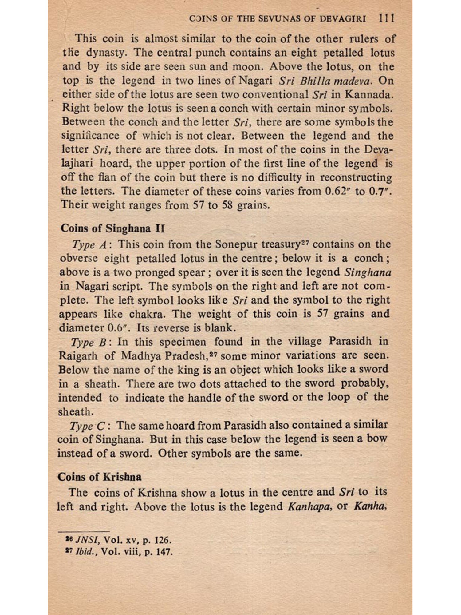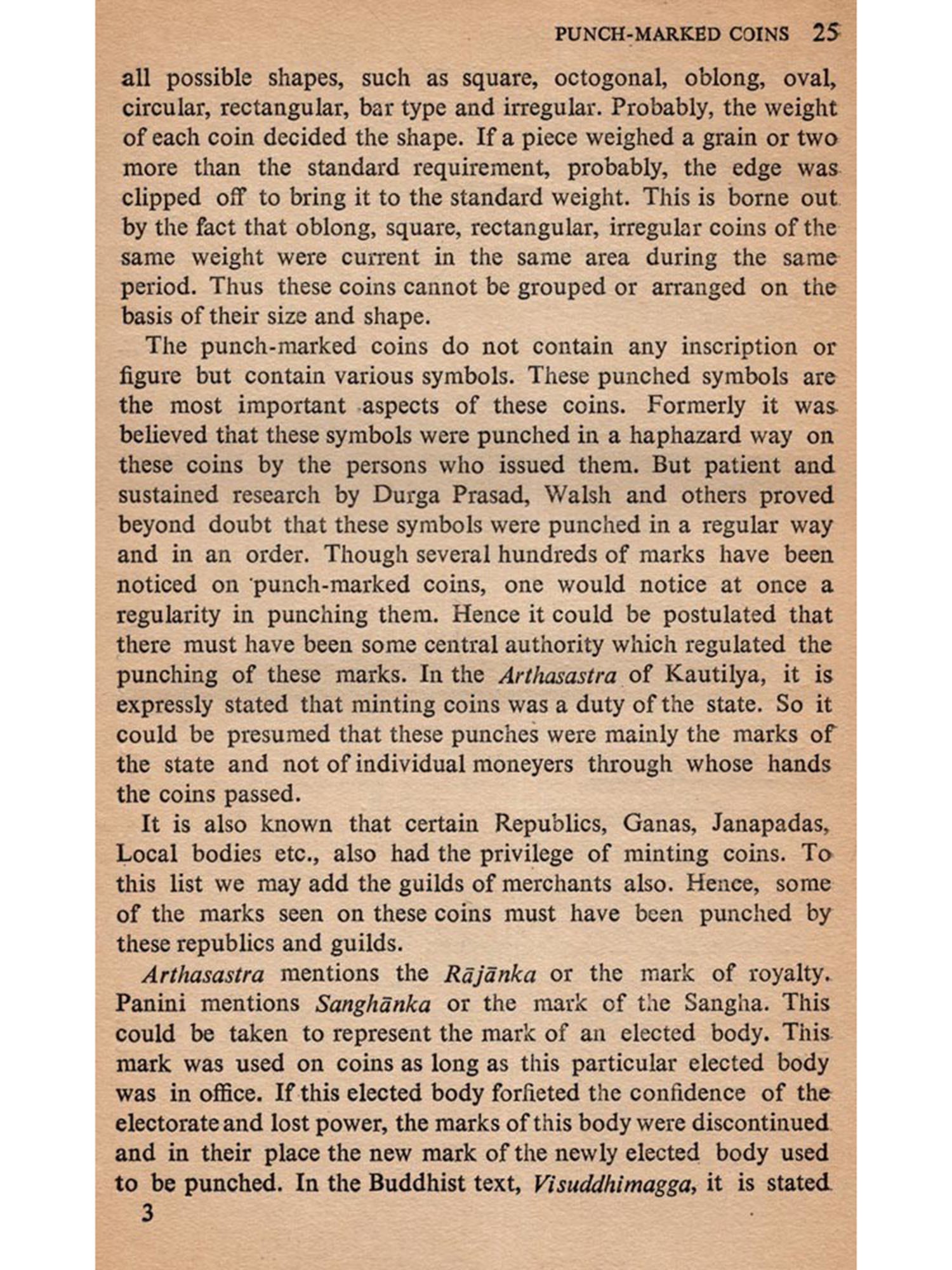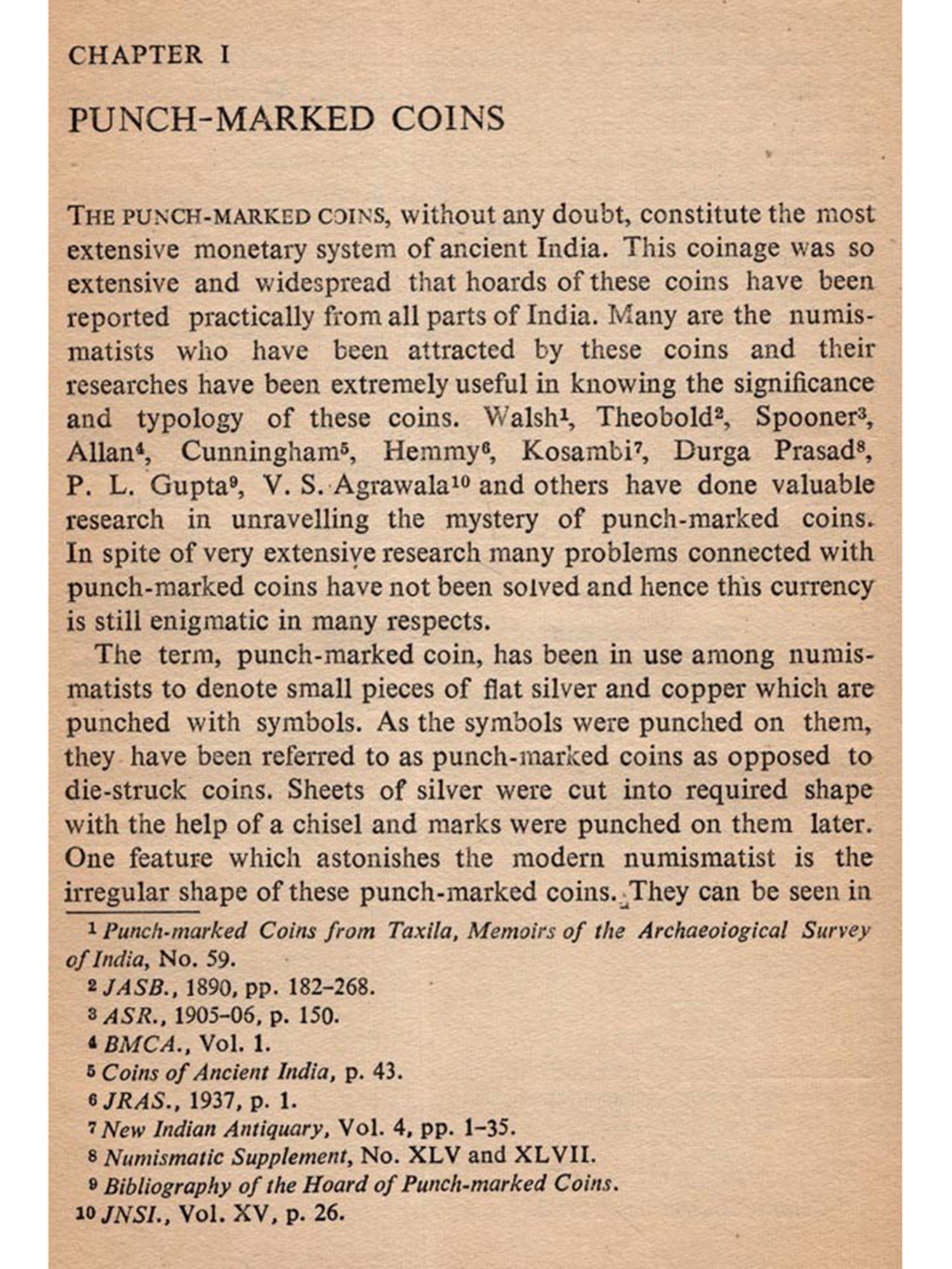 THE STUDY OF INDIAN COINS has not attracted the attention of scholars to the same extent as Indian epigraphy, art and sculpture, ancient Indian history and architecture. In spite of the Treasure Trove Act of 1878 generally coins of precious metals are melted by ignorant and unscrupulous people for the value of precious metal in them. This tendency, very common in our villages, has done great harm to Indian numismatics in particular and ancient Indian history in general. Even when the coins come to the notice of the authorities, the administrative and procedural delays do not allow the coins to come to the notice of scholars interested in numismatics. Thus thousands of coins are lying unidentified and uncared for in many parts of the country. In spite of these dis-advantages great scholars like Rapson, Smith, Elliott, Tufnell, Altekar, Allan, Vidyaprakash, Brown, Krishna, Gupta and others have enriched the numismatic history of India by their contributions.