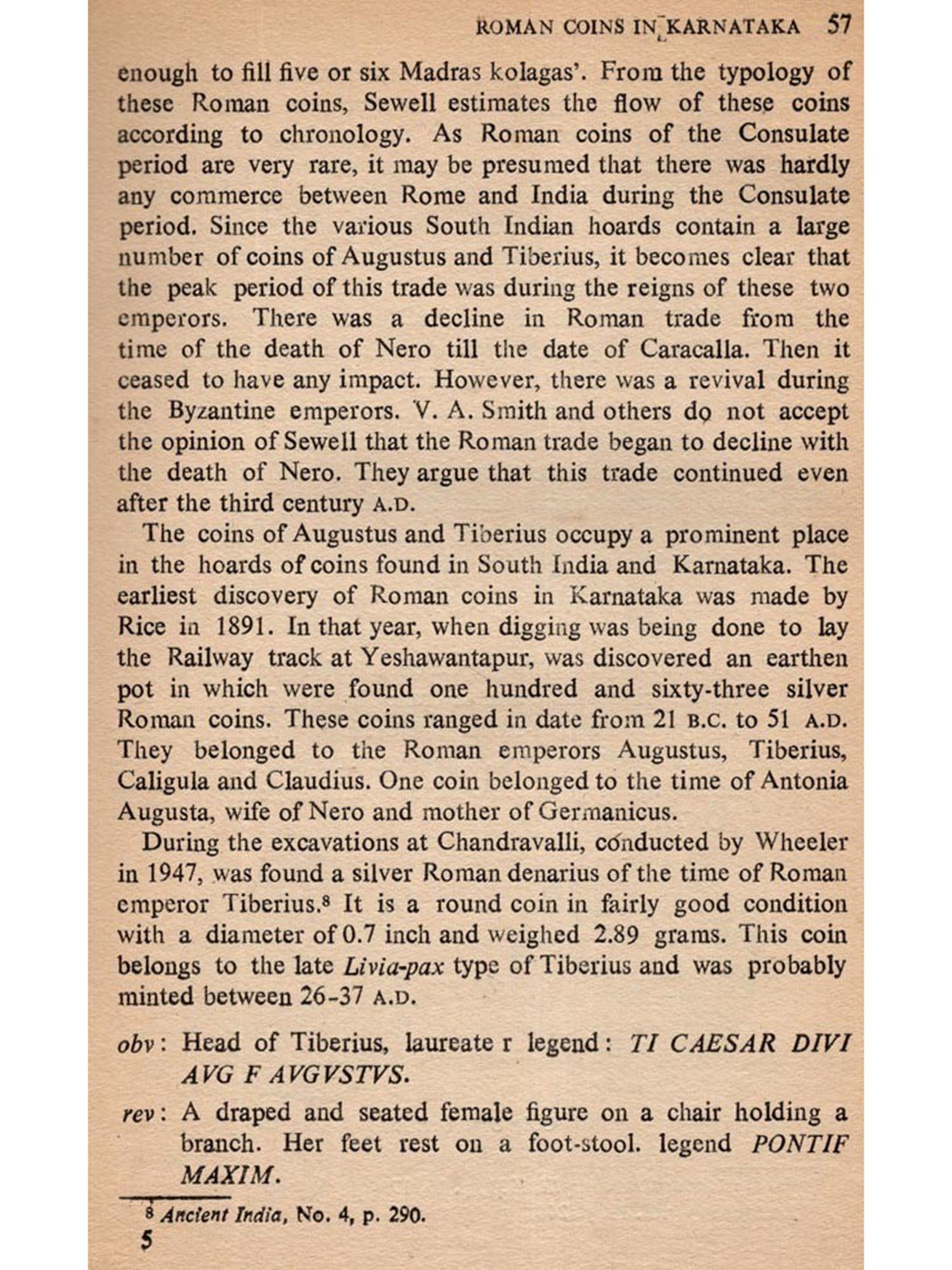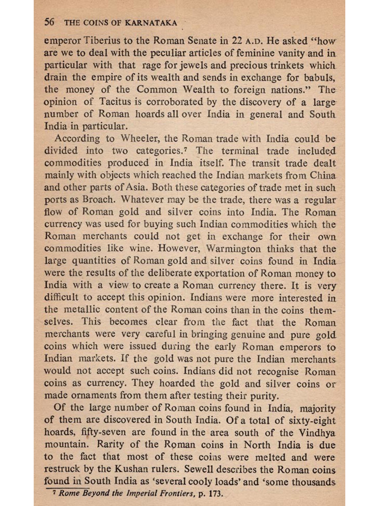 Edgar Thurston published a catalogue of coins belonging to Mysore State, which were in the showcases of the Madras Government Museum. This publication of 1888, though useful in many ways, is confined only to the coin collections in the Museum-Next year, i.e. 1889, under the instructions of the Government of the Maharaja of Mysore, R. H. C. Tufnell compiled and published a catalogue of Mysore coins in the collection of the Government Museum, Bangalore. As a catalogue of a museum collection, this work also has certain limitations, and gives only a partial picture. The discovery of Roman coins in Bangalore heralded a new era in the interpretation of the early history of Karnataka. B. L. Rice, promptly, made a study of these coins and brought out their significance. This work of Rice, published in 1891, showed the interest of Rice in numismatics also.